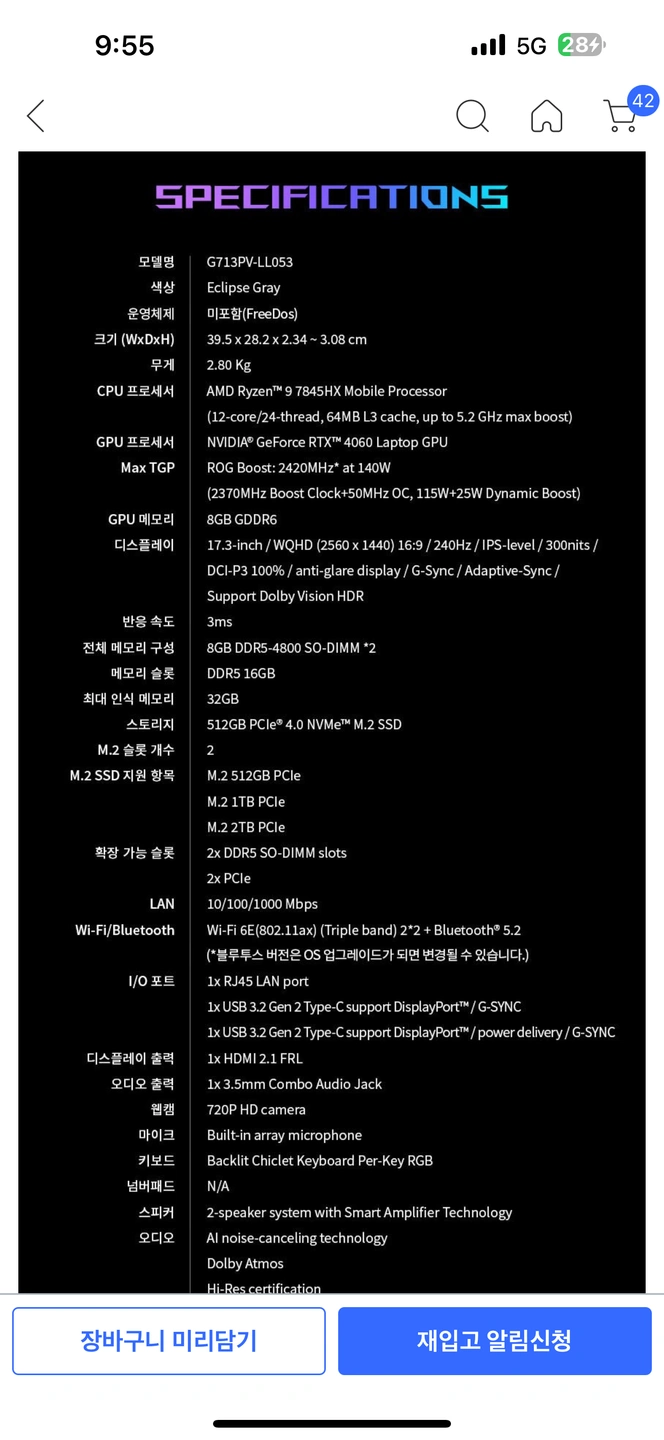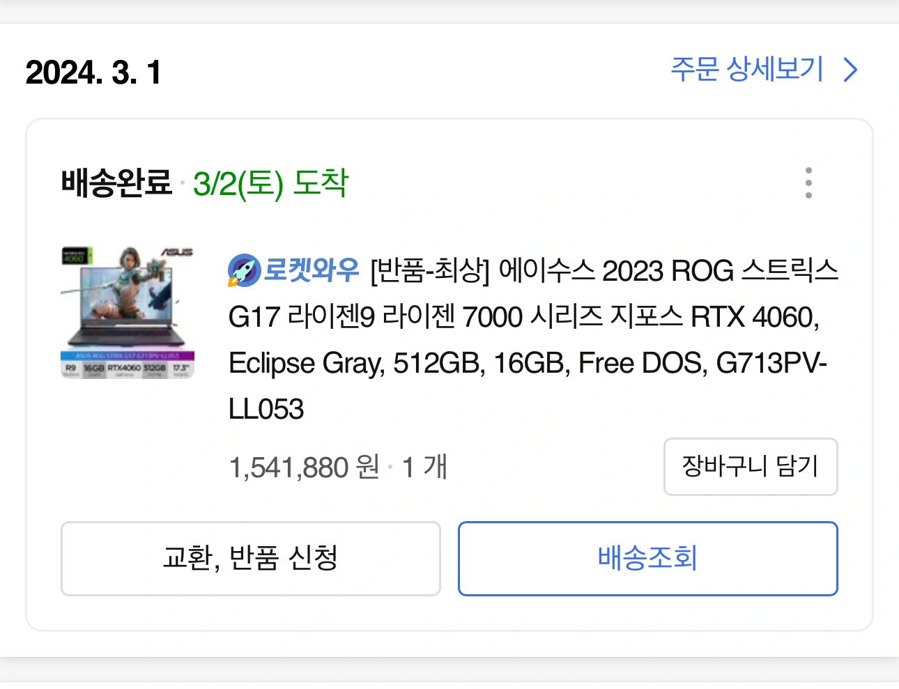 7845hx RTX4060 미개봉 게이밍 노트북 팝니다. 쿠팡에서 반품 최상 상품 구매했는데 급전이 필요해서 내놓습니다. 박스도 개봉안한 미개봉 상품입니다. 나름 고가라 직거래만 가능합니다. 중고거래 특성상 교환 환불 불가한점 양해바랍니다. 스텐레스 거치대도 같이 드리겠습니다. 쿠팡을 추천합니다! 에이수스 2023 ROG 스트릭스 G17 https://link.coupang.com/a/bwt001