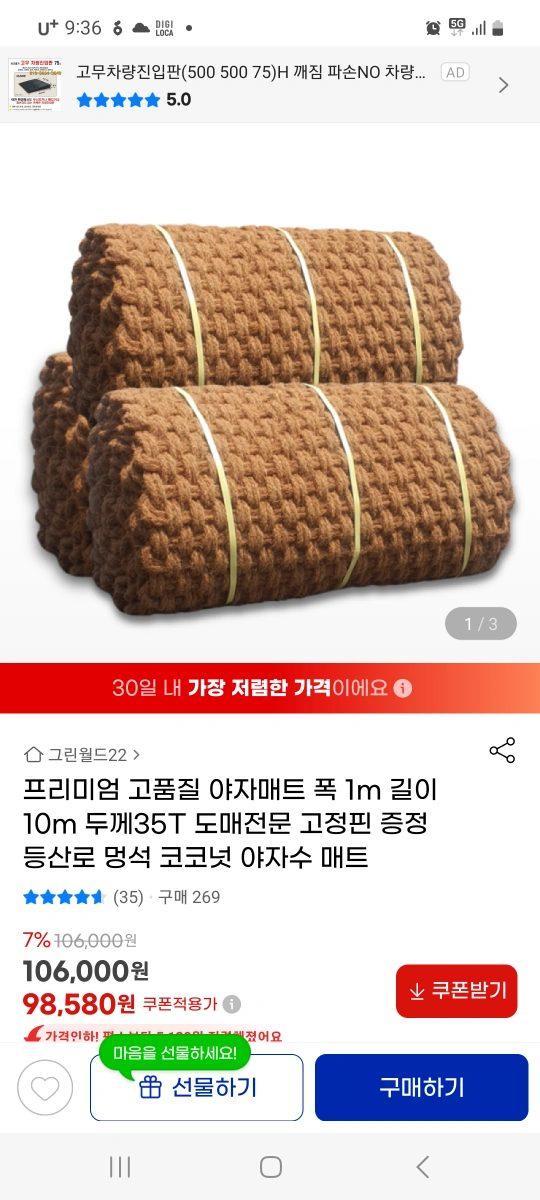 한번 사용한 야자매트 입니다 폭1m 길이는10m정도 두께는3.5cm 무겁습니다