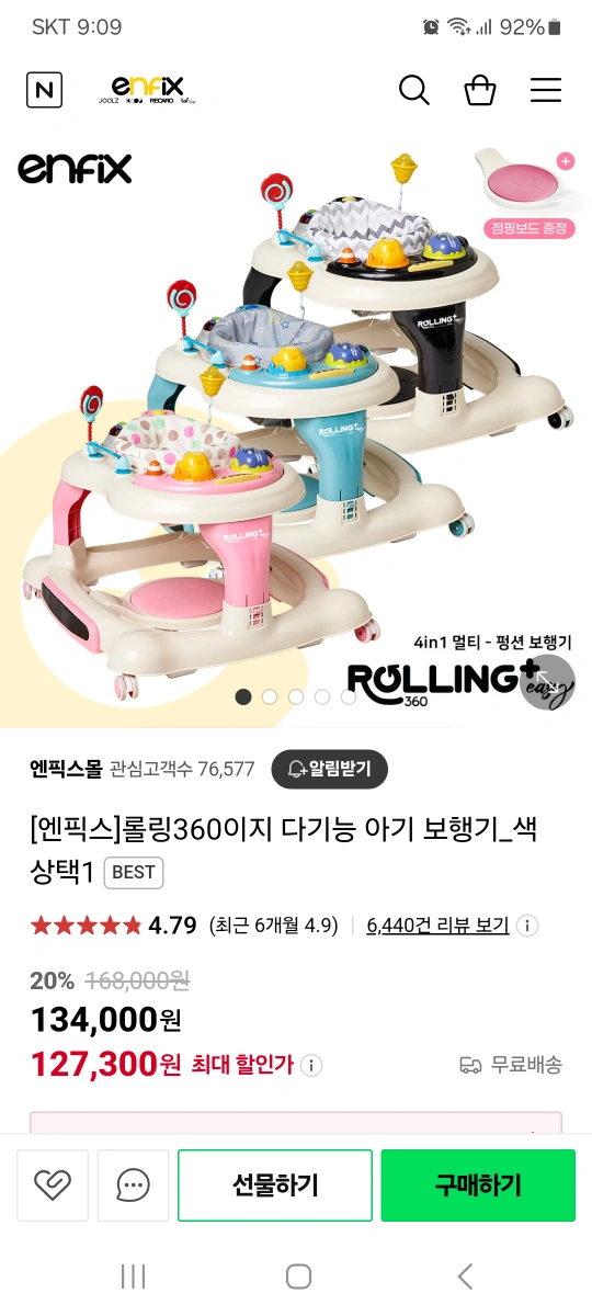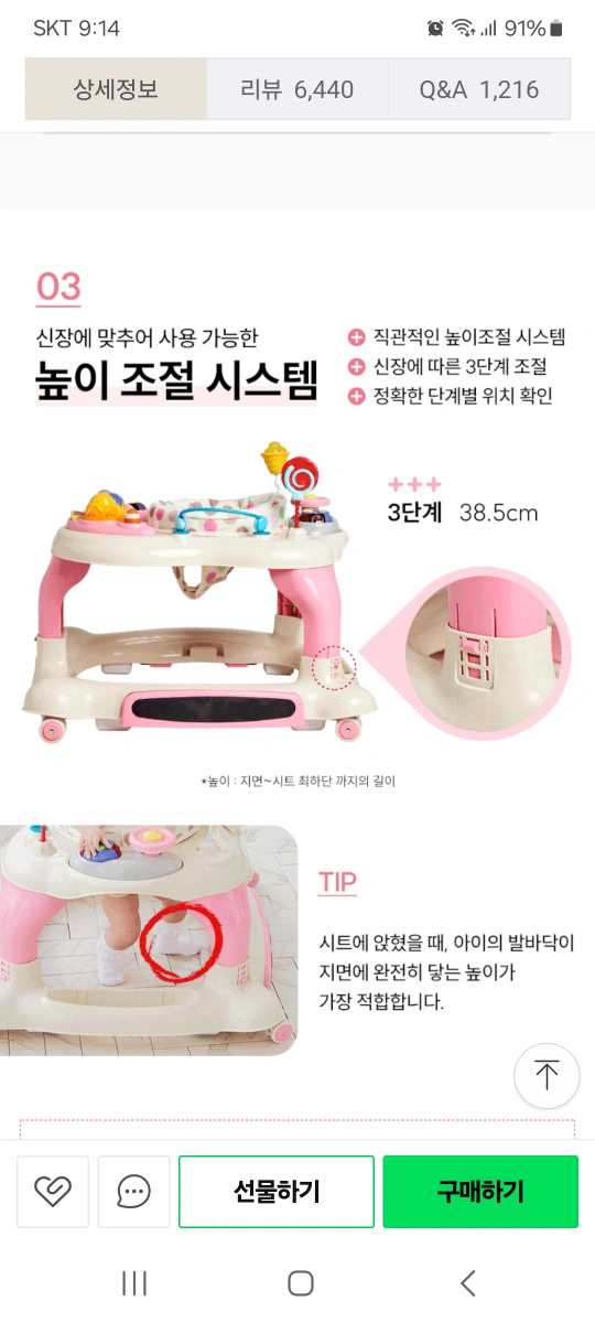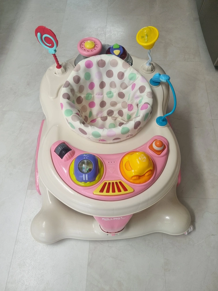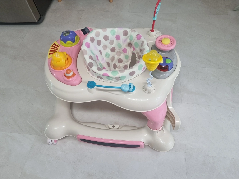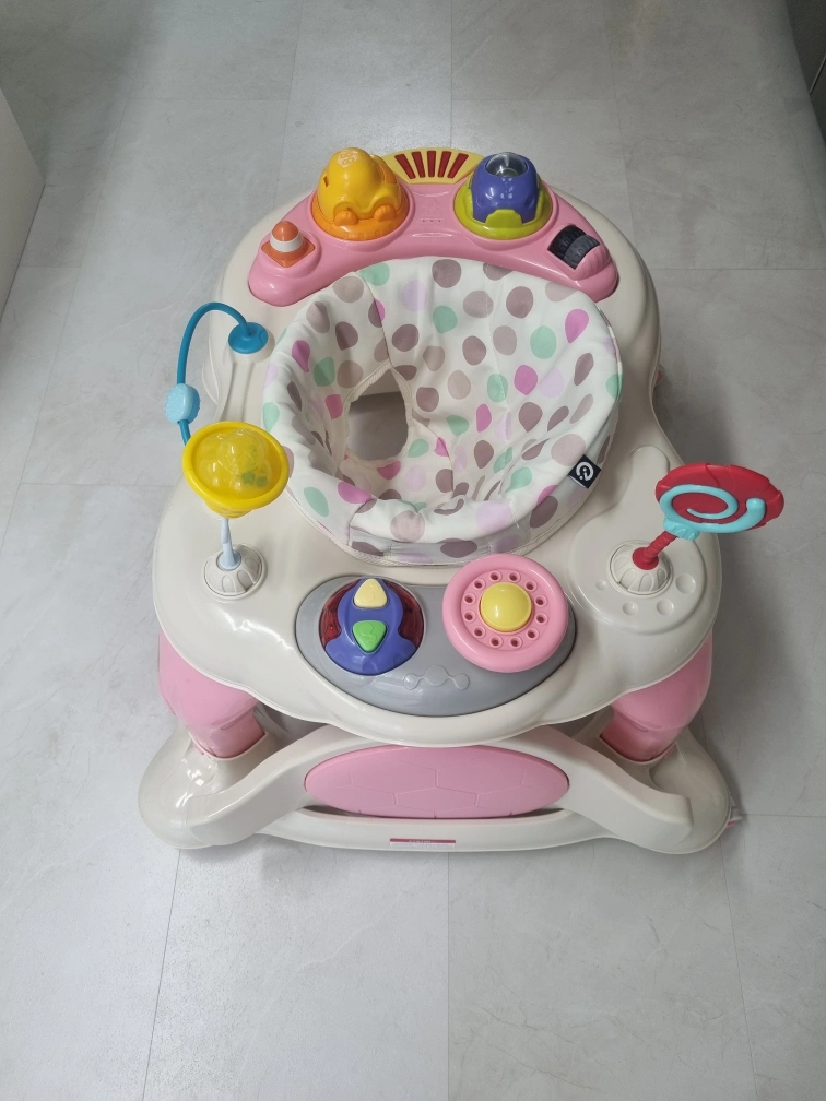 엔픽스 360 이지 플러스 다기능 아기보행기(핑크) 선물받아 새제품 4개월 여아 혼자 사용했어요. 보행기, 쏘서(점퍼루), 시소 겸용입니다. 1. 360도 회전 가능 2. 키에 따라 3단계 높이 조절 가능 3. 막 끌고 가다 매트 등에 걸려 넘어지지 않도록 세이프트 쿠션 장착됨 4. 장난감 빼서 세척 가능 5. 의자 시트 탈부착가능하여 세착가능 집이 좁아서 아기가 돌아다닐 공간이 없어서 저희 식사할때나 잠깐 사용했어요. 7개월 넘어서 사용하고 10개월부터 걸음마 시작해서 빨리 뗐어요. 시트 아기세제로 세탁하고, 장난감 아기물티슈로 닦아놨어요.