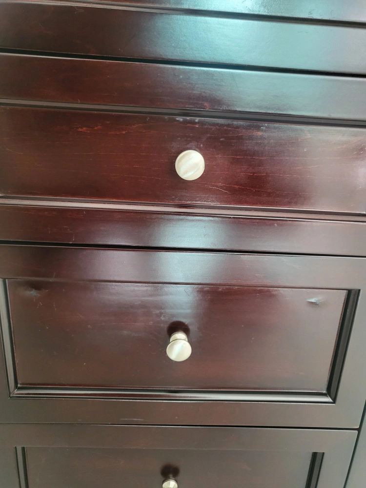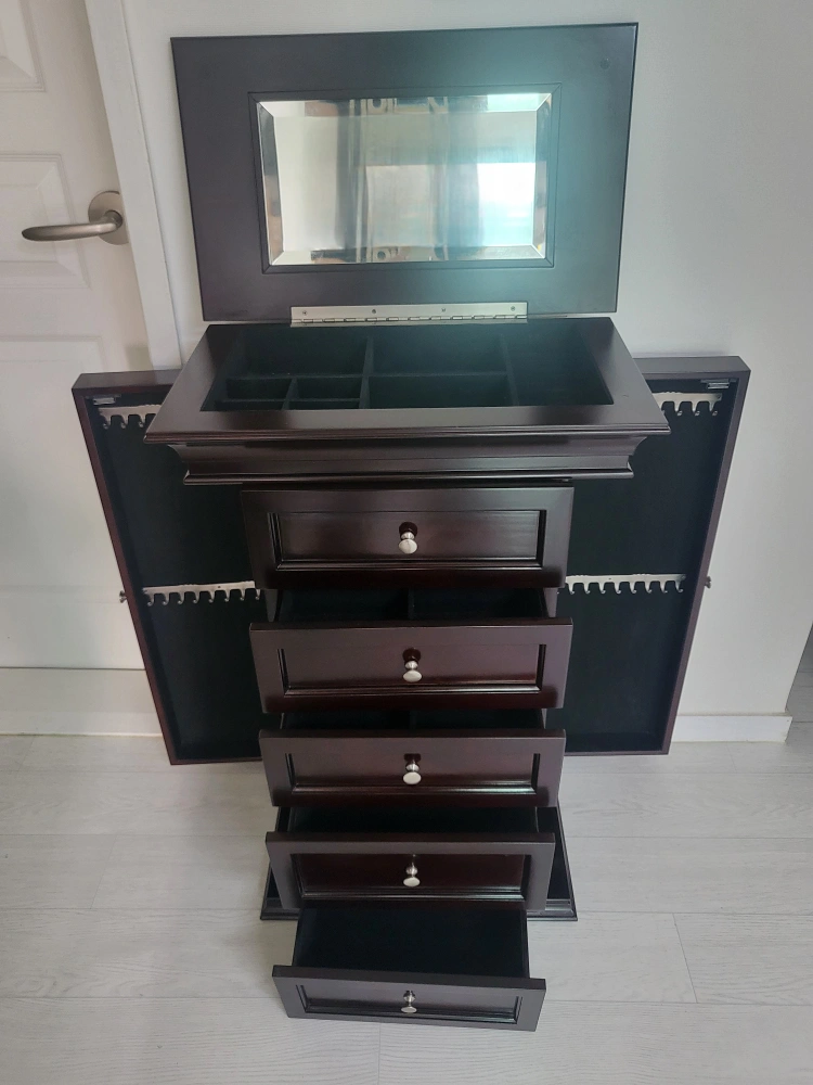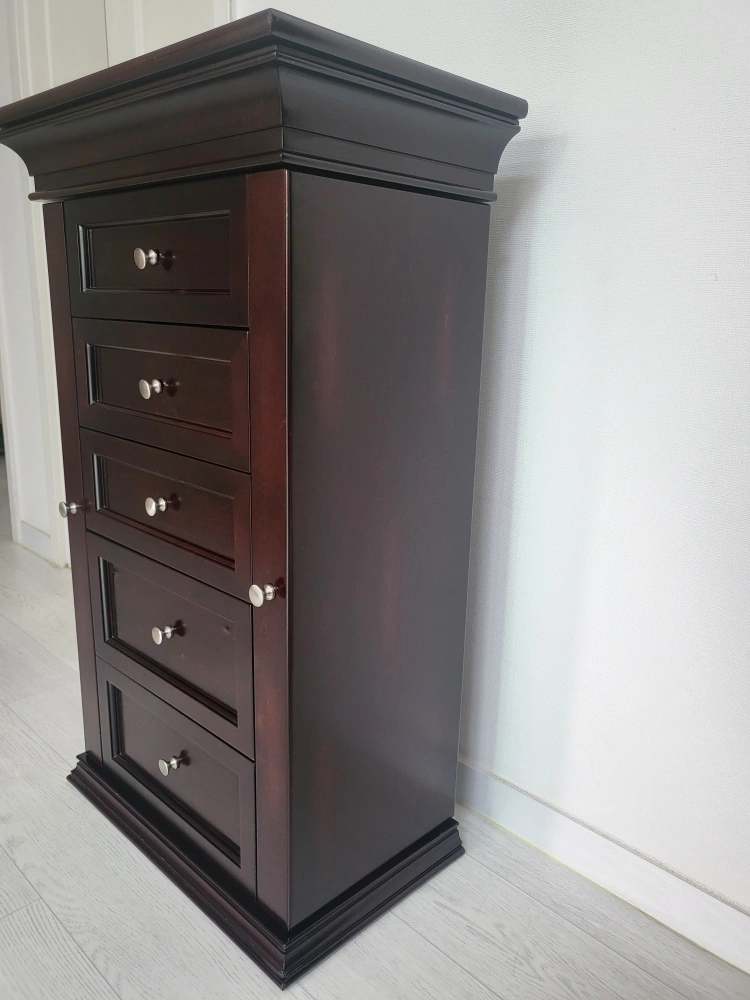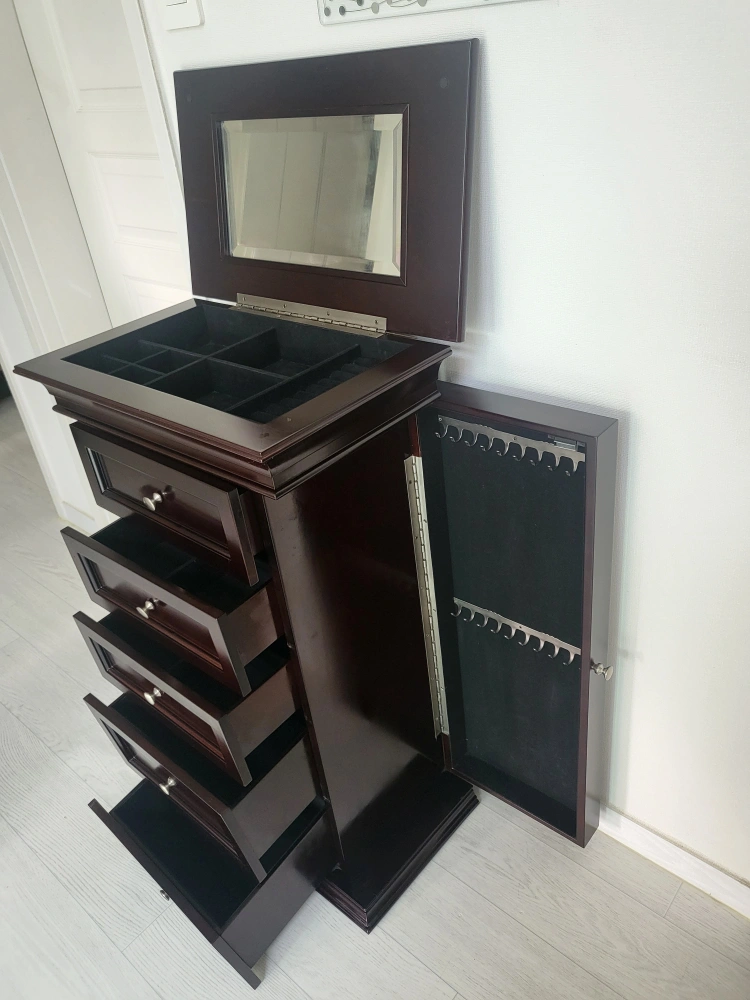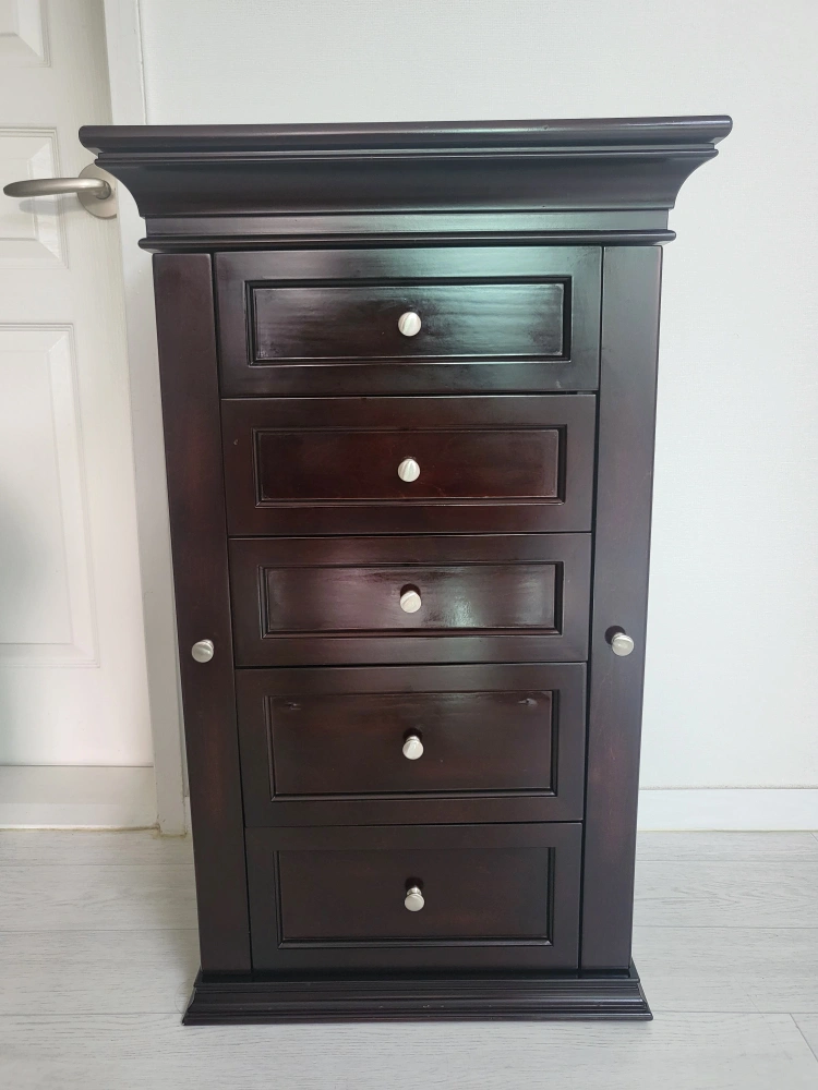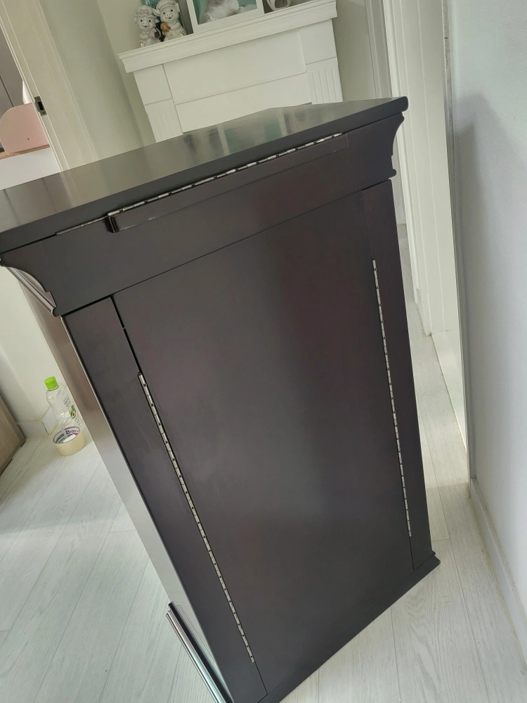 정리 중이에요 ~ 50×30 높이82 지인 부탁 으로 내놓아요~ 클래식 한 디자인에 자리차지 안하는 수납이 정말 많이되는 서랍장입니다 안쪽은 전부 벨벳 으로 마감처리 되어 있어 고급 스럽습니다 오래보관 하다보니 자세히 보면 사용감 많은 편이에요 (6번 7번 사진확인) 윗부분 서랍 손잡이가 흔들림 있어요 나사만 조이면 될것 같은데 안쪽에 벨벳 으로 되어 있어 어떻게 할지 몰라 그냥 두고 사용 했습니다 중고인점 감안해서 가격은 싸게 올립니다 예민하신 분은 패스해주세요 ~~ 문고리거래 선호합니다 반품.환불.네고×
