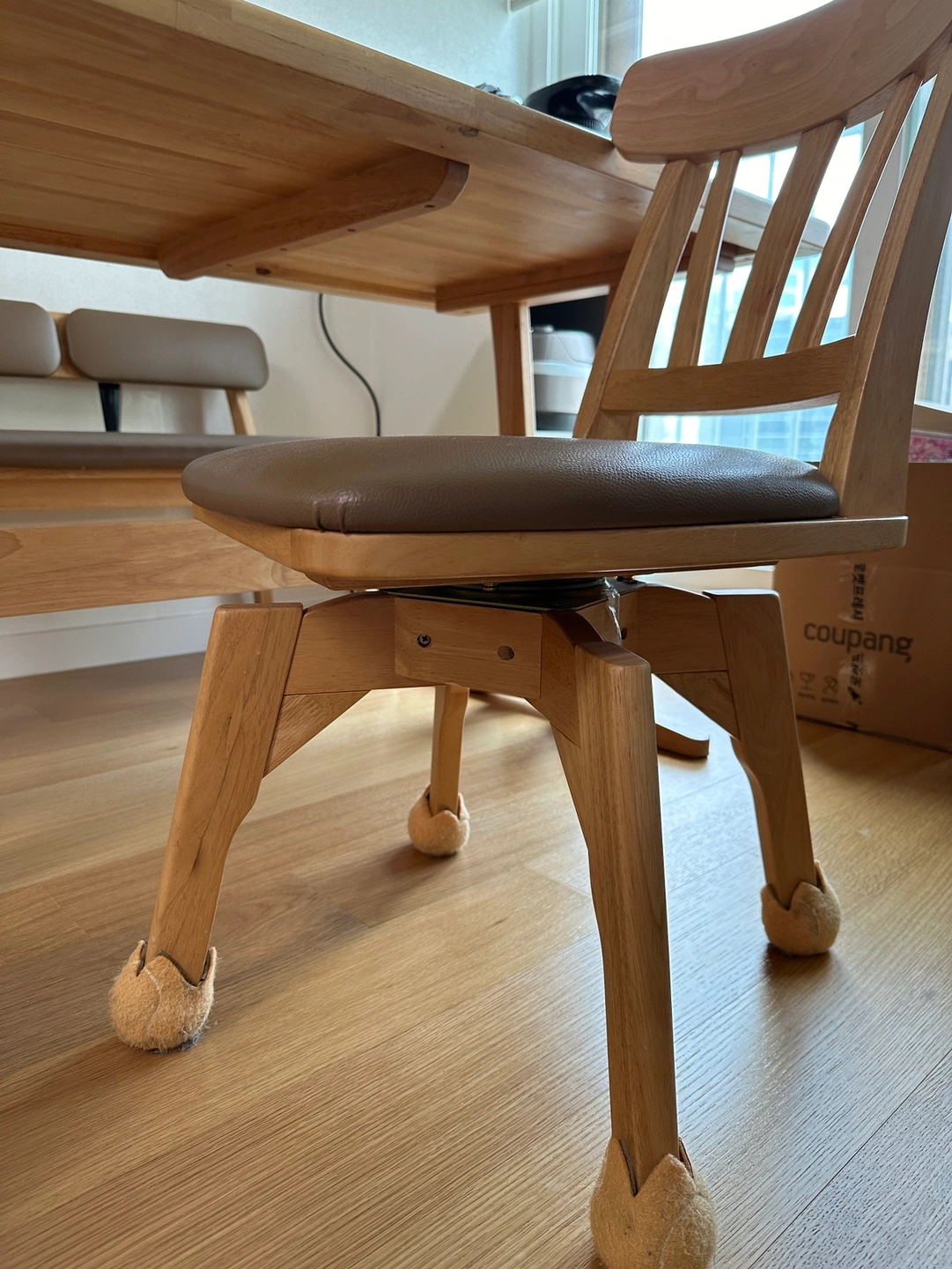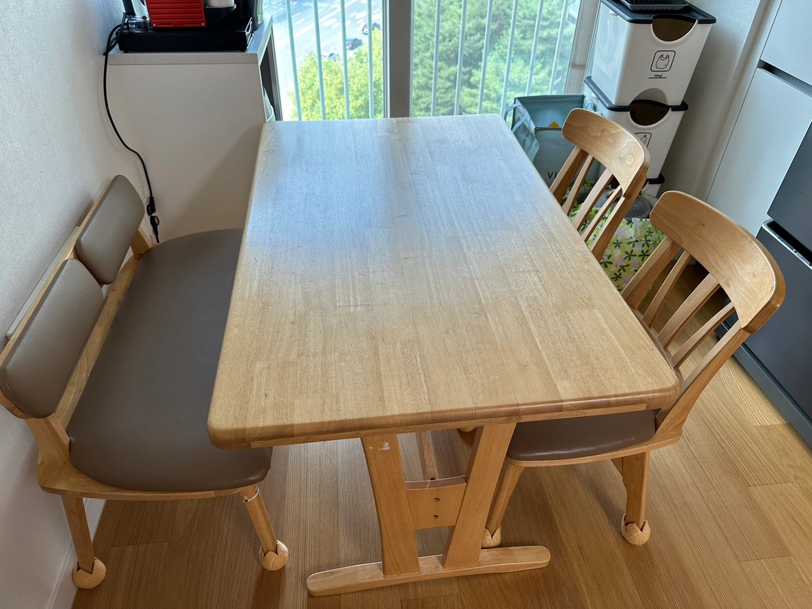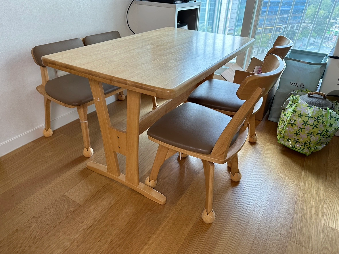 16년도에 가구단지에서 구입한 원목식탁세트입니다. 식탁 사이즈는 1200*750*730mm (가로 세로 높이) 이고, 의자2개는 회전 되는 의자에요. 쓰는데 큰 문제는 없으나 식탁에 사진과 같이 찍힌 자국과 펜자국이 있습니다. 사용감이 꽤 있으니 감안하시고 연락주세요. 환불 불가하며 오셔서 직접 가져가셔야 합니다.