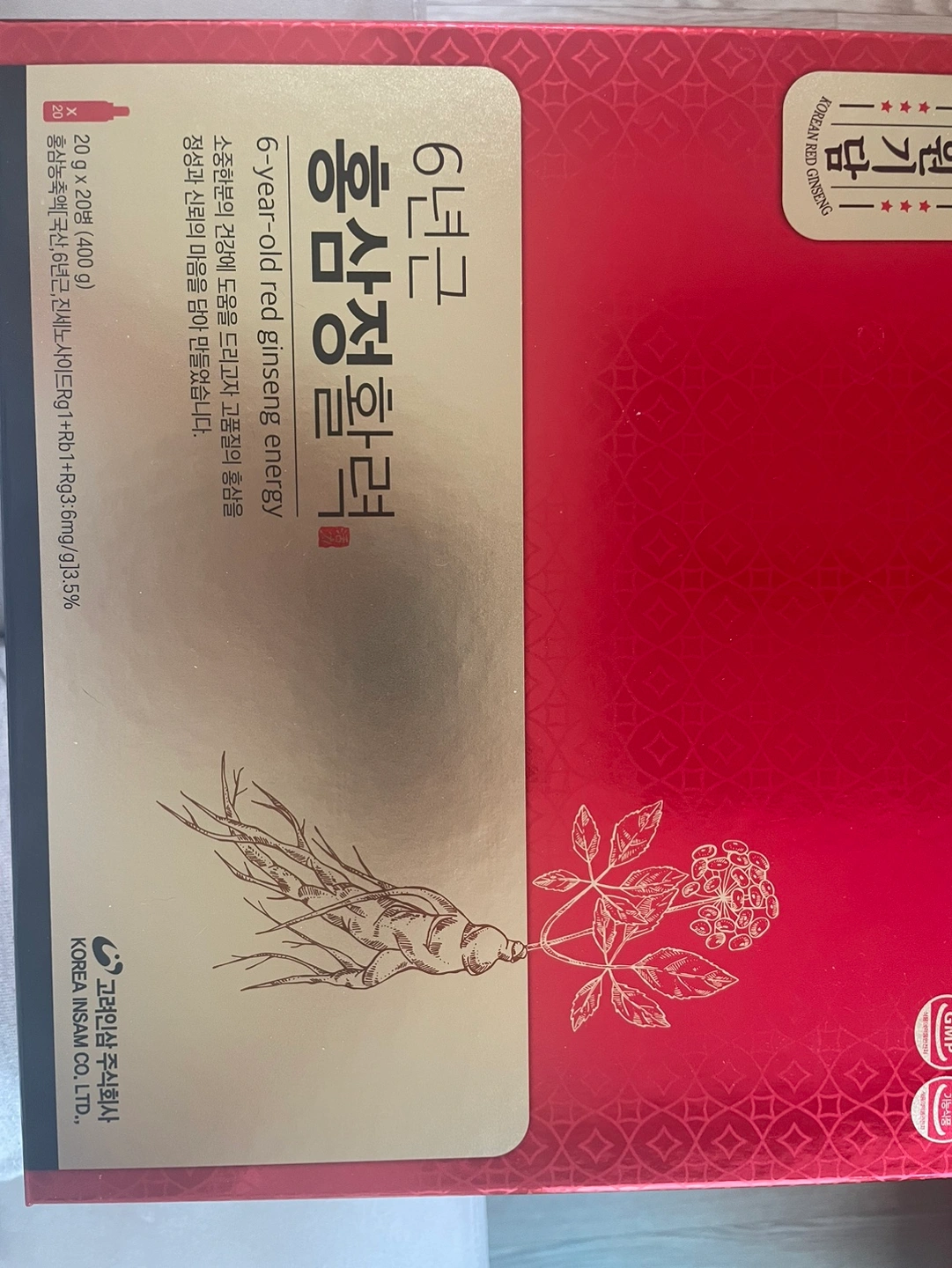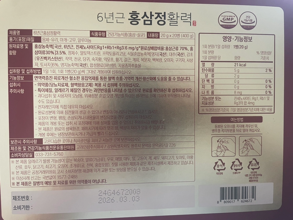 6년근홍삼정활력/20g x 20병 선물 받은 제품입니다. 홍삼은 안맞아서 팔아요. 스티커 살짝 뜯었습니다.