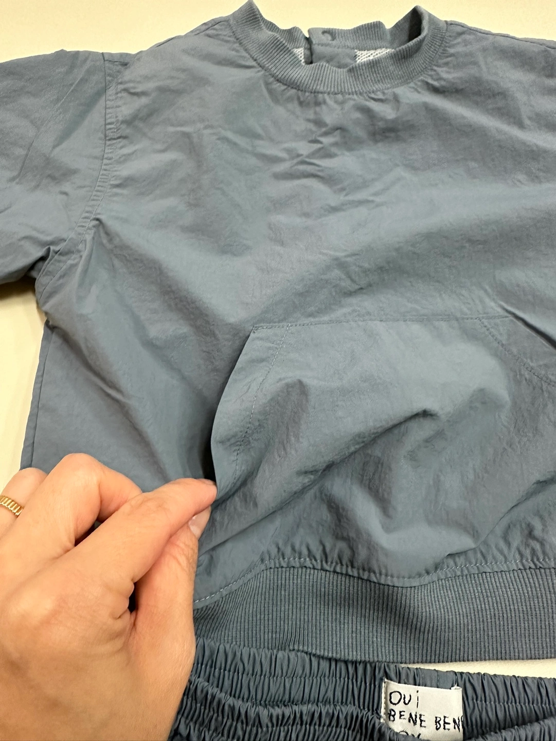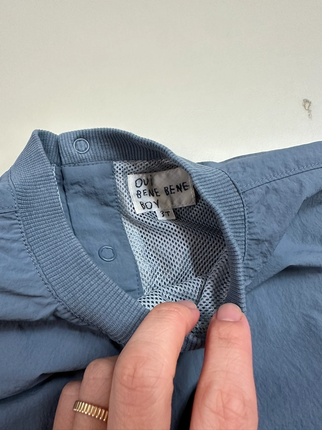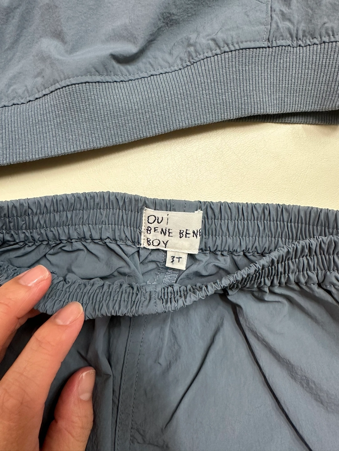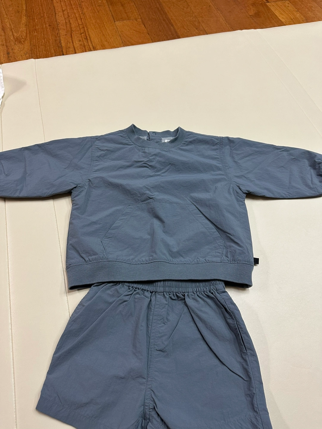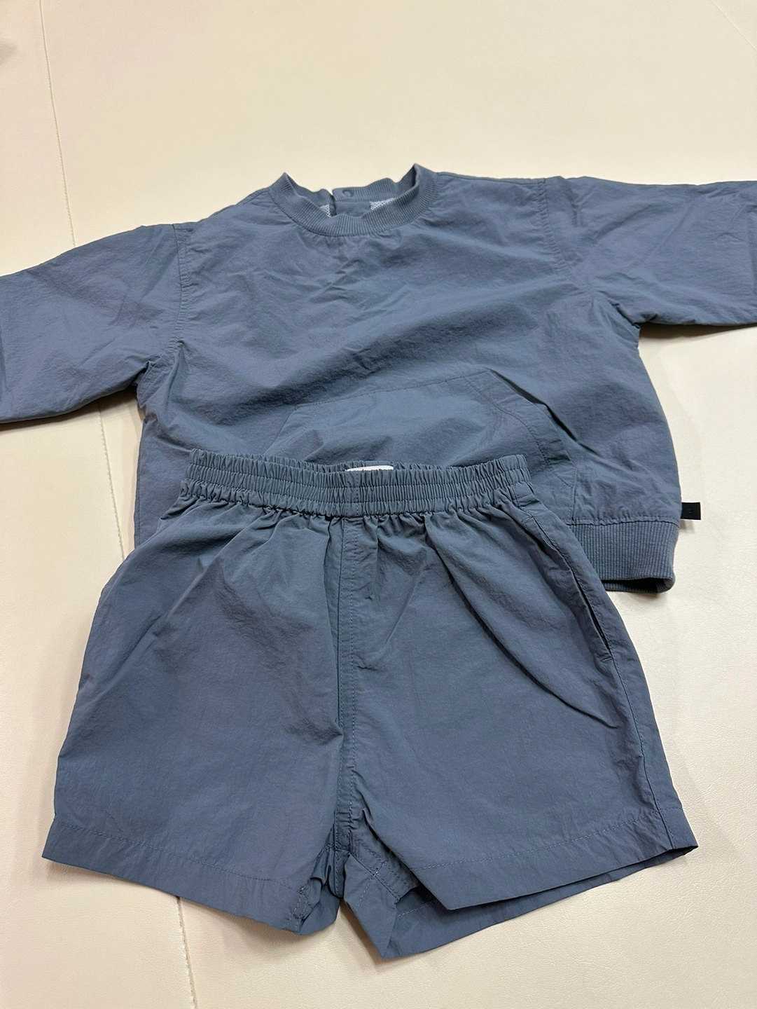 2023 년 구매, 베네베네 셋업이예요. 차분한 청색이고, 바람막이 재질입니다. 3T이지만 20개월~~ 26,7개월까지 잘 맞았어요. 오염 얼룩 없고 상태 좋습니다~ 니삭스에 신으면 너무 귀여워요!