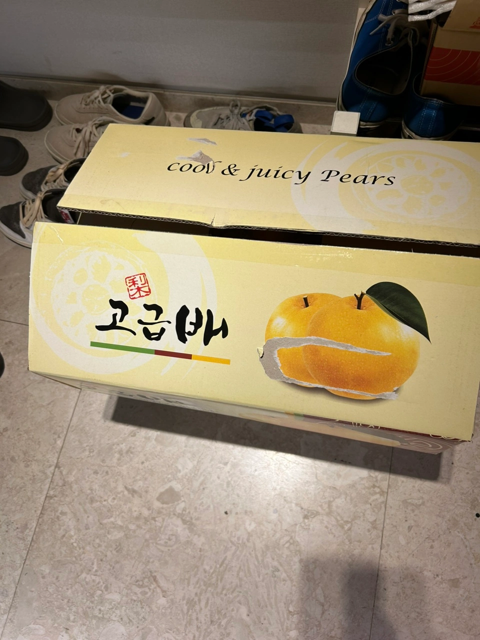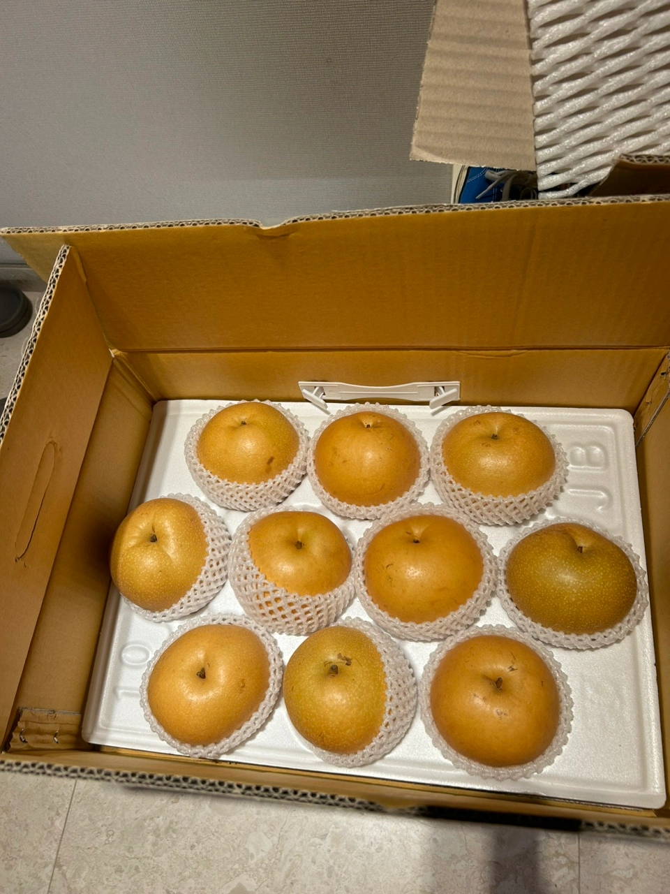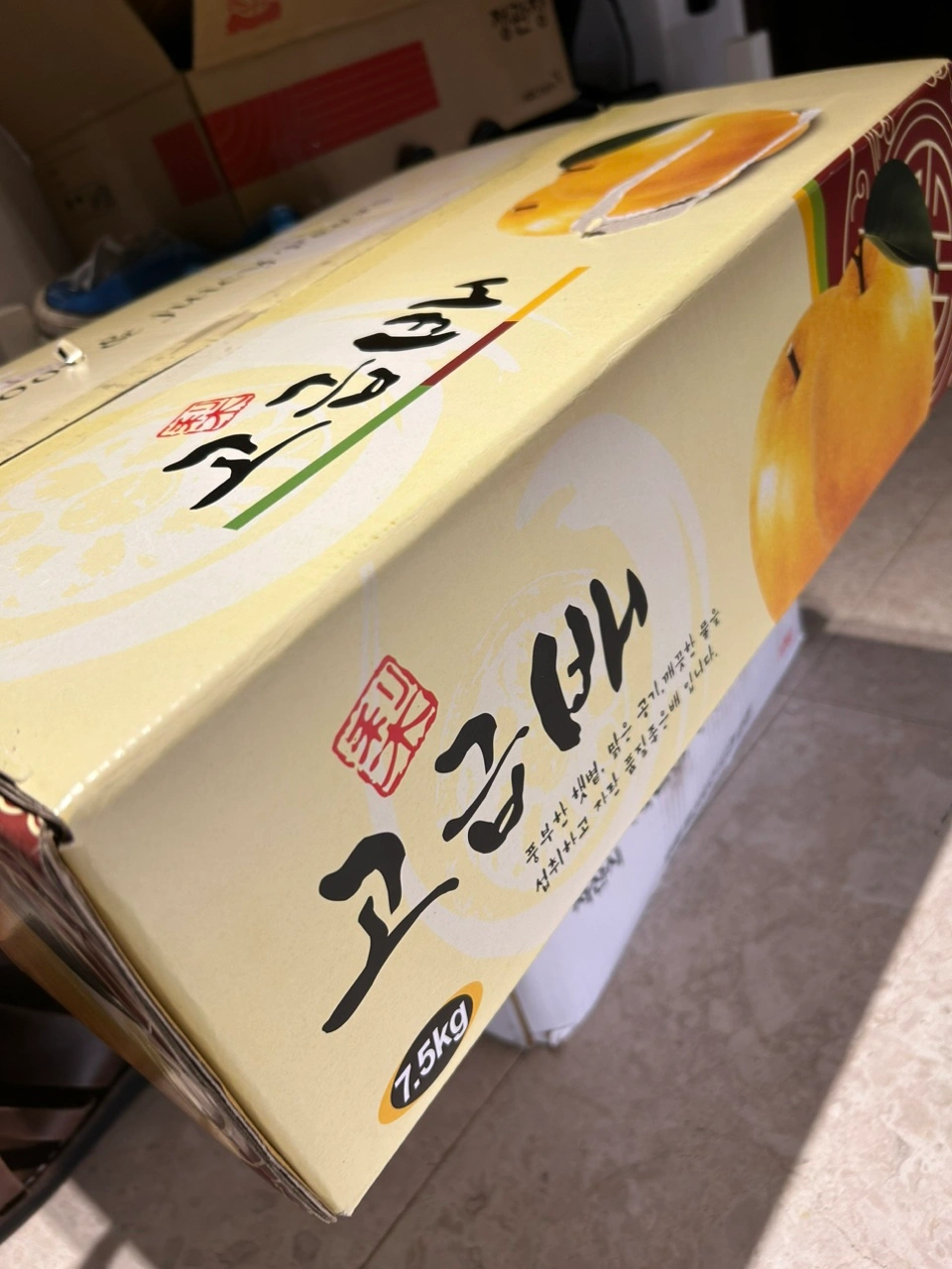 추석선물 받은 배 입니다. 7.5kg이고 10개 들었어요. 과일을 여러 상자 받아서 올립니다. 보낸분 주소송장 떼느라 상자종이가 조금 떼어졌구 물건확인하느라 열었어요. 집에서 드실분 구매하시면 좋을듯 합니다. 상자가 꽤 큽니다.
