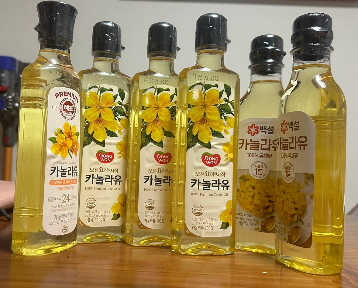 카놀라유6병 만원입니다. 유통기한 25.10.05 (1개) 25.12.14 (1개) 26.05.22 (2개) 26.04.16 (2개)