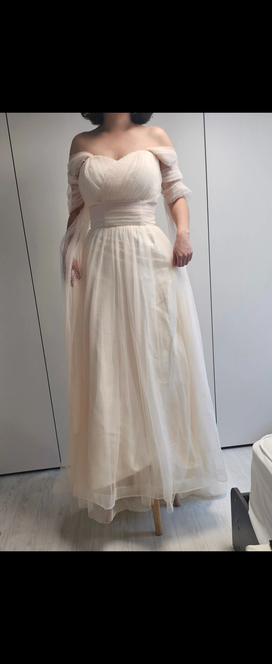 셀프스냅하면서 구매했던 웨딩드레스 입니다! 실내에서만 입고 찍어서 오염없고 쨍하지 않은 아이보리 컬러에 팔뚝을 가려주는 끈이 있어서 여리여리 다양하게 연출 할 수 있어요! 뒷부분이 앞부분보다 길어서 뒷모습 촬영도 예쁘게 가능! 끈가봉 형태라서 44-66까지 가능할 것 같습니다 본인 스펙 (160/53) 사이즈 관련 궁금한 분도 챗 환영입니다! 가슴부분에 패드도 내장되어 있어서 누브라 없이도 착용 편했어요! 셀프로 웨딩촬영 준비중이신 예신님 득템해가세용!!