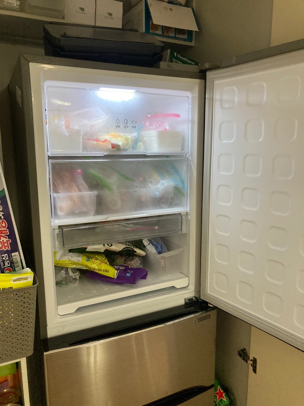 2017년 겨울에 구매했어요 아랫칸에 찍힘 조금 있어요 작동은 잘 되고 깨끗합니다 이사 시일 얼마 안남아서 싸게 팝니다 김치통은 없어요 쌀 담은 긴통하고 김치 담있던 통은 드릴 수 있습니다 가져가실분 연락 주세요