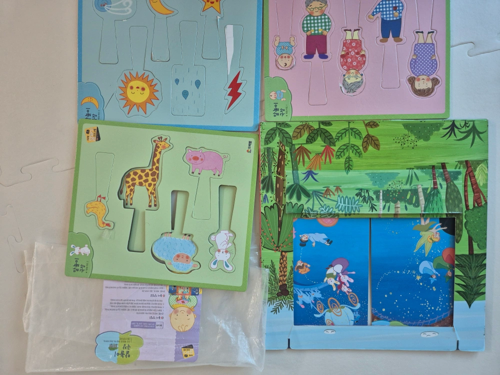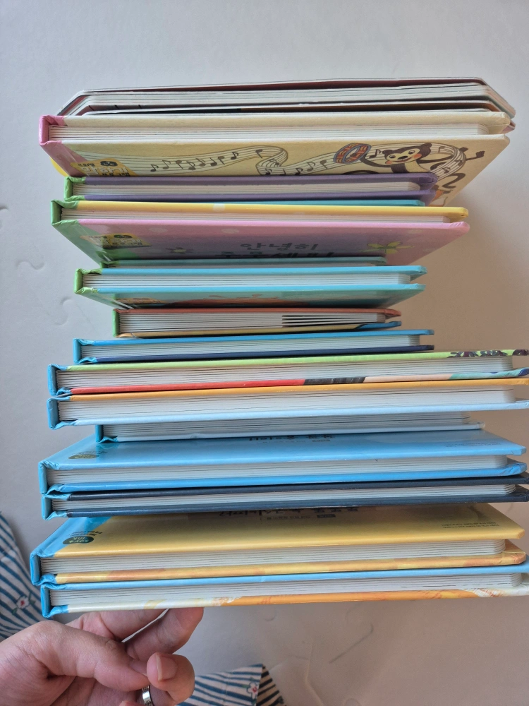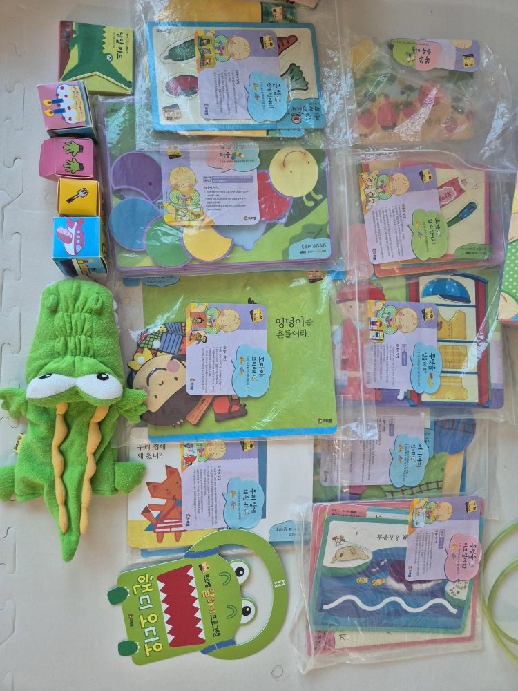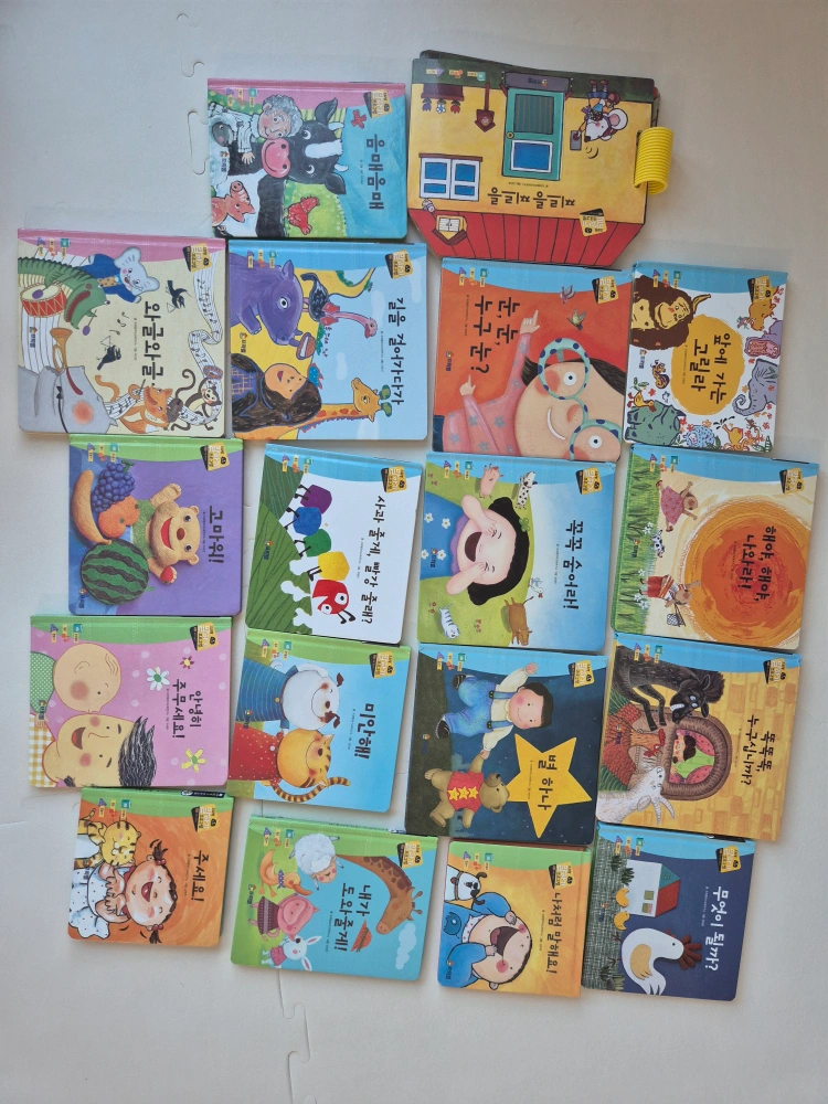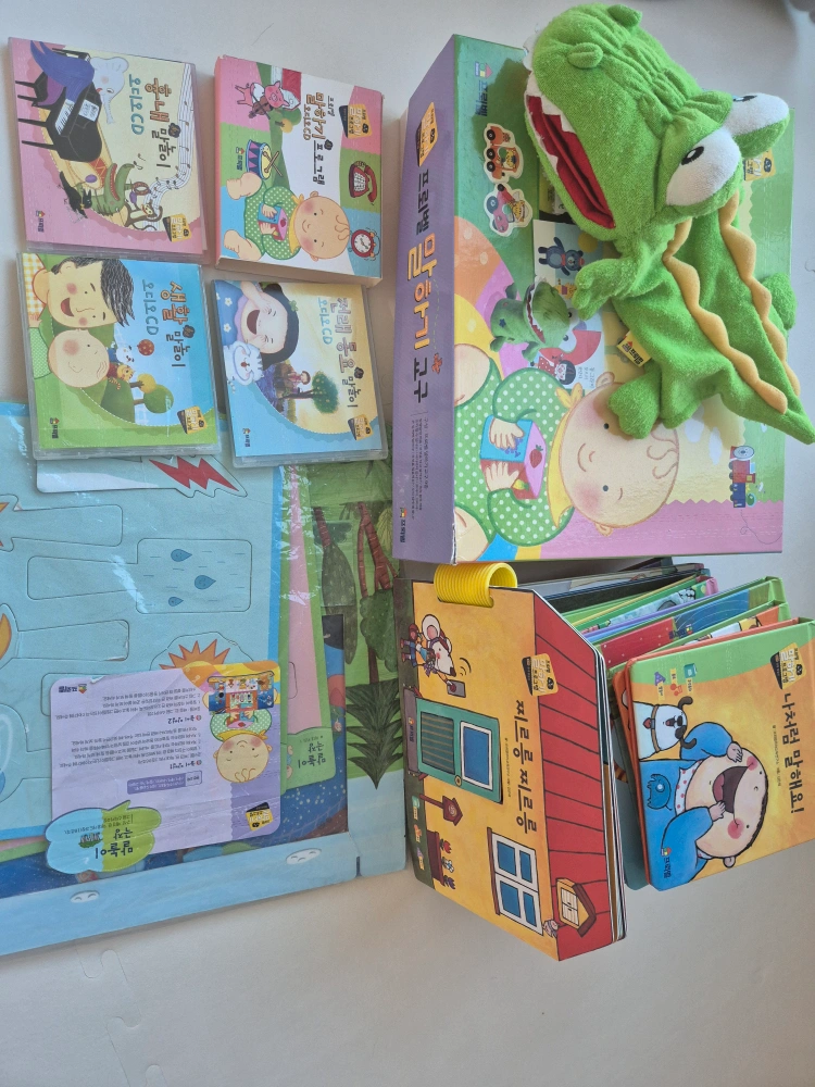 책18권 교구9종 말놀이극장 cd3장 누락없이 모두 갖고 있습니다. 새책 사신분께 당근해서 잘썼어요 책은 찌르릉찌르릉 손상이 제일 심하고 고마워책 테이프 있고 그 외엔 상태 괜찮습니다. (사진참조) 교구는, - 악어 낱말카드 24장 모두 있고 악어 녹음 잘됨 - 우리집에왜왔니 스티커 사용했고 - 어디까지 갔니 기차랑 말 등이 없습니다. 그 외 교구는 누락 없이 모두 있어 활용 잘 하실수 있지만 사용감 많습니다. 사용감 있는 부분 사진 참고해주세요. 특히 말놀이 극장을 너무 좋아해서 테이핑 등 있어요. 사진 참고해주세요. 음원이나 씽킹펜은 없습니다. 저희 집앞 비대면 거래 원합니다.