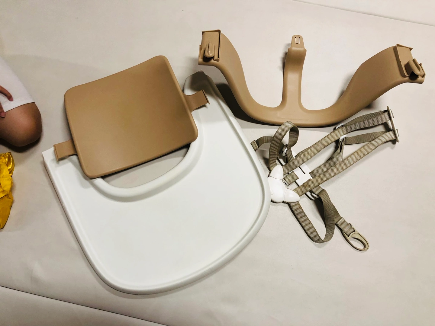 스토케 트리트랩 베이비세트입니다. 트레이는 화이트, 아기 받침대는 네츄럴베이지이고 깨끗해요. 하네스는 몇 번 안쓰고 보관했는데 보관을 제대로 못했는지 사진처럼 얼룩 있습니다.
