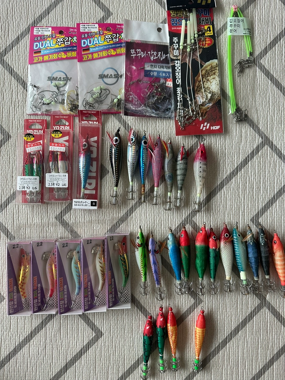 쭈갑채비 5셋트 틴셀2.5 2셋, 요즈리8개(일부1~2개만 사용) 한치에기 5개 세제품, 일반 주꾸미 에기 11개 (일부사용) 한치에기 4개(새제품)