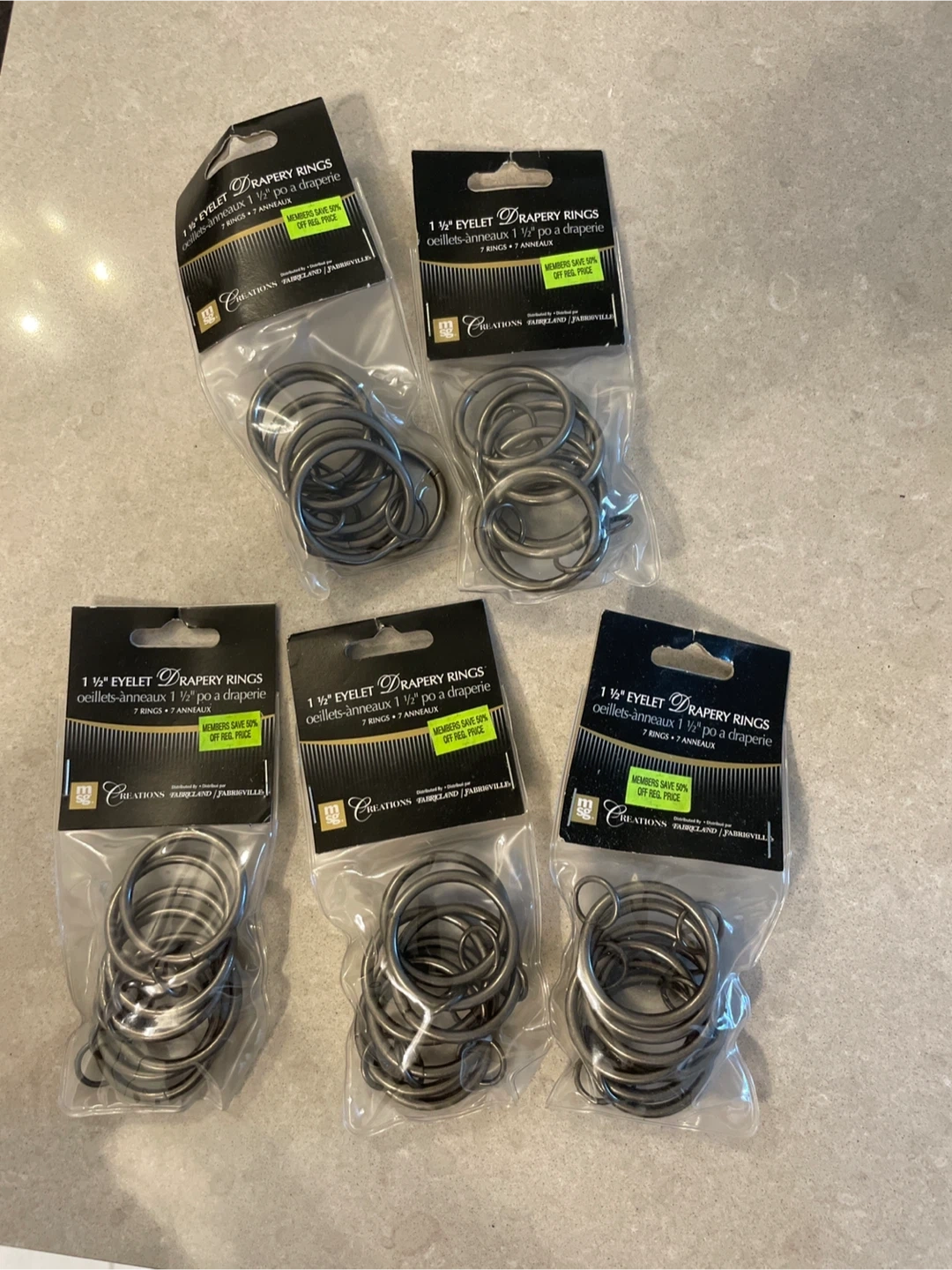 I have five packs of 1 1/2" eyelet drapery rings for sale. Each pack contains 7 rings. They're perfect for adding a touch of elegance to your curtains!