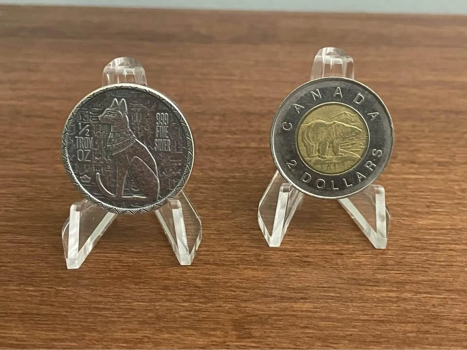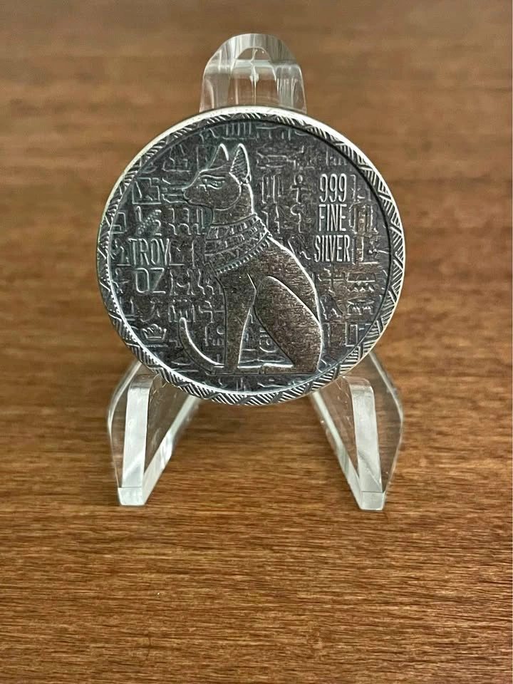 Back in stock but only 2 available. 1/2 oz .999 fine/pure silver bullion Egyptian Cat Goddess “Bastet” round. It has been given a special finish creating an ‘antiqued’ patina. Great unique gift idea for the cat lover. Can meet at public place in Maple Ridge. Sigma precious metals verifier certified, see associated photo. Include stand - add $3 Feel free to check out my other listings for more unique copper and silver gift ideas.