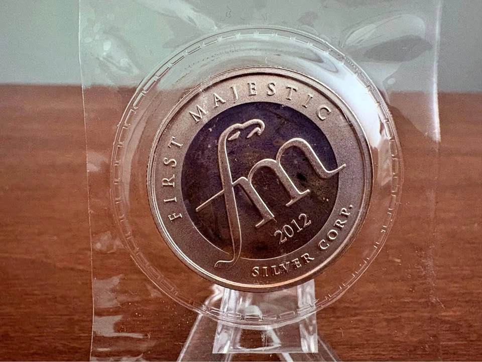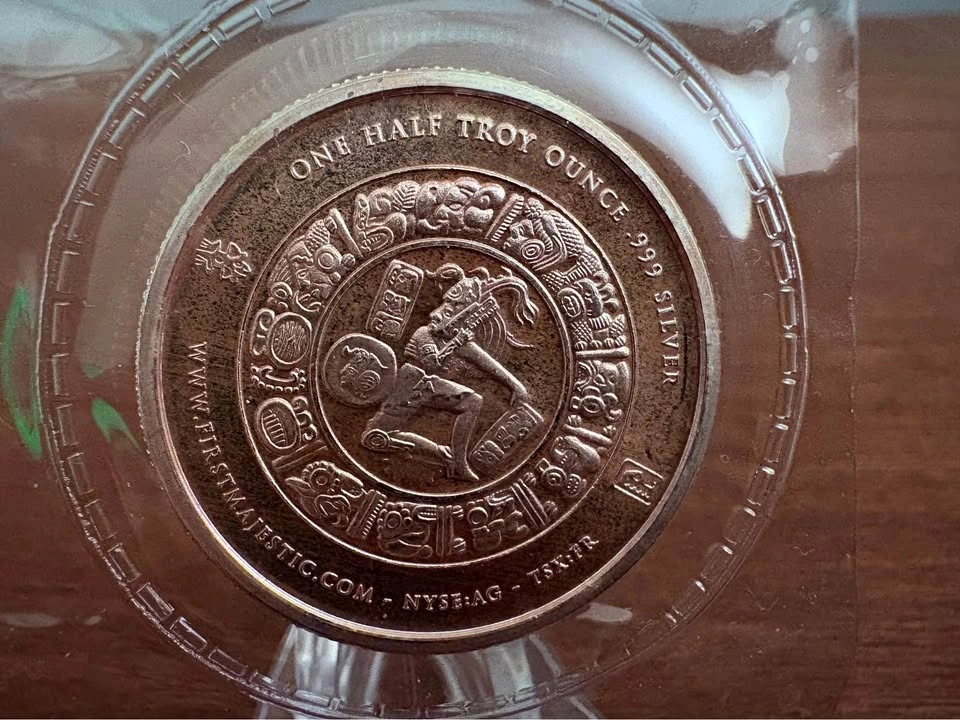 1/2oz .999 pure/fine silver bullion round by First Majestic Silver Corp in original mint bubble packaging. The obverse contains a detailed Mayan design, with the reverse displaying the First Majestic logo and the year of mintage (2012). Sigma precious metals verifier certified, see photos. Can meet in a public place in Maple Ridge. Include stand - add $3 The stand is too thick to be shipped letter mail, so would have to be purchased in person. Thanks! Price can be subject to change with significant market fluctuations in silver spot price.
