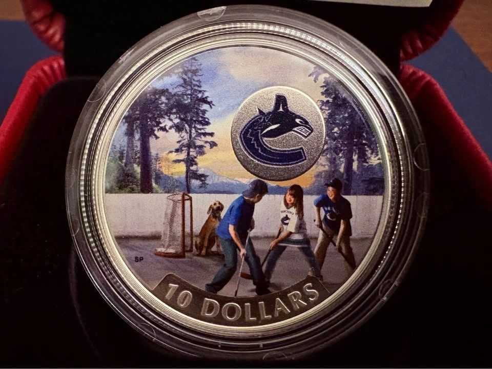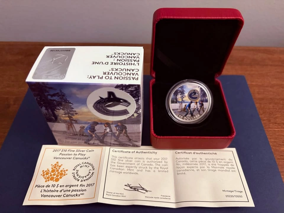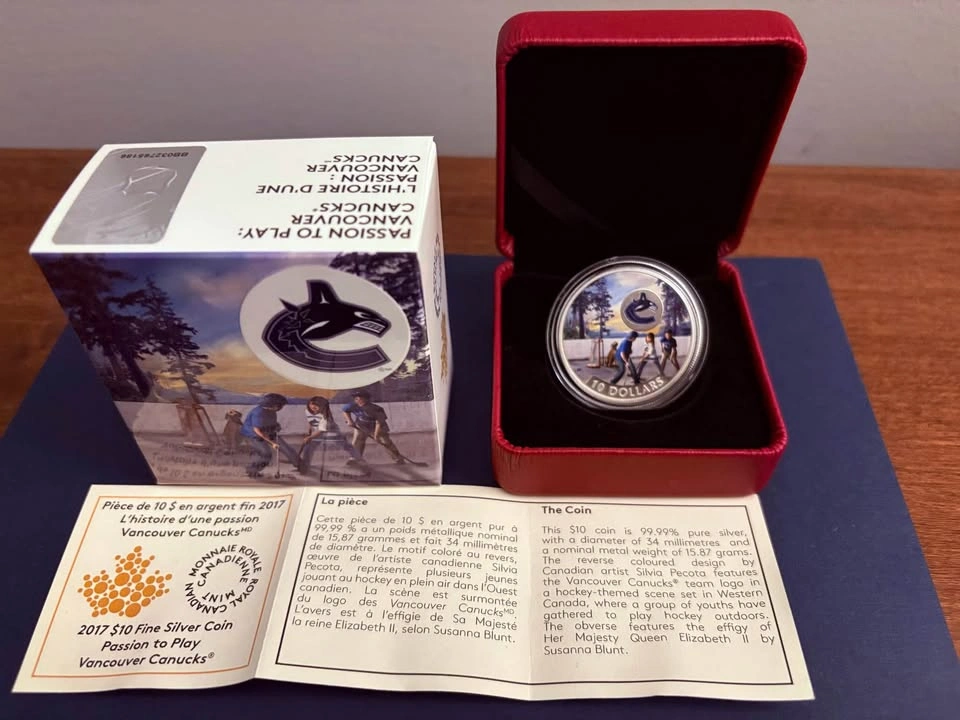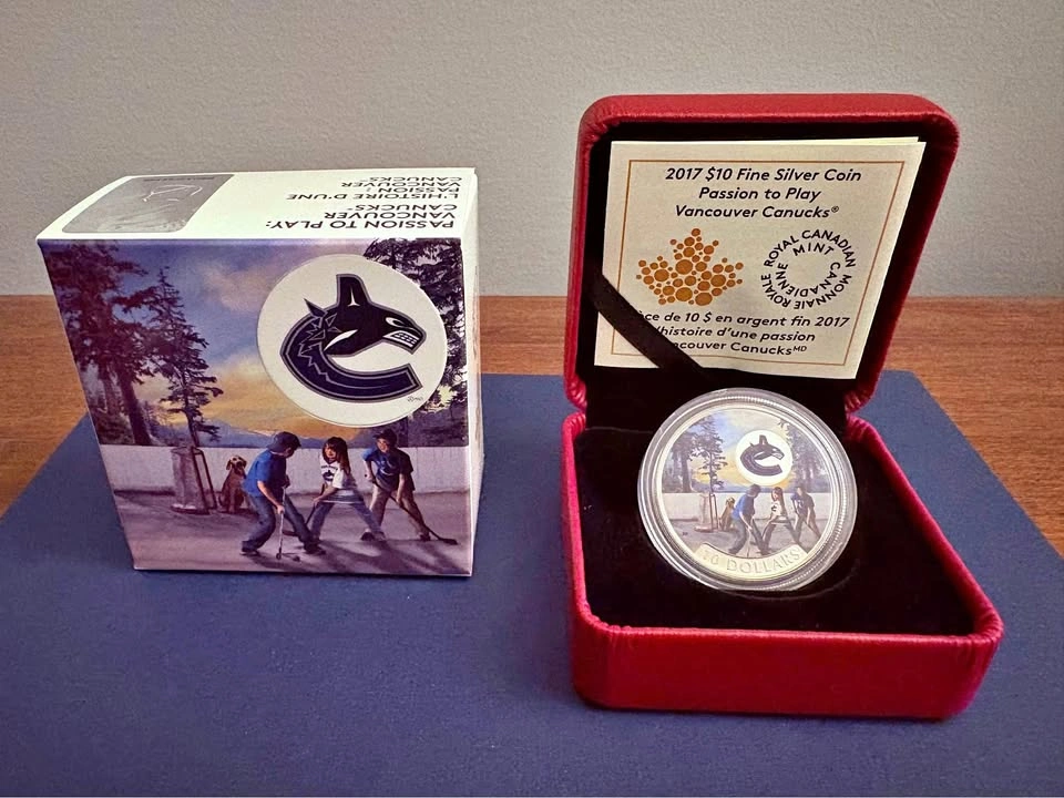 2017 1/2 oz .9999 pure/fine silver bullion “Passion to Play” Vancouver Canucks collector coin by Royal Canadian Mint in brilliant uncirculated condition. Limited mintage of 10,000 pieces. I have multiple available so serial numbers will vary but all are brand new condition like this one. Comes with original case cover, clamshell case, hard protective capsule and certificate of authenticity. Would make a great gift for any Canucks fan and a truly unique addition to any silver collection; looks great on display! Can meet in a public place in Maple Ridge. Thanks! Price can be subject to change with significant market fluctuations in silver spot price.