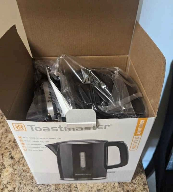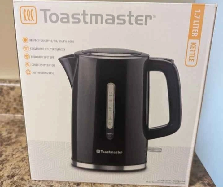 Selling a brand new Toastmaster 1.7 Liter Kettle still in its original box! It's perfect for coffee, tea, soup, and more. This kettle has a convenient 1.7-liter capacity and an automatic shut-off feature for safety. It also has cordless operation and a 360° rotating base for easy use. Comes with all original packaging and components! $25