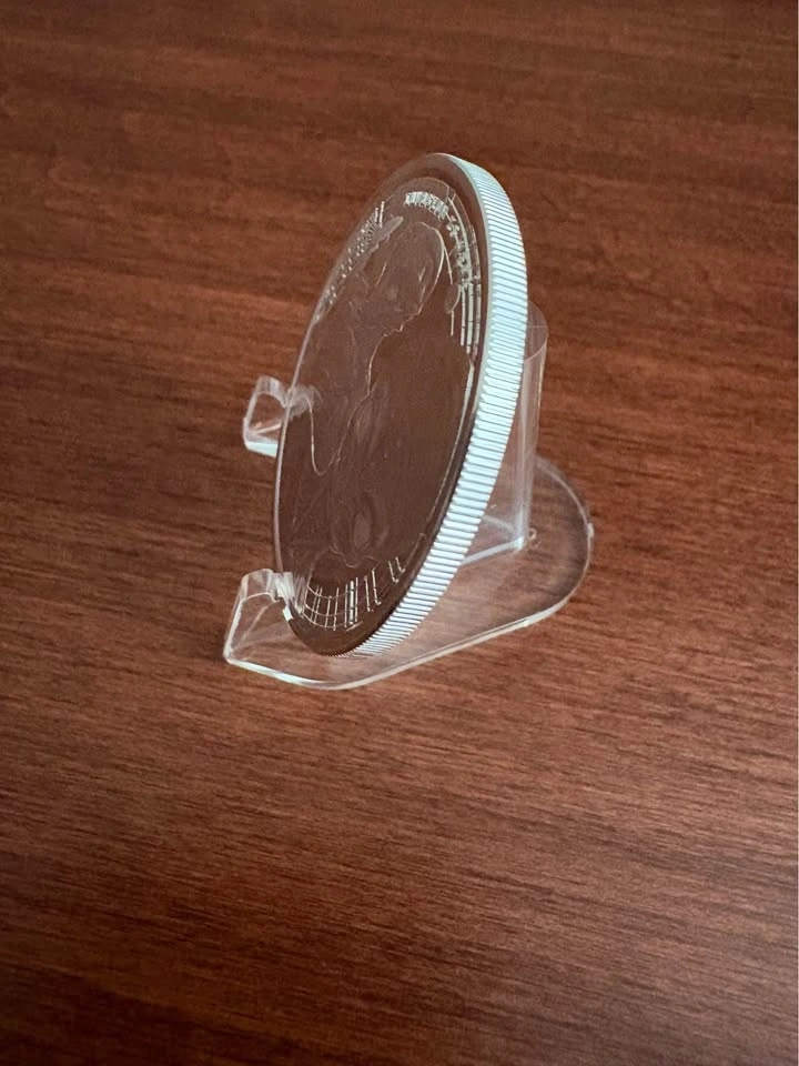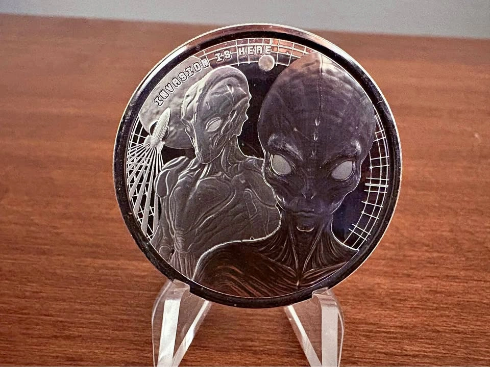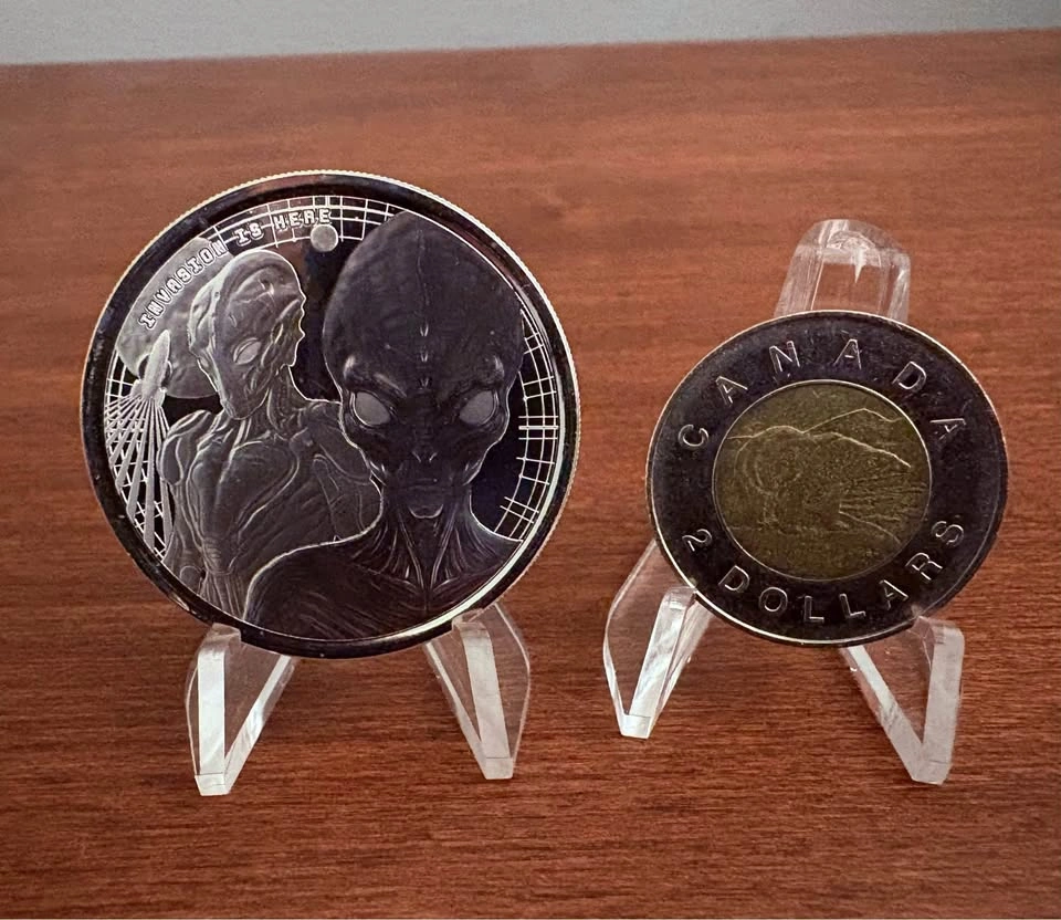 1 oz .999 pure/fine silver bullion 2023 Republic of Ghana Space Alien. Limited mintage of 25,000 coins. Obverse: Design is complemented by the crop circles around the Ghana coat of arms with “Republic of Ghana," metal composition and weight as well as "20 Cedis." Reverse: Features two battle ready aliens with a spaceship taking off to the side. Sigma precious metals verifier certified, see photos. Can meet in public place in Maple Ridge. Include stand - add $3 Include hard protective capsule - add $3 The stand is too thick to be shipped letter mail, so would have to be purchased in person. Thanks! Price can be subject to change with significant market fluctuations in silver spot price.