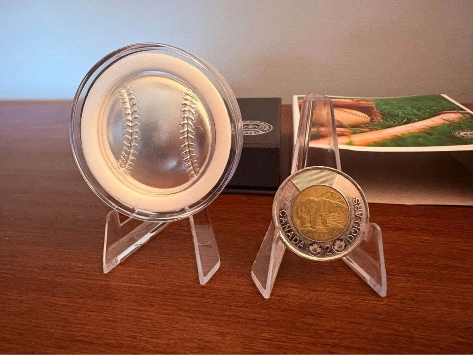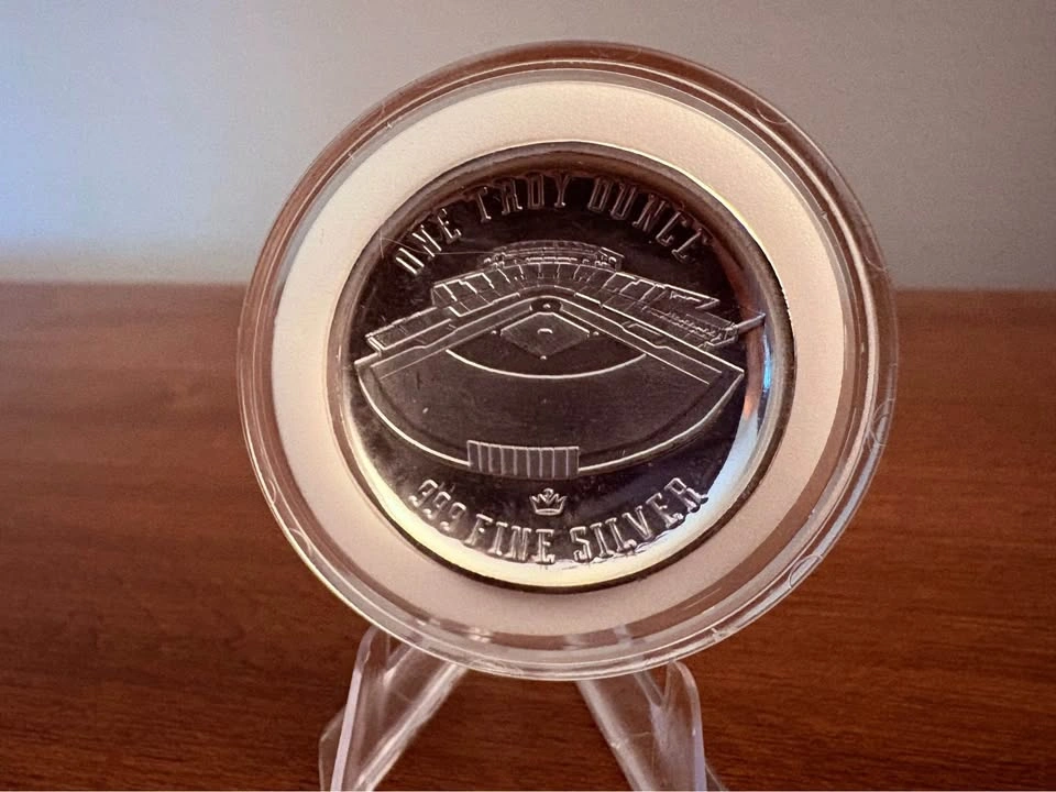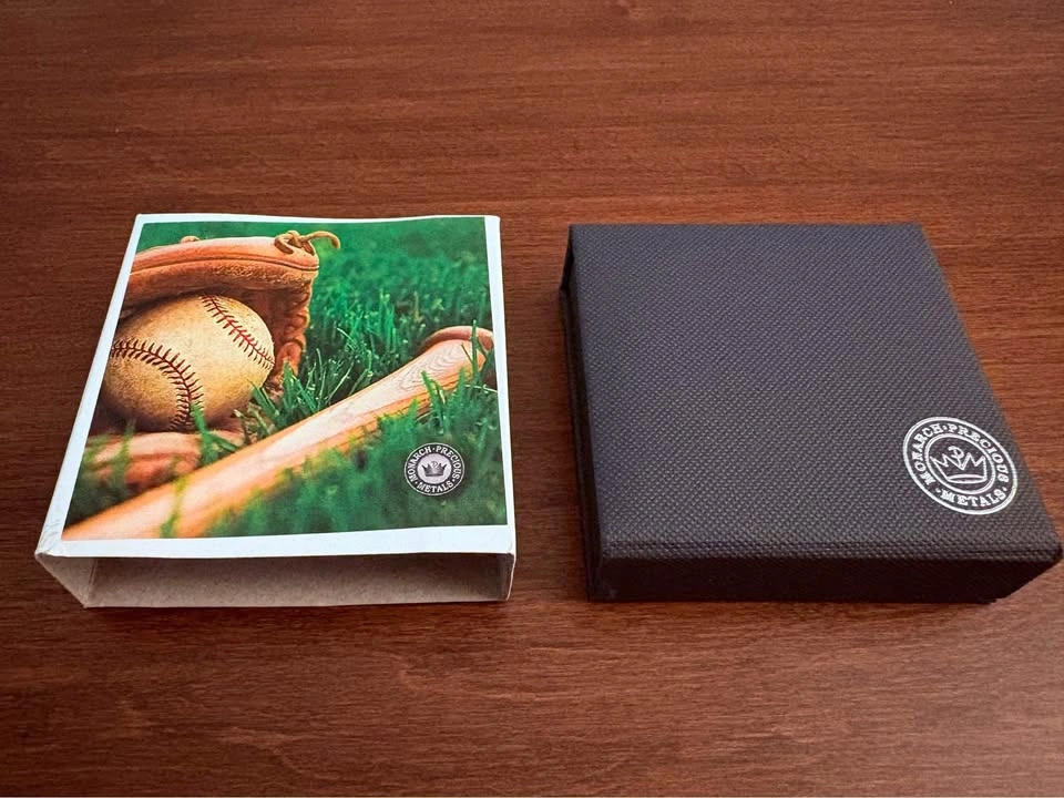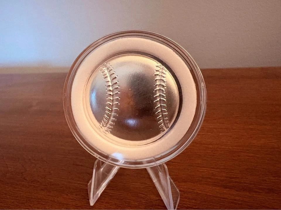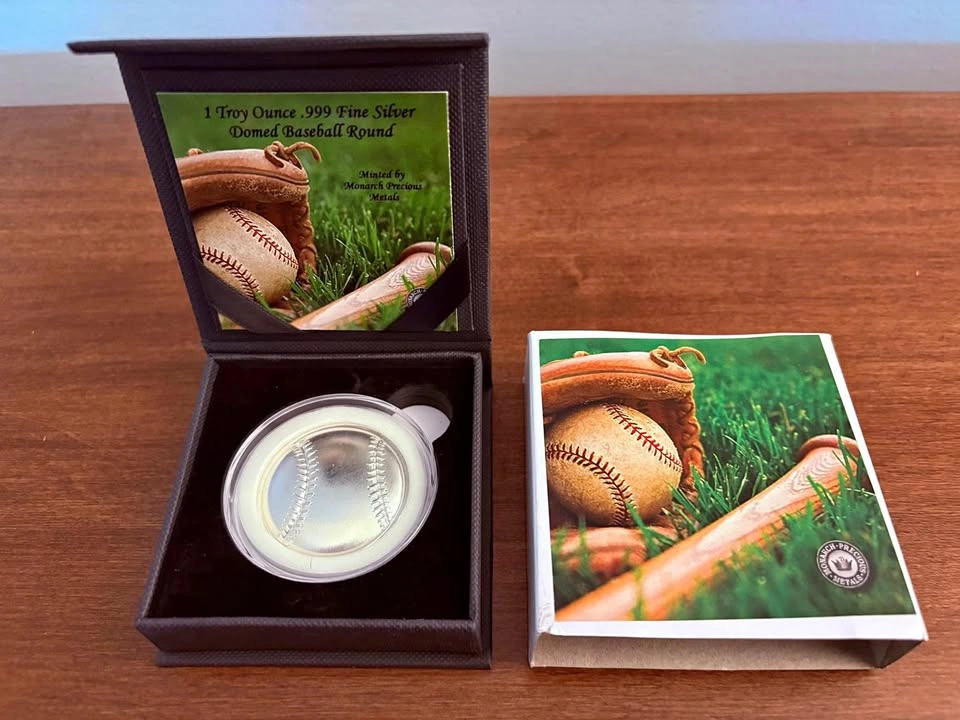 1 oz .999 fine silver baseball round minted by Monarch Precious Metals in Medford, Oregon with its own gift box, presentation card, and box sleeve as shown. The round also comes in its own air tight capsule. This is a very unique shaped round as it has a convex obverse. Can meet in public place in Maple Ridge. Thanks! Price can be subject to change with significant market fluctuations in silver spot price.
