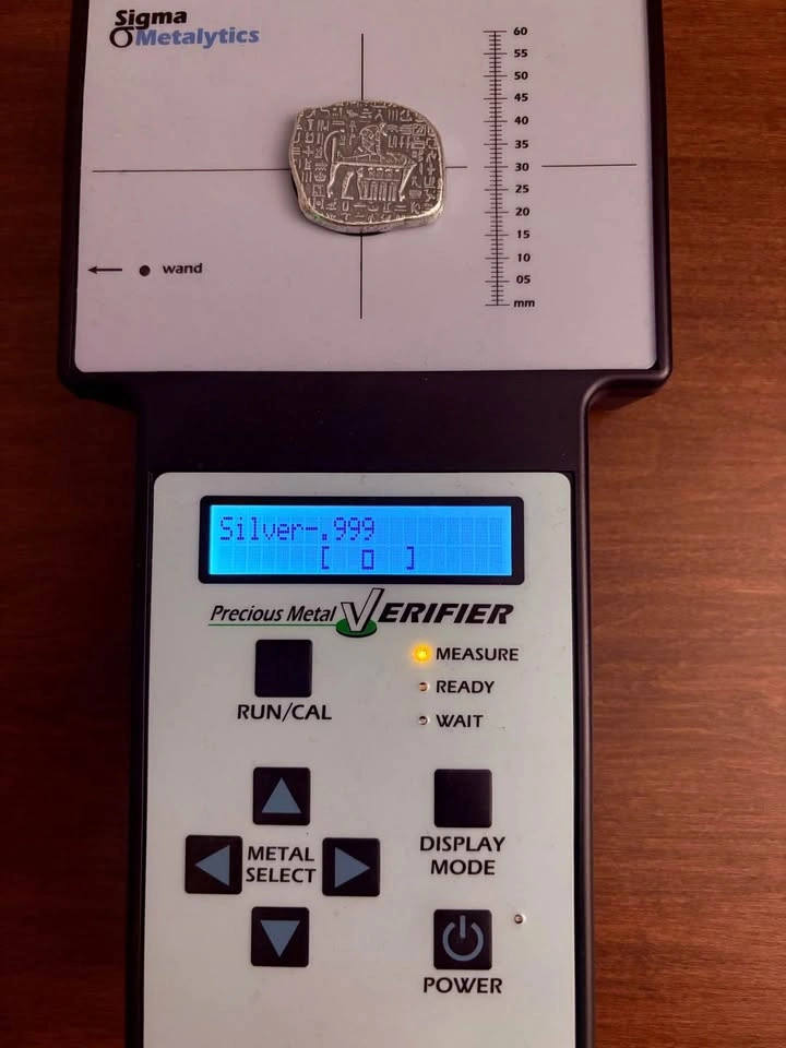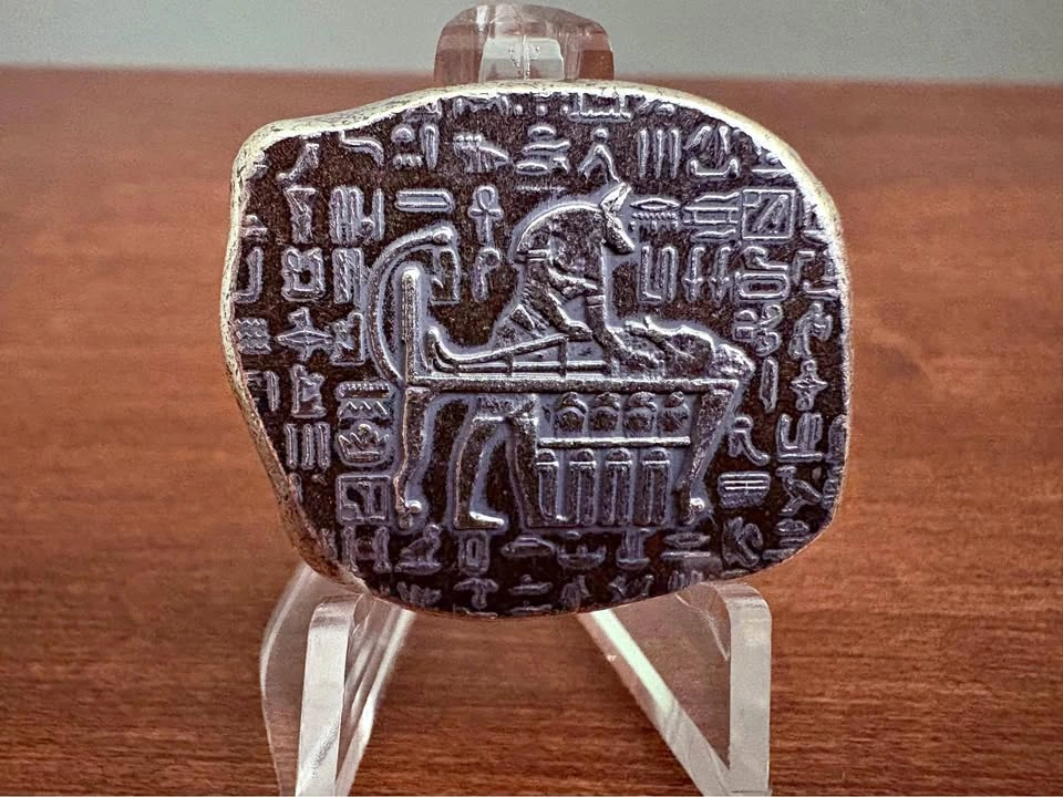 1 oz .999 fine silver relic bar, old world style Egyptian God Anubis Jackal. Brand new uncirculated condition. When these bars are struck they are struck off centre to give each one an individual shape and are purposely made to look like stone relics chipped off the side of a tomb. The bar is then given an antique patina to add to the look of old world charm. Because of this uniqueness, the shape of the bar you receive may vary slightly from the picture, but can provide pic of the exact bar you will receive. Sigma precious metals verifier certified, see photos. Can meet in public place in Maple Ridge. Include stand - add $3 Include protective capsule - add $3 The stand is too thick to be purchased in person. Thanks! Price can be subject to change with significant market fluctuations in silver spot price.