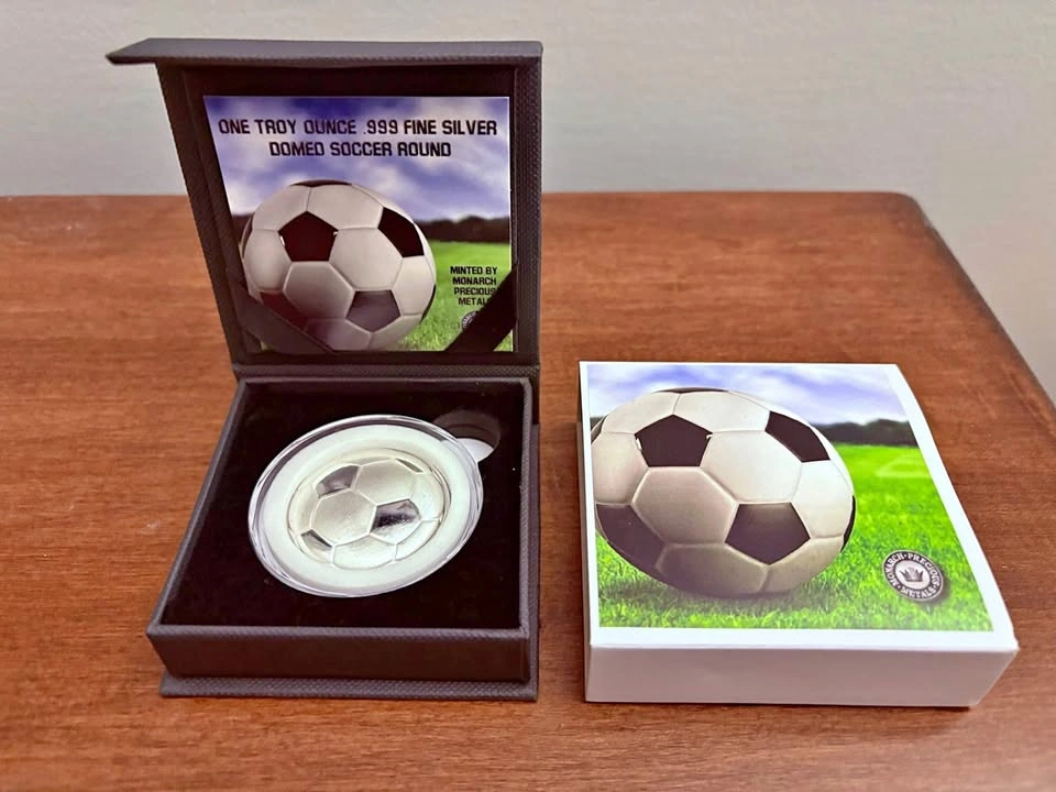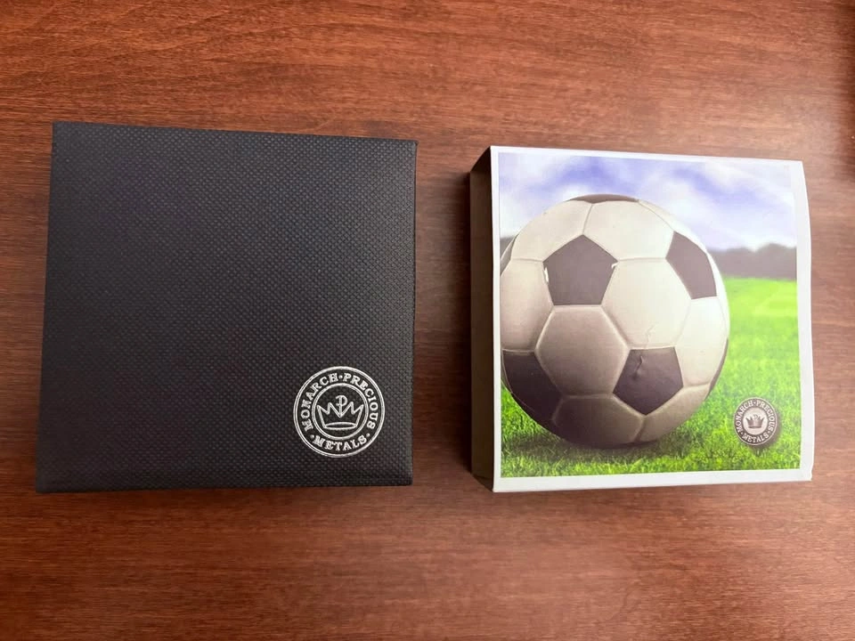 1 oz .999 fine silver soccer round minted by Monarch Precious Metals in Medford, Oregon with its own gift box, presentation card, and box sleeve as shown. The round also comes in its own air tight capsule. This is a very unique shaped round as it has a convex obverse that almost gives motion to the soccer ball hitting the net. Can meet in public place in Maple Ridge. Thanks! Price can be subject to change with significant market fluctuations in silver spot price.