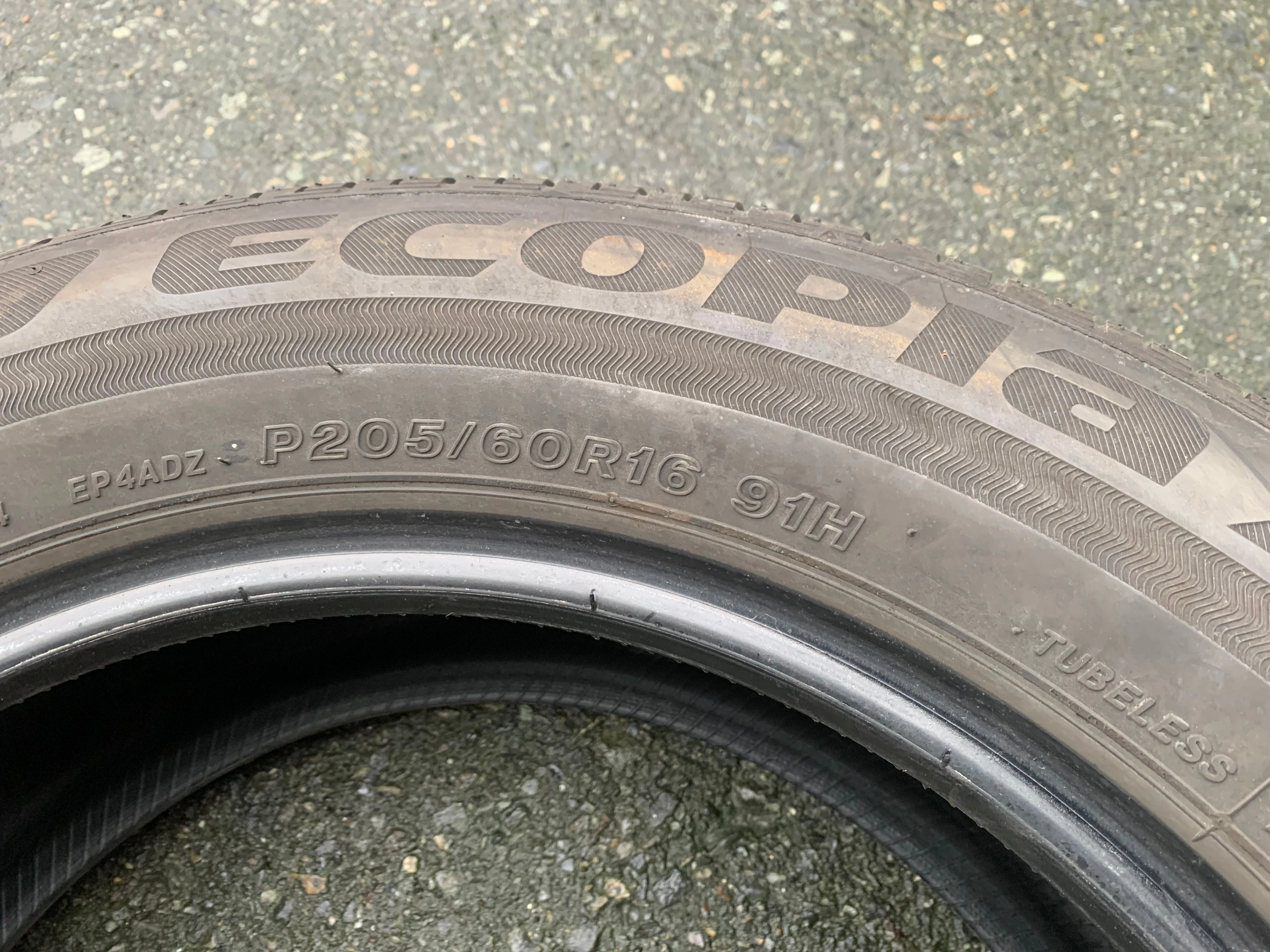 a nice bridgestone all season tire in great shape with good tread (1 TIRE ONLY) size 205/60/16 91H M+S Bridgestone ecopia EP422 plus with no repairs and 70% tread come grab it for only $120 or pay over $200 plus taxes for a new one huge savings take advantage $$$ come get the bargain $$$ (1 TIRE ONLY) I also have these tires available in the same size if interested:- 1 X 205/60/16 92V M+S Nordman Solstice np 95% tread 1 X 205/60/16 92H M+S Firestone FT140 np 90% tread 1 X 205/60/16 96H M+S Michelin X-Ice Snow np 85% tread we are located in Surrey BC but can also deliver into vancouver island or anywhere in canada or pickup locally in newton surrey or fleetwood surrey NOTE: Vancouver Island: victoria or nanaimo $15 FLAT RATE delivery charge (PER TIRE) if I have enough appointments booked to justify the trip cost to come over. leave ph no and Ill get you a date for expected delivery with this option. otherwise i can get you a shipping quote but will need a full ship to address.