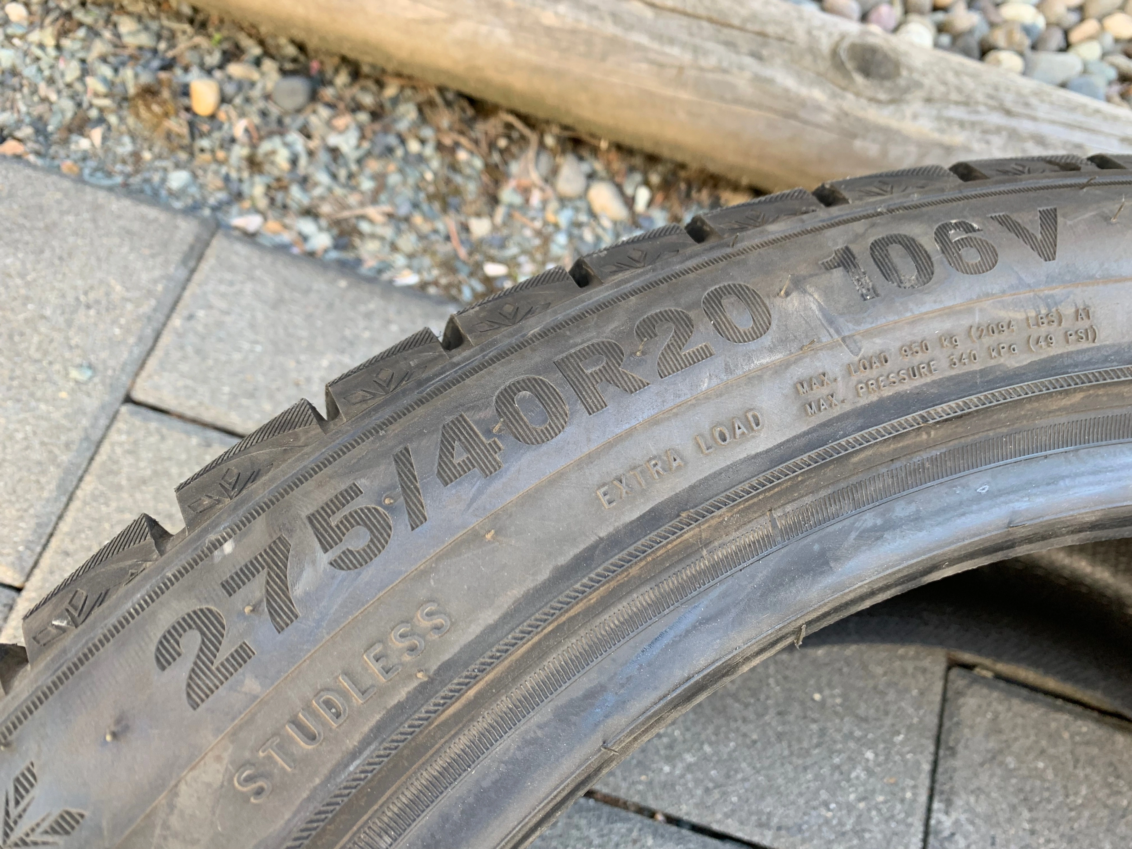 a nice winter tire with lots of tread almost like new (1 TIRE ONLY) size 275/40/20 106V M+S triangle SnowLink TWT02 with no repairs and 95% tread come grab it for only $160 or pay over $250 for a new one huge savings take advantage $$$ come get the bargain $$$ (1 TIRE ONLY) I also have these tires available in the same size if interested:- 1 X 275/40/20 106V M+S Yokohama Parada Spec X np 99% tread lnew 1 x 275/40/20 106W M+S Goodyear eagle sport A/S np 70% tread we are located in Surrey BC but can also deliver into vancouver island or anywhere in canada or pickup locally in newton surrey or fleetwood surrey NOTE: Vancouver Island: victoria or nanaimo $15 FLAT RATE delivery charge (PER TIRE) if I have enough appointments booked to justify the trip cost to come over. leave ph no and Ill get you a date for expected delivery with this option. otherwise i can get you a shipping quote but will need a full ship to address.