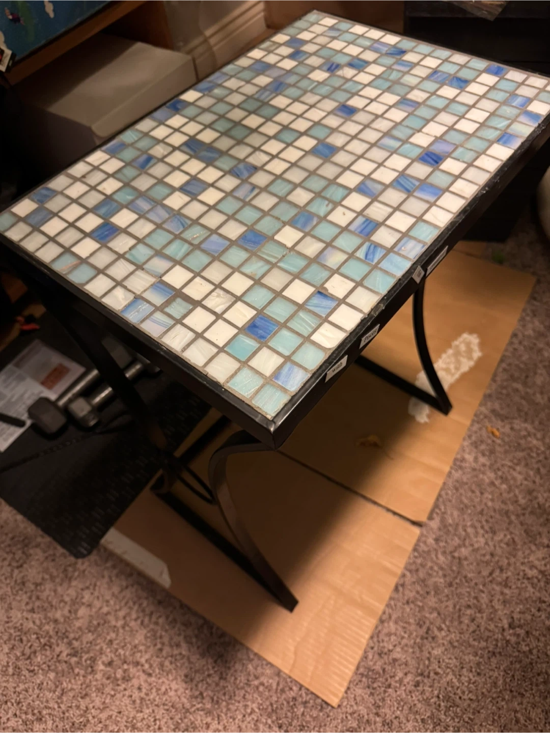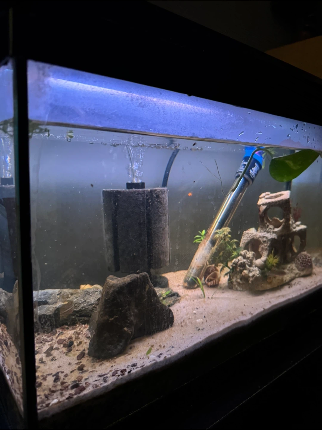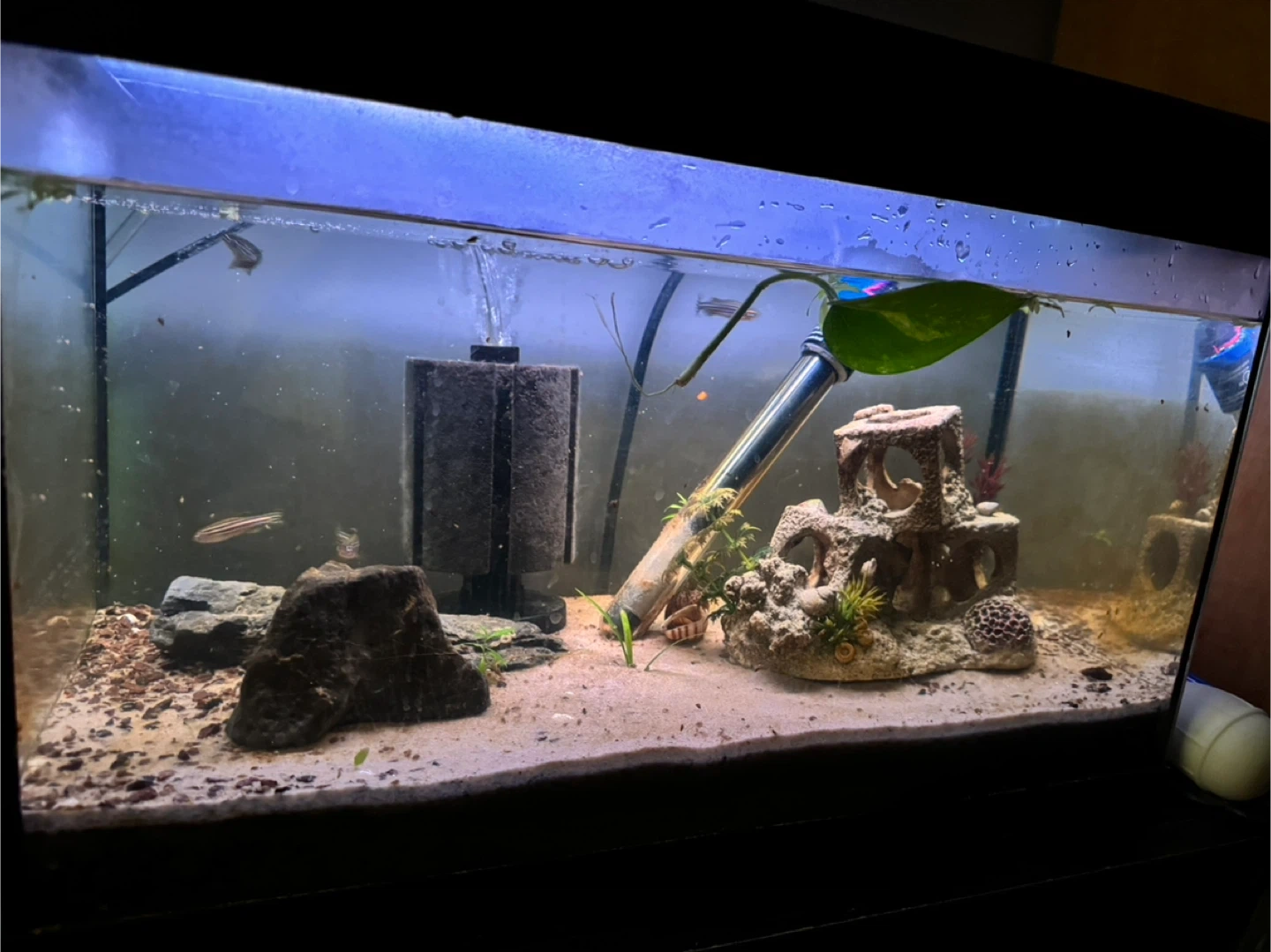 Downsizing - Established 10 gallon fish tank. Comes with aquarium substrate capped with sand, small plants, decor, four zebra danios, heater and air bubbler as per photo. Includes stand shown in photo, right now I have it setup on a different table. (Light is not included as im using this one temporarily from another tank setup)