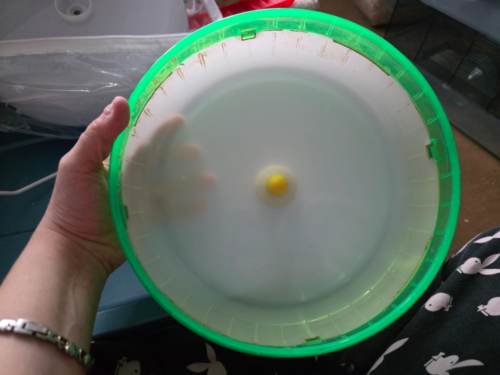 Selling a hamster exercise wheel with a green trim. It's in good condition and ready for a new furry friend to enjoy! Perfect for keeping your hamster active and entertained. Some staining as seen in image. Used to attach to a cage with bars.