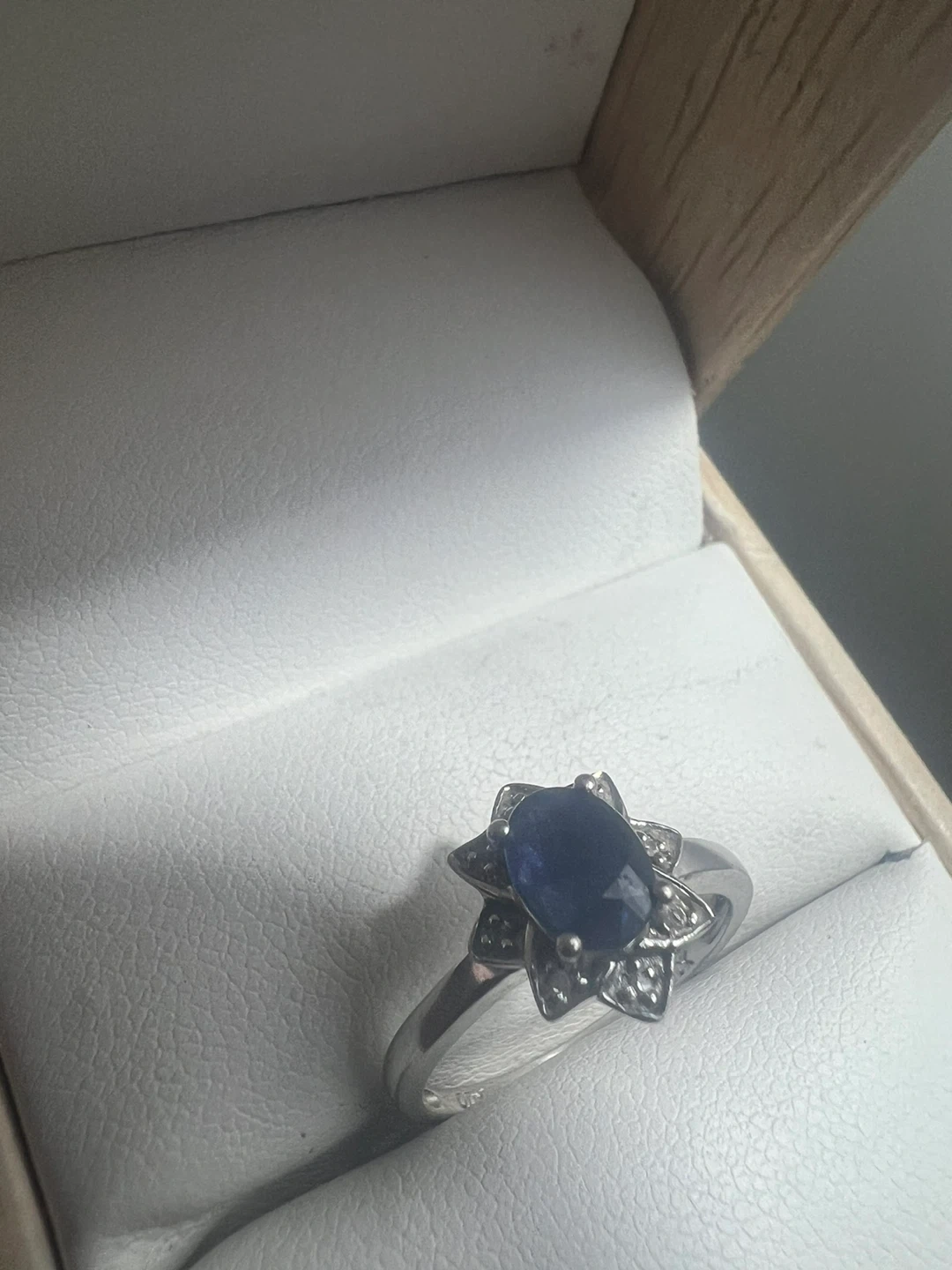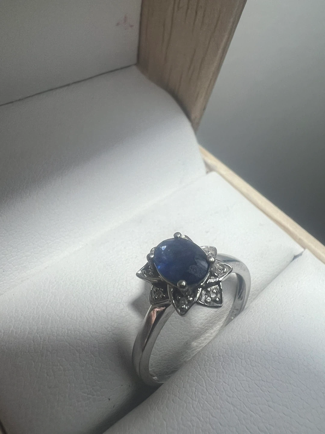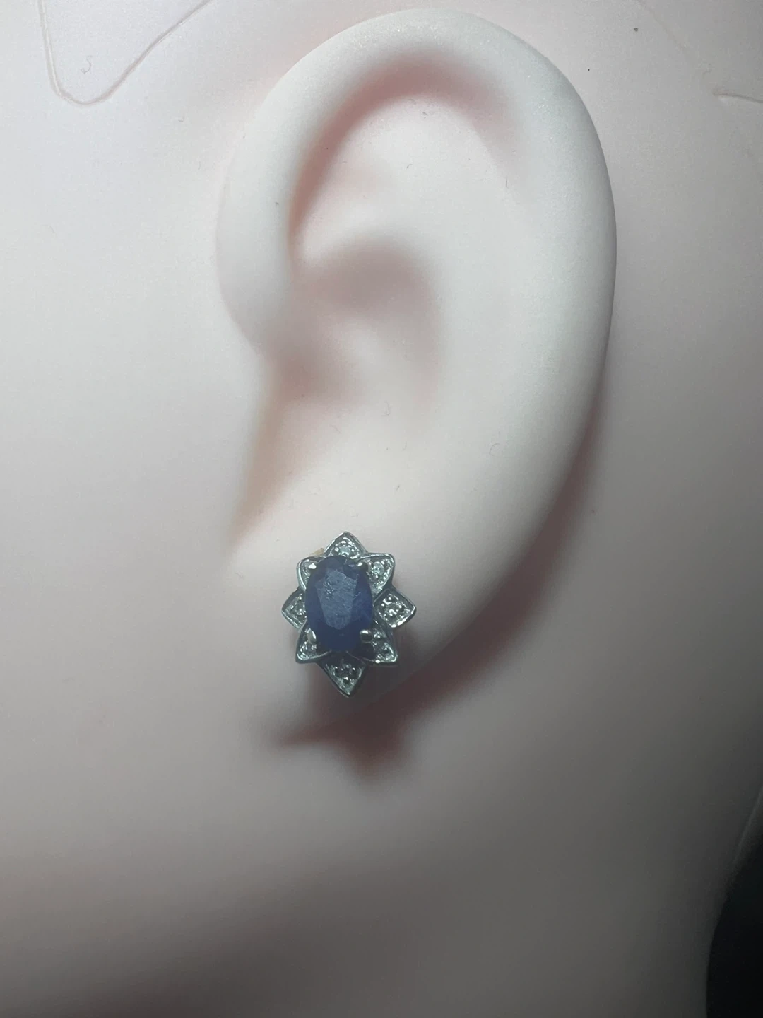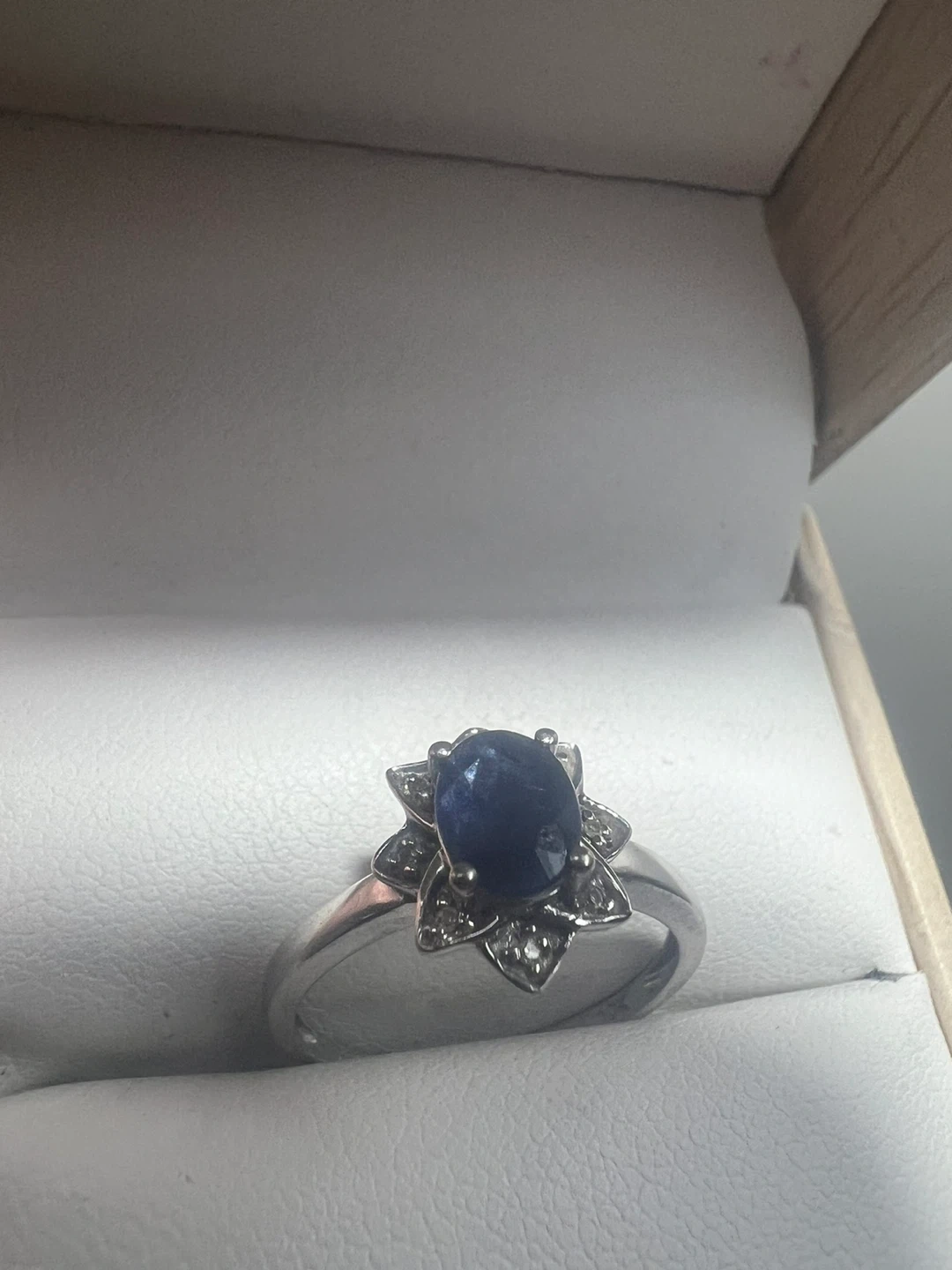 10 k white gold sapphire ring and earrings set. The set features a beautiful blue sapphire surrounded by diamonds in a floral design. Comes in a box!