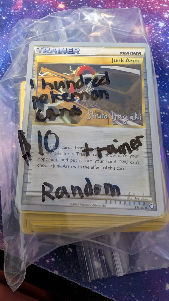 Selling 100 pokemon trainer cards for only $10. And completely random. there are some pretty nice cards!!!