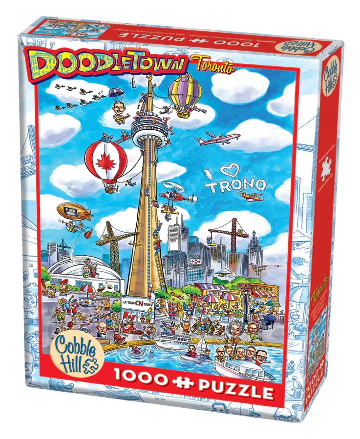 Finished size: 26.6” x 19.3” (67.6 x 48.9 cm). Includes original box with all 1000 pieces. Fun and detailed illustration featuring the CN Tower and quirky characters, including a buck-toothed beaver waving the Canadian flag. From a smoke-free, pet-free home.