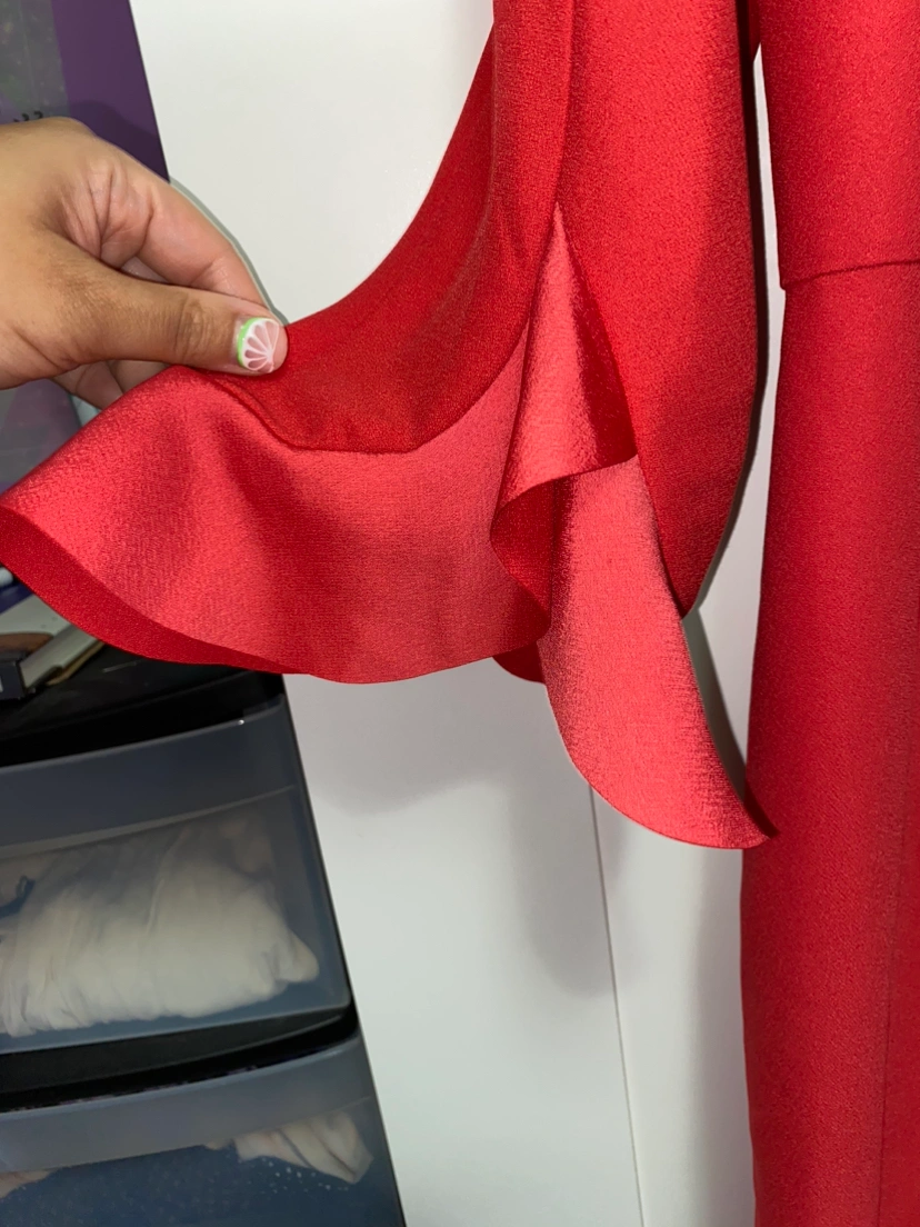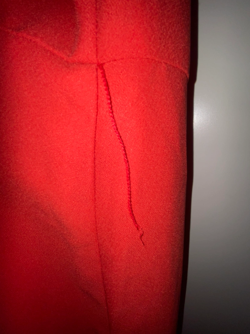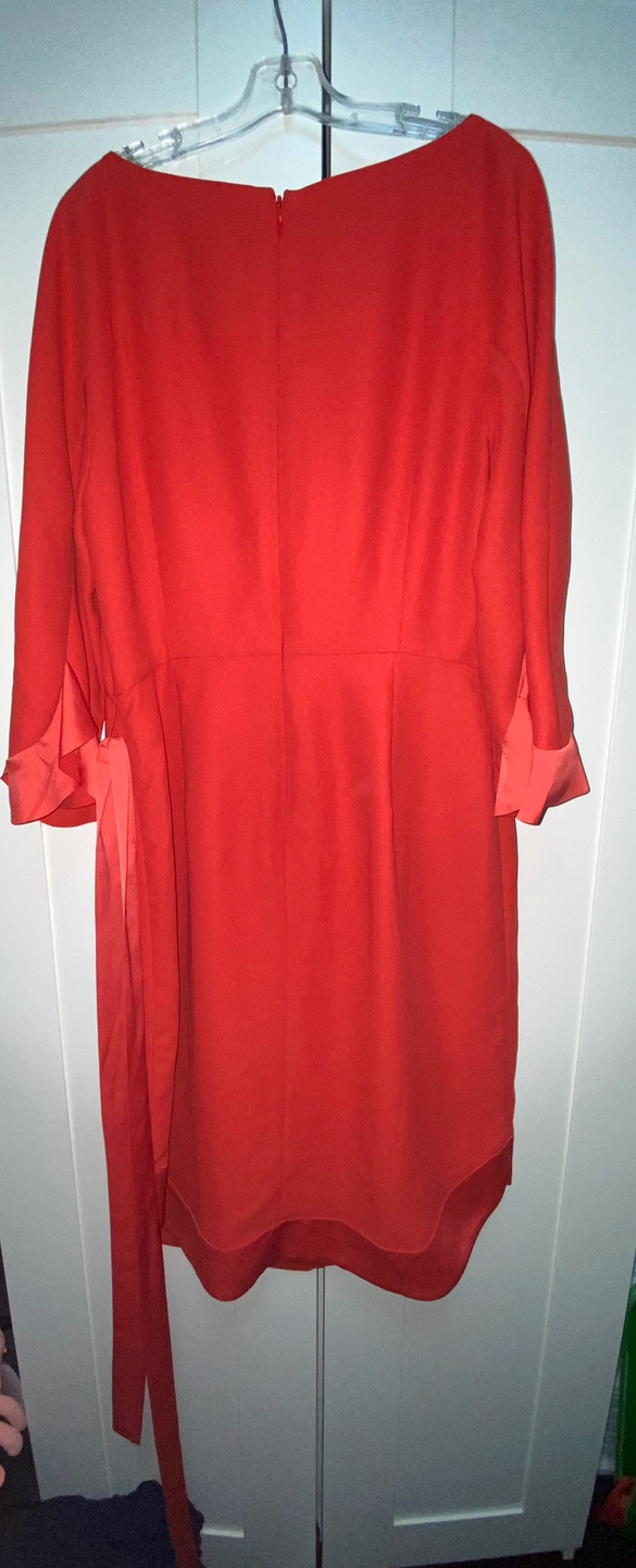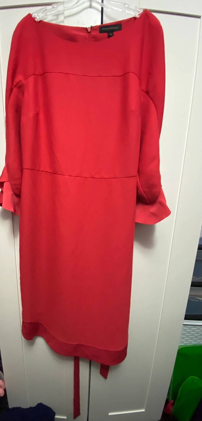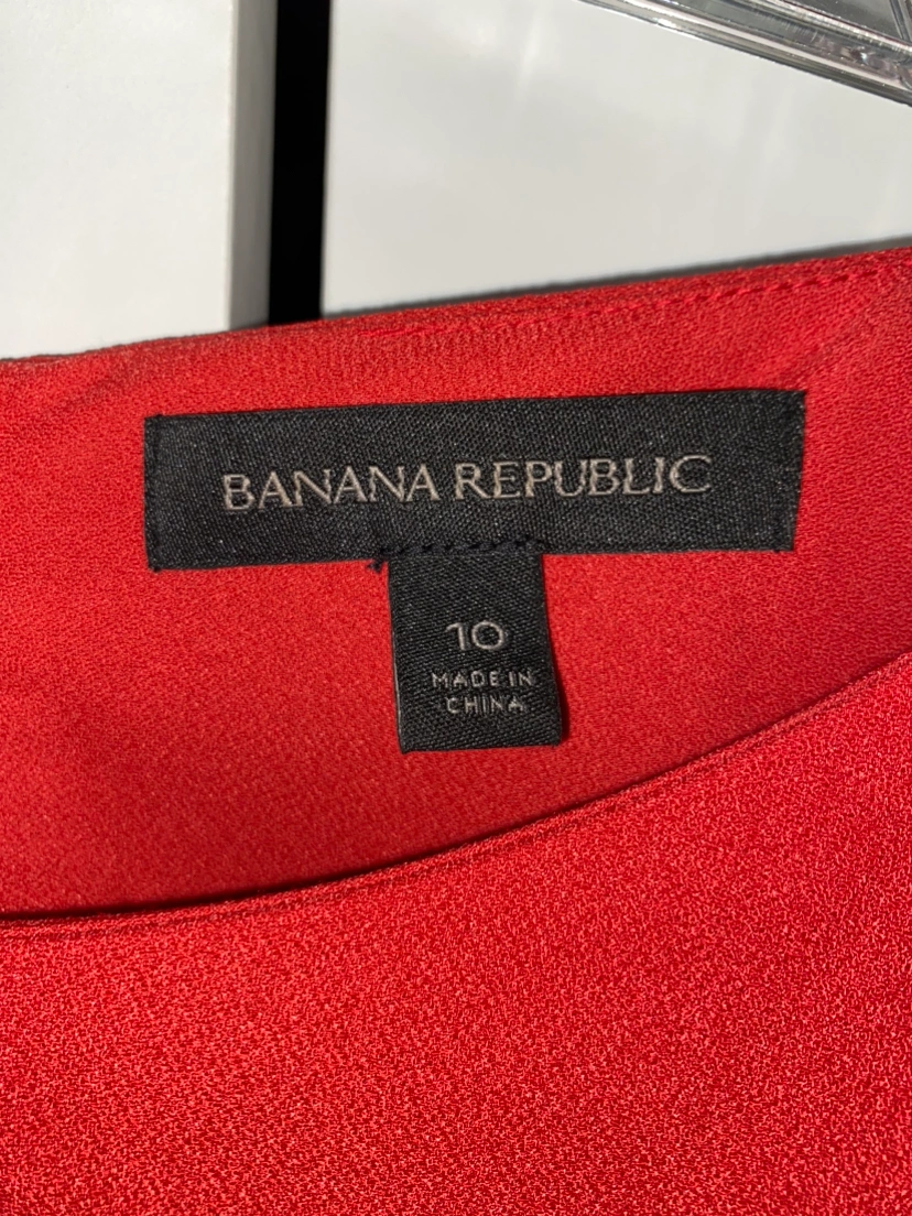 Glow a beautiful shade of red in this Banana Republic dress. It features unique tulip sleeves and a tie around the waist. Only imperfection to show is in the last image, the tie loop is ripped on one side of the dress - the right side. This will not impact how you wear the dress!