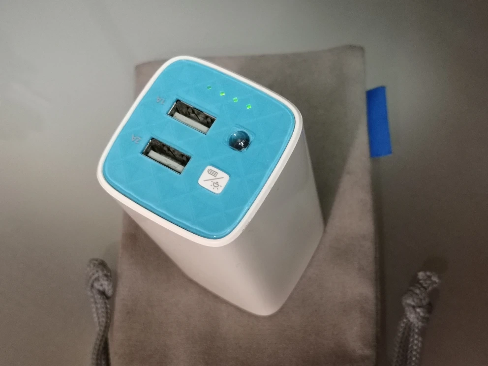 TP-Link 10400 mAh Model: TL-PB10400 - in : USB Mini - 1x USB = 2A - 1x USB = 1A - Compatible with 5V input devices. - 4 green LEDs to display the battery capacity. - Built-in tiny flashlight on the top face. The device includes built-in safety features like protection against short circuits, over-voltage, over-current, over-charge, over-discharge, and over-heating. - With bag - No cord