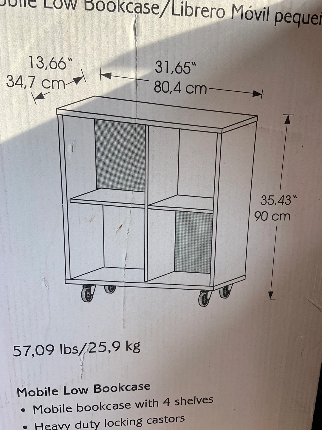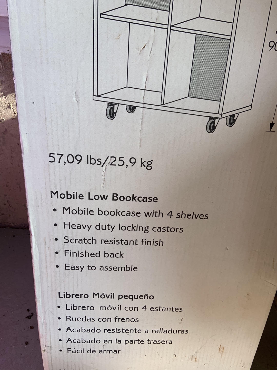 Retails for $70 + tax Brand new mobile low bookcase with 4 shelves. I believe it’s a beige color but not 100% sure See pics for exact measurements Cash only. Pick up at Bloor & Church