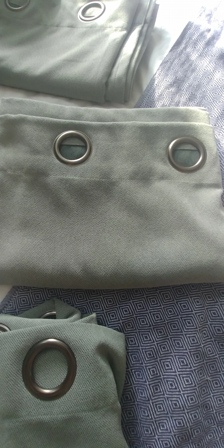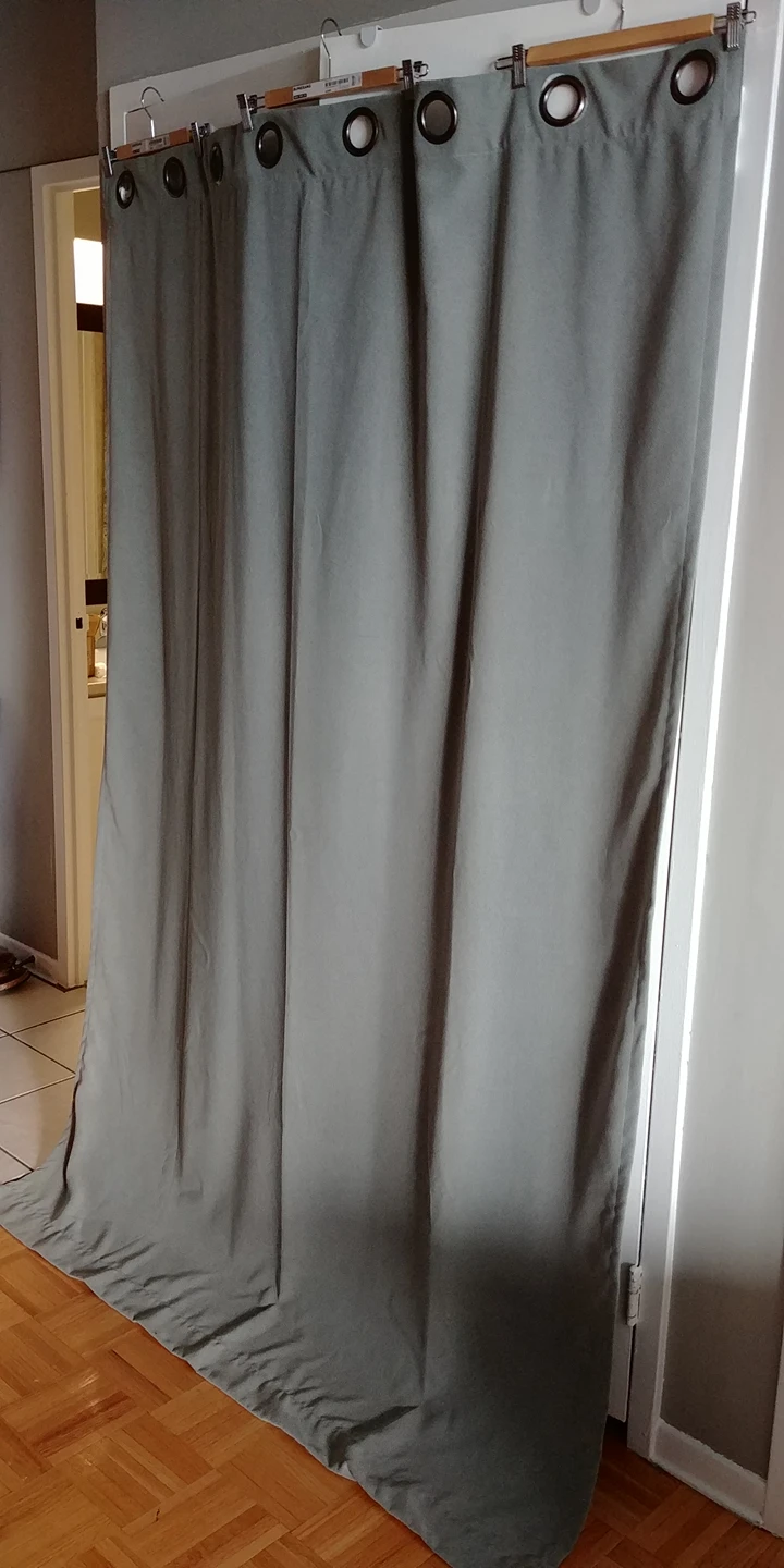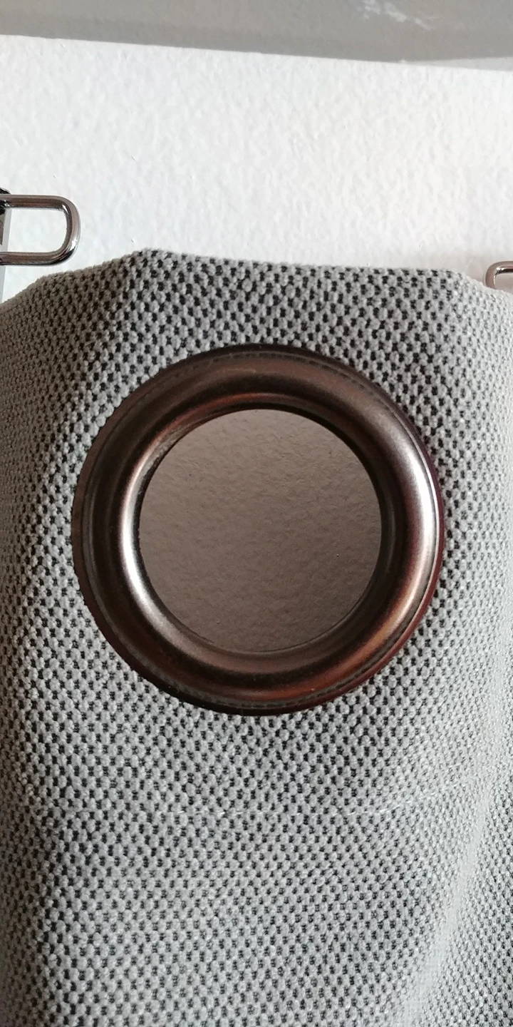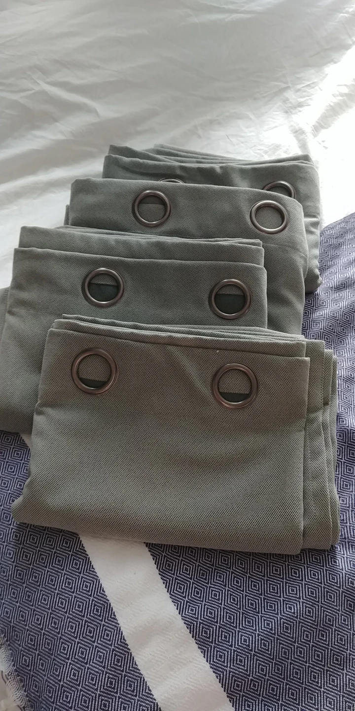 4 curtain panels in a light greyish blue with silver sturdy grommets that fit all curtain rods. pictured 1 of 4 hanging. 53 inches in width x 7 feet long each all freshly washed. little bit of sun fading on the back. non smoking home. very clean.
