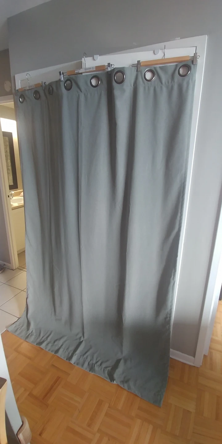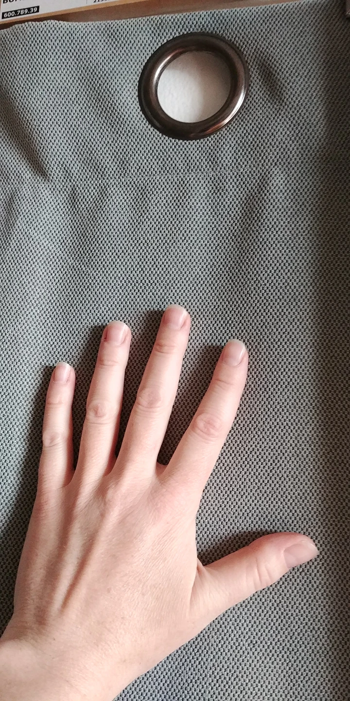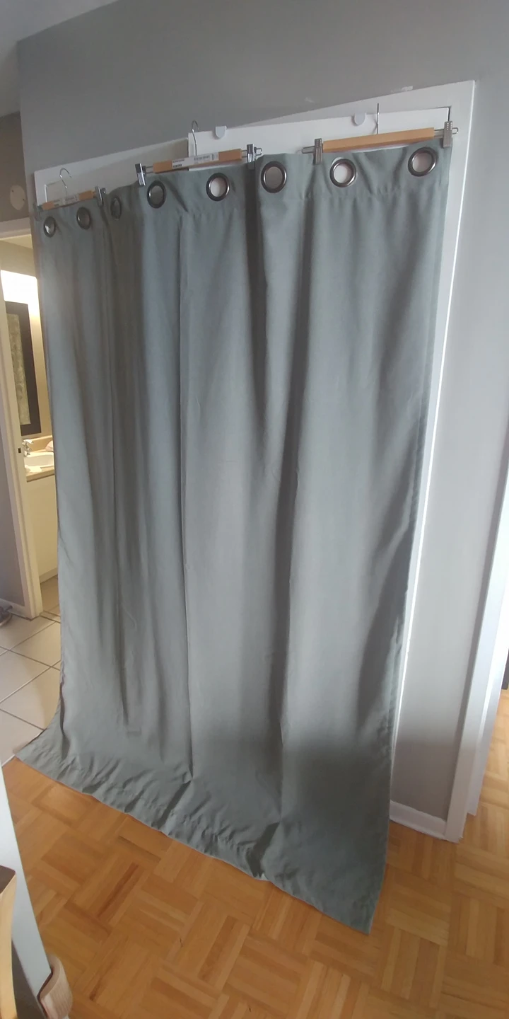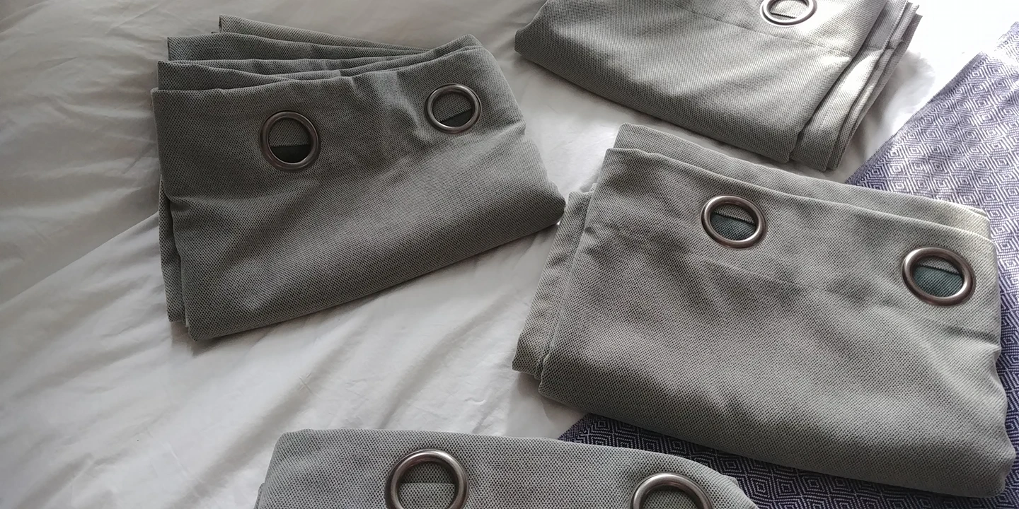 4 curtain panels in a light greyish blue with silver sturdy grommets that fit all curtain rods. pictured 1 of 4 hanging. 53 inches in width x 7 feet long each all freshly washed. little bit of sun fading on the back. non smoking home. very clean.