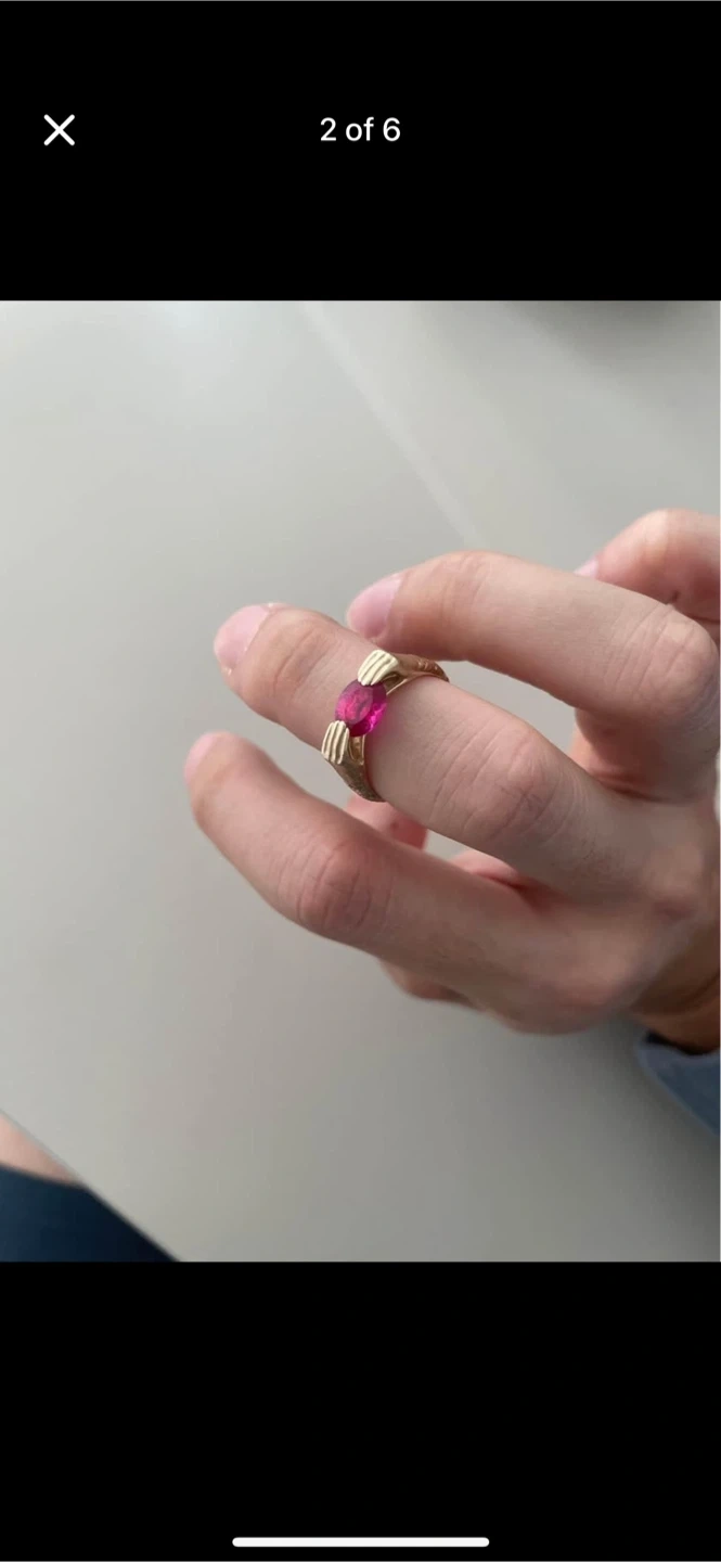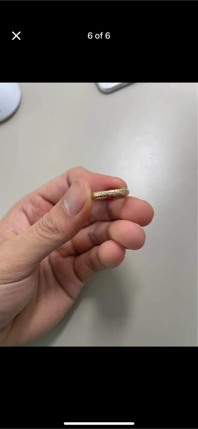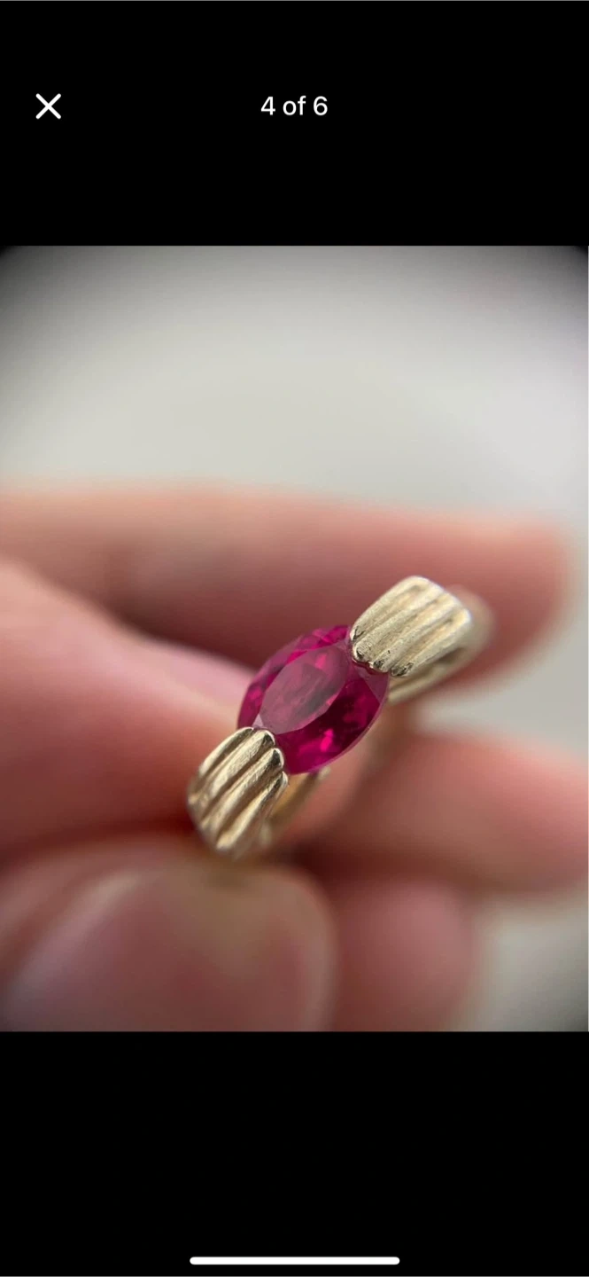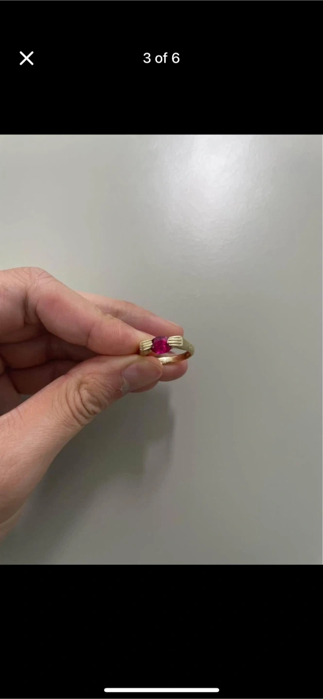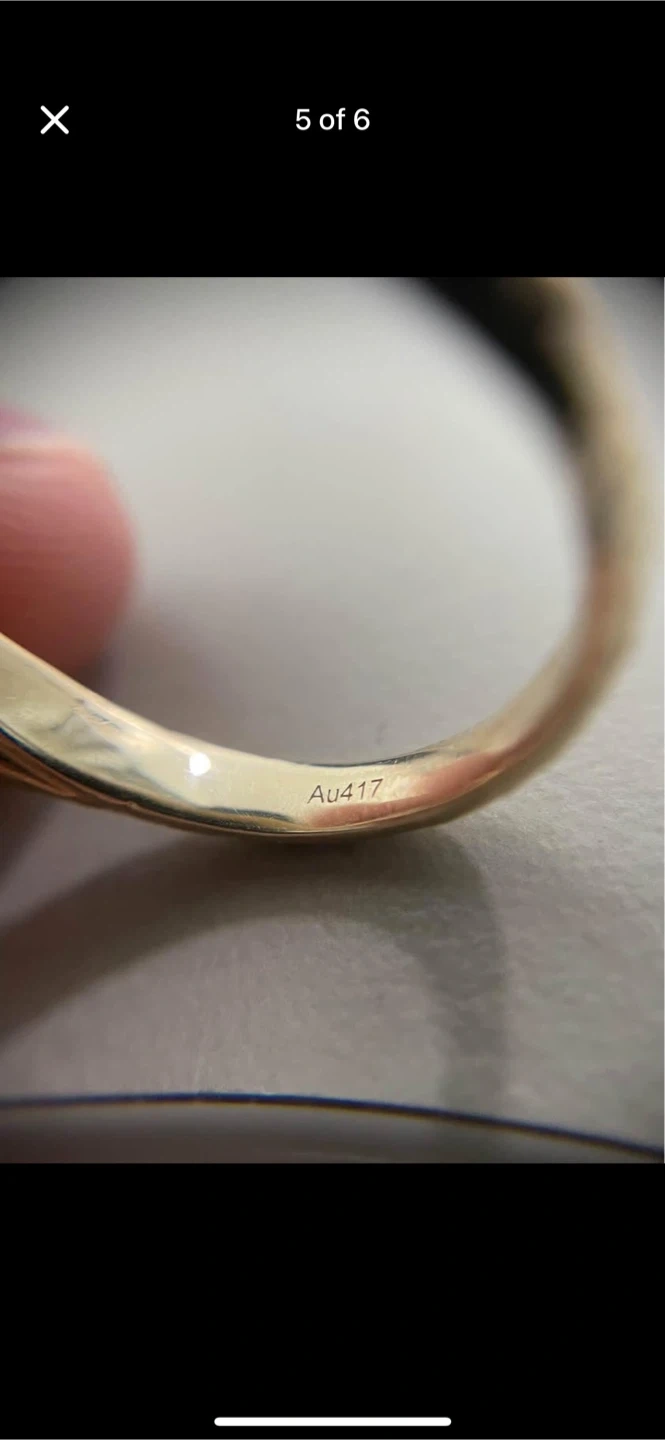Size: 7.3 diameter 17.6mm 4g of 10k gold, 1.5 caret of sapphire Selling a beautiful gold ring featuring a striking ruby stone. The ring is marked with 'AU417', indicating its gold content. It's a lovely piece that would make a great addition to any jewelry collection