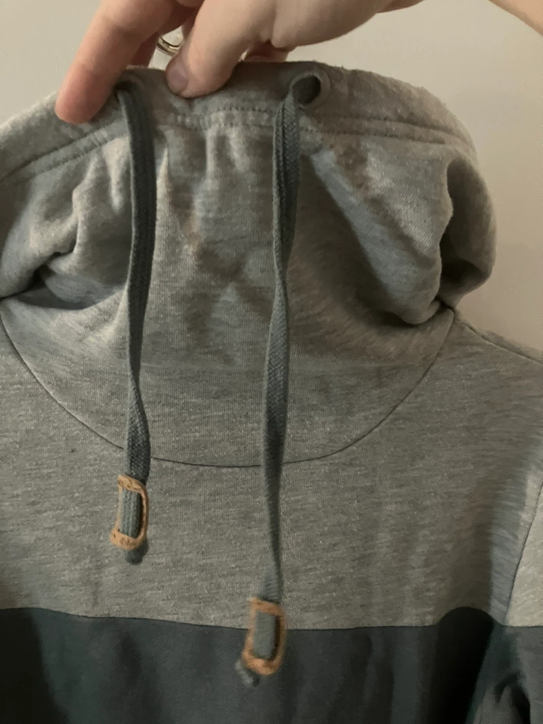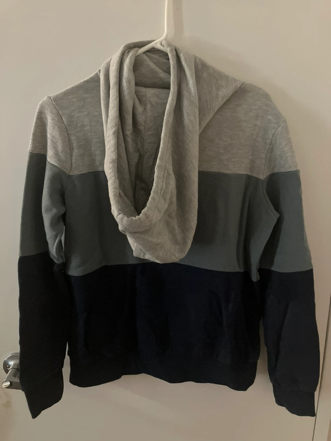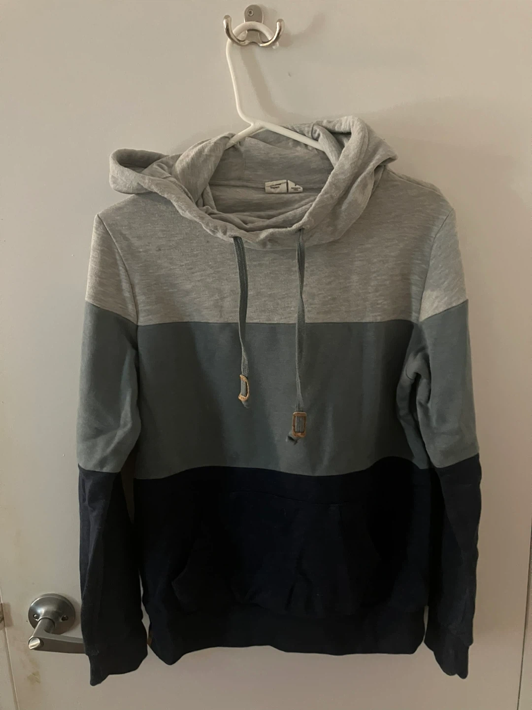 Selling a Ten Tree hoodie in a stylish grey and navy colour block design! It's in great condition and super comfy for those cooler days. The hoodie features a drawstring and a cozy hood, perfect for casual wear.