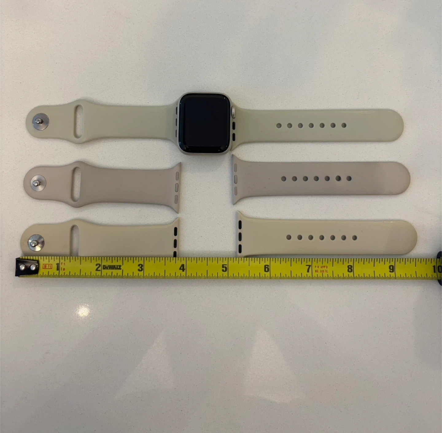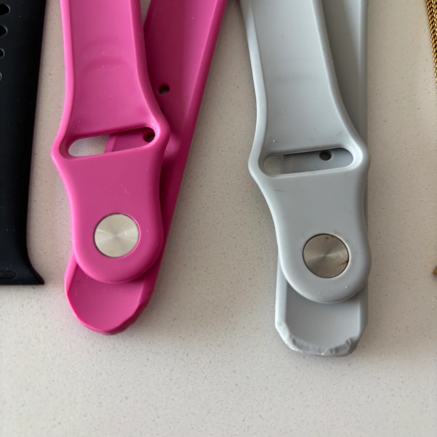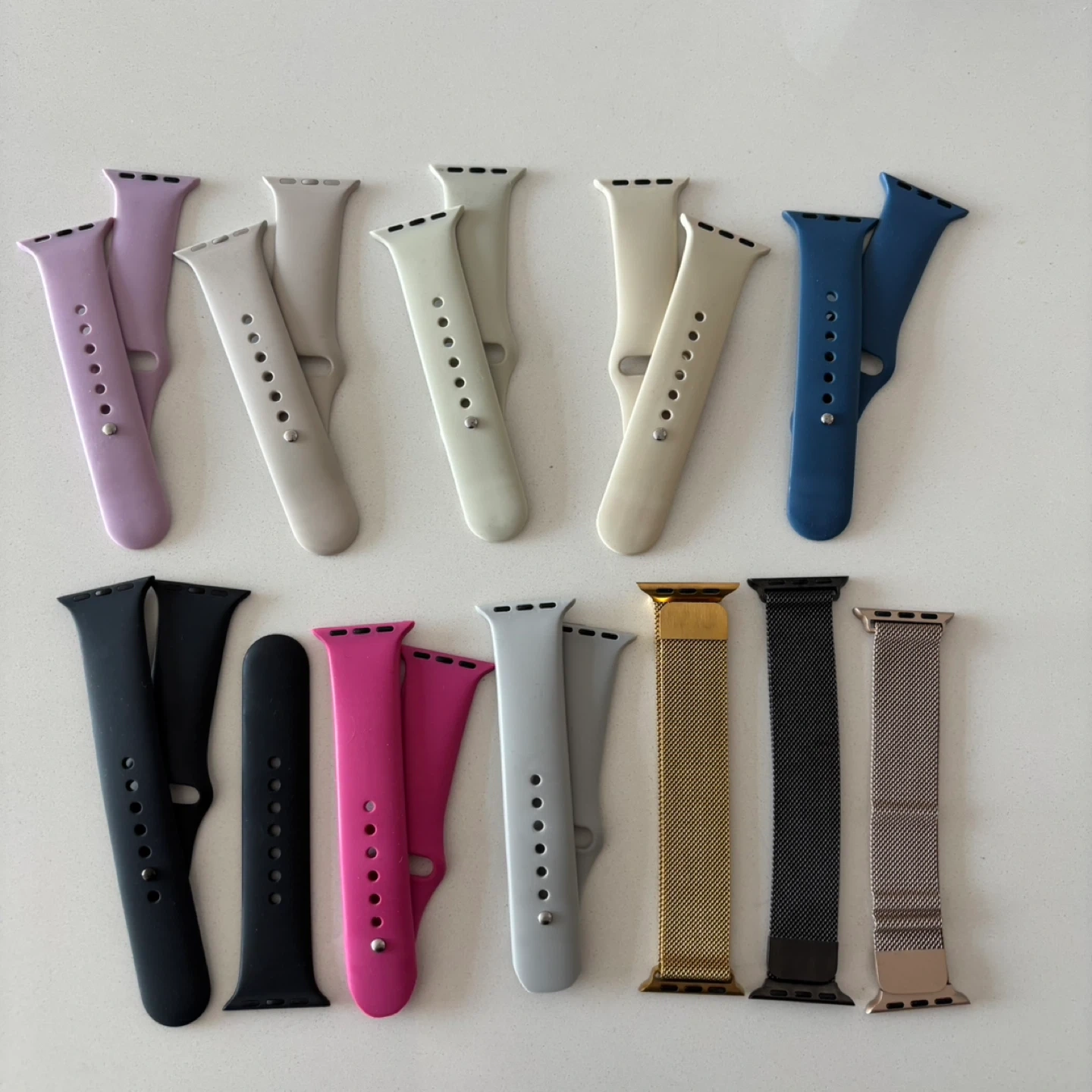 A selection of Apple Watch bands in various colours and styles! These bands are compatible with Apple Watches. Check out the pictures to see the different colours and styles available *All are $5 each as they are not official Apple bands. The Black is Apple branded and has an extended wrist band so That one is $15 if you just want the one. The pink and they grey on bottom row were cut with scissors as the band was too long so they are $2 each. Fits with Apple Watch SE & compatible 40mm models.