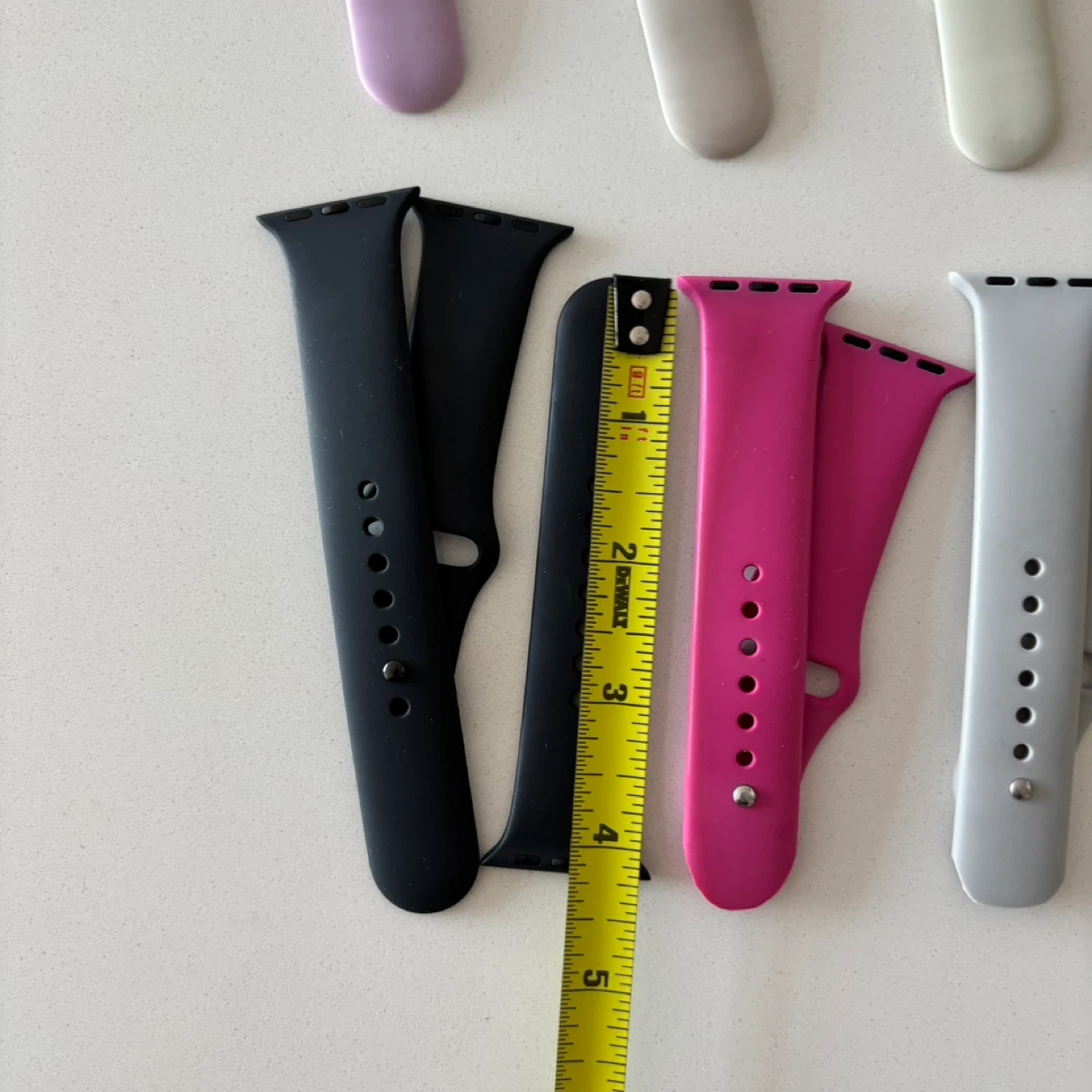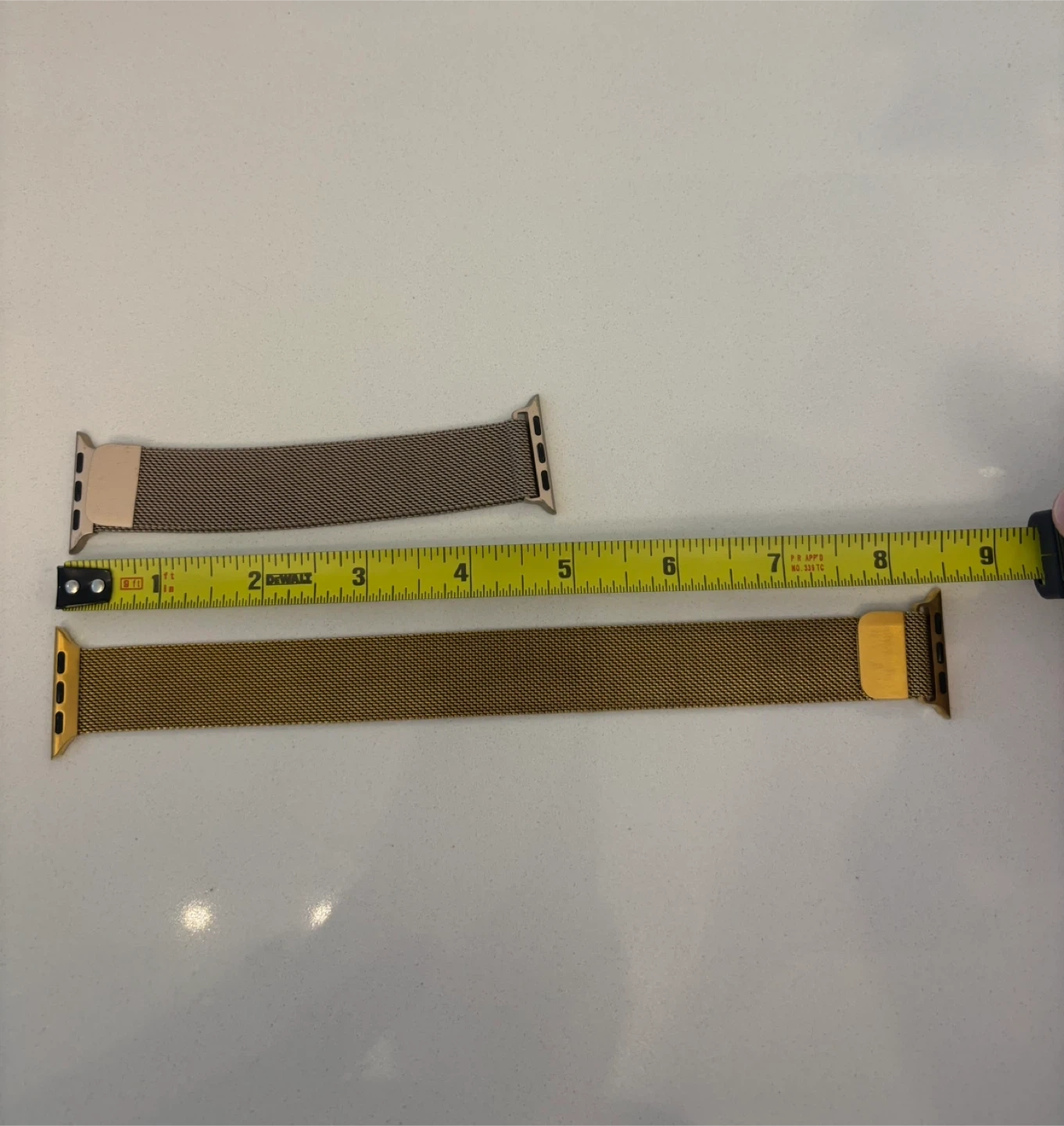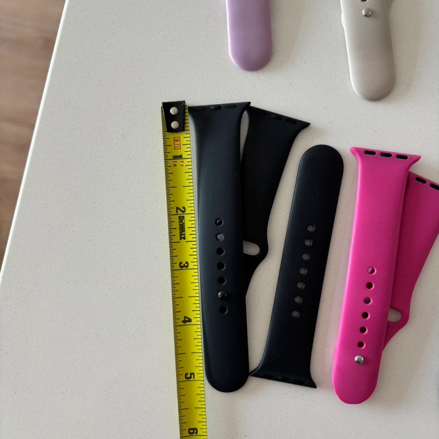 A selection of Apple Watch bands in various colours and styles! These bands are compatible with Apple Watches. Check out the pictures to see the different colours and styles available *All are $5 each as they are not official Apple bands. The Black is Apple branded and has an extended wrist band so That one is $15 if you just want the one. The pink and they grey on bottom row were cut with scissors as the band was too long so they are $2 each. Fits with Apple Watch SE & compatible 40mm models.
