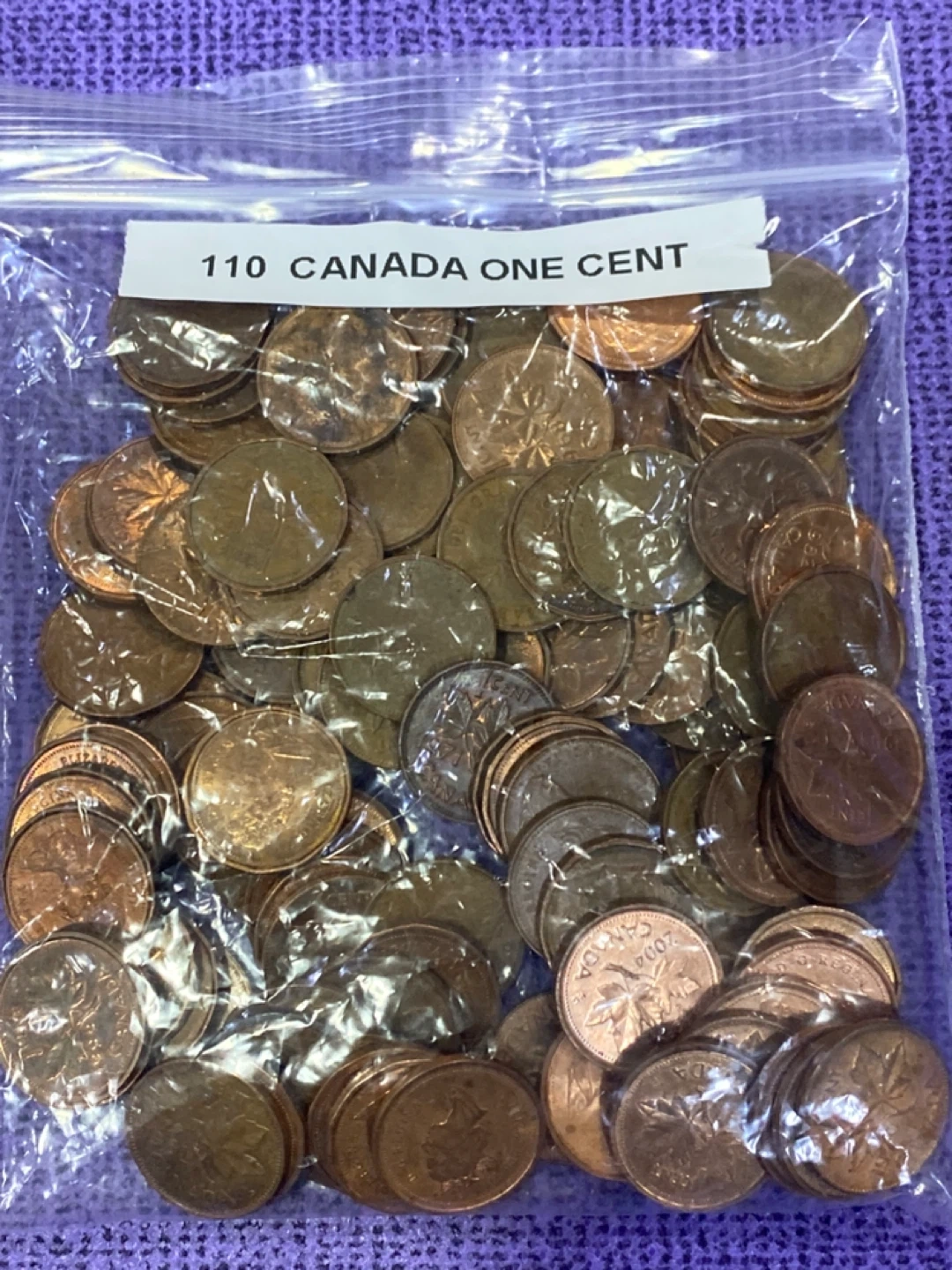 Selling a collection of 110 Canadian one cent coins. They are in circulated condition and would be great for a collector or for crafts!