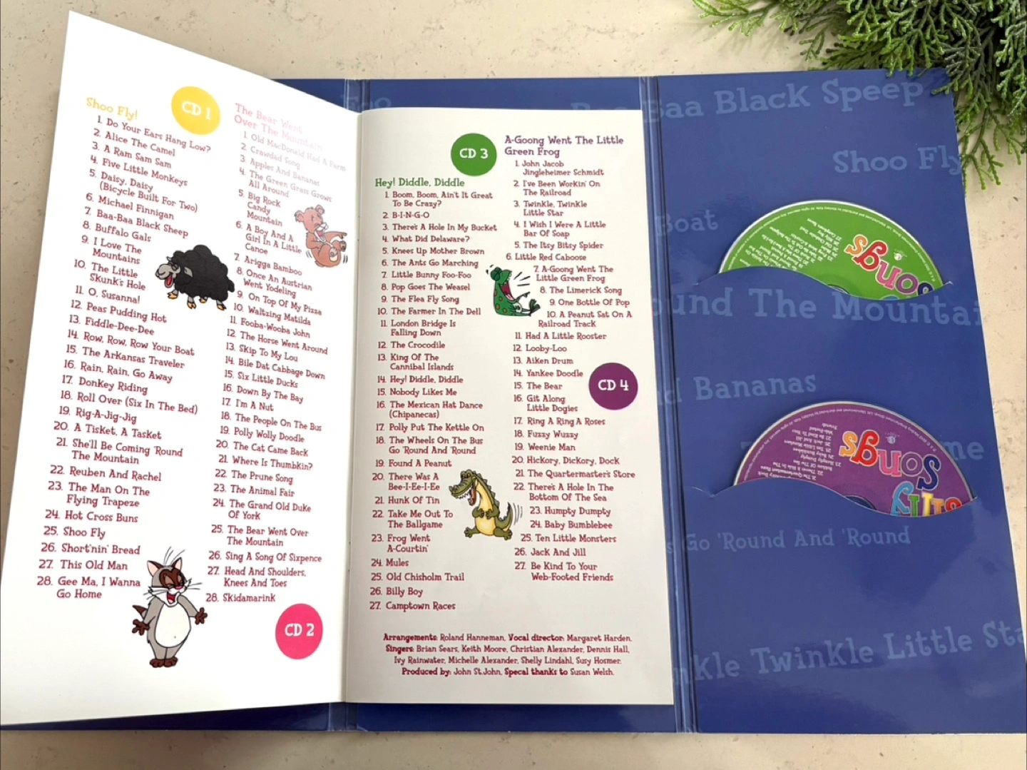 Selling a 110 Silly Songs CD collection for kids! This set includes multiple CDs with classic children's songs like 'Yankee Doodle,' 'Baa Baa Black Sheep,' and 'Old MacDonald Had A Farm'. Perfect for car rides or playtime at home