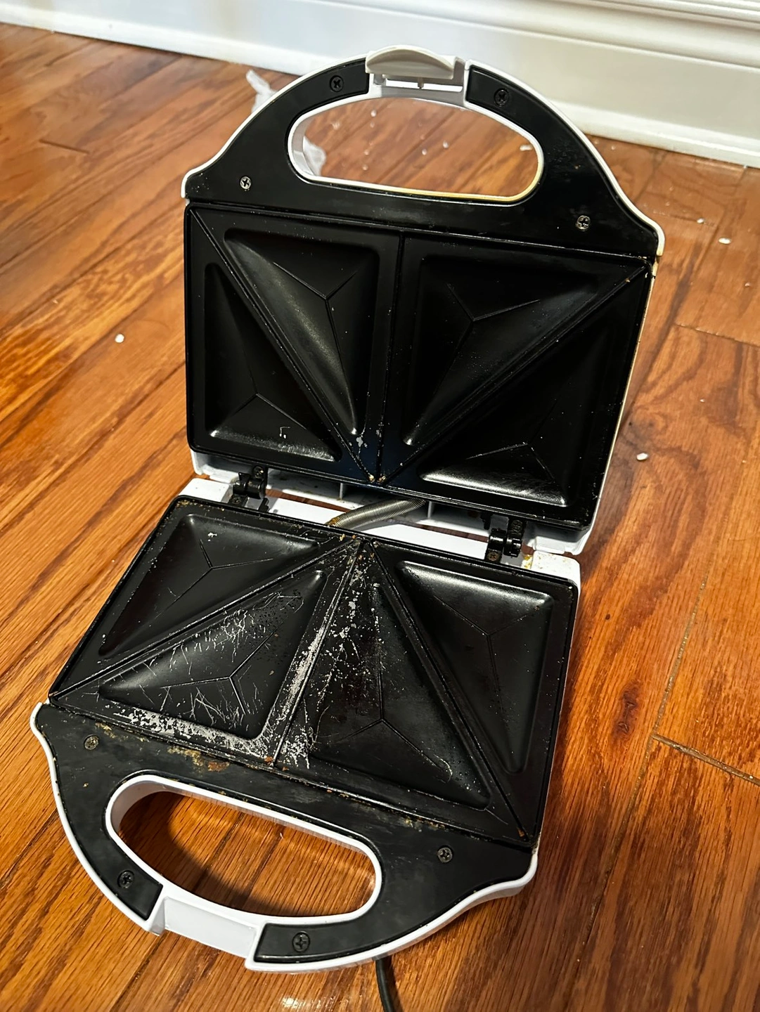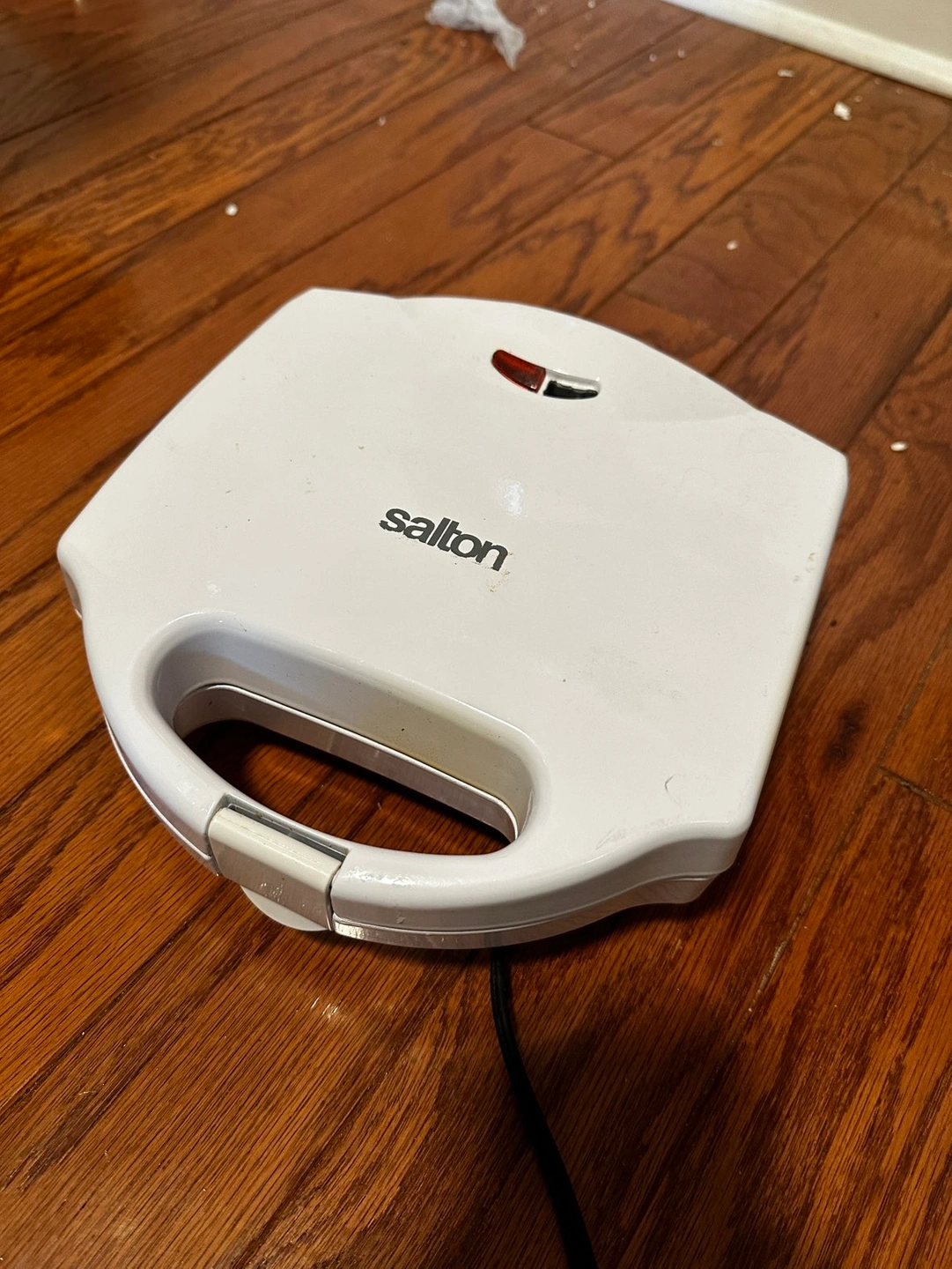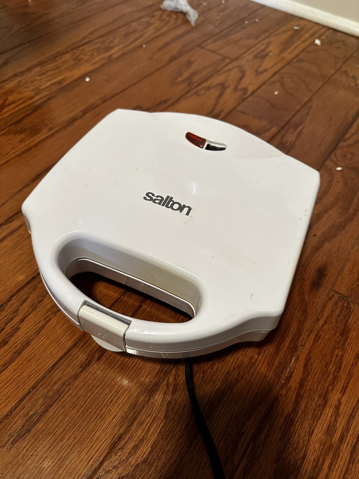A panini press for your sandwiches. I cleaned it but it’s a bit old and one of the lights is broken. It works just fine. Good if you just moved and just need one in the mean time. Please clean it again with food grade soap or something before use.