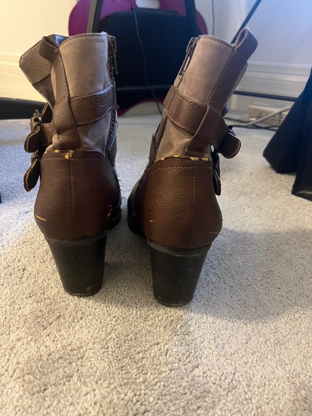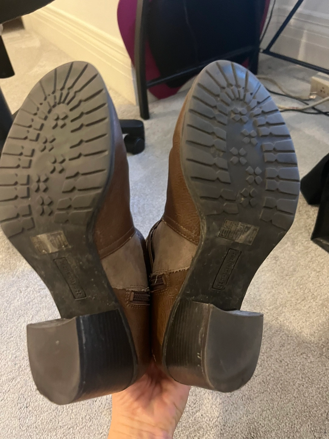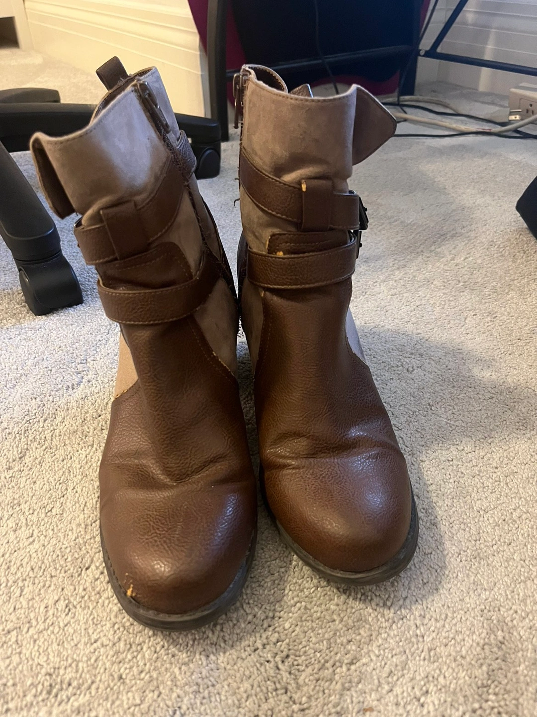 These brown boots are size 9 1/2. Perfect with jeans or dress pants.