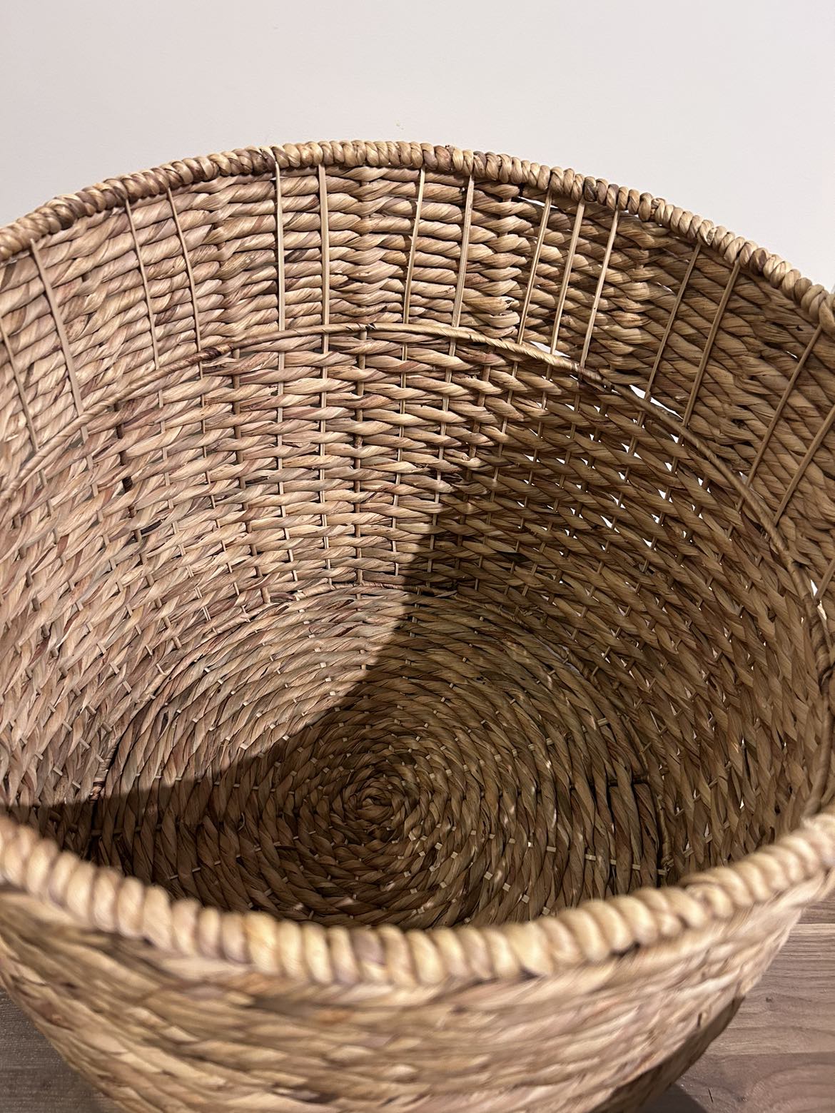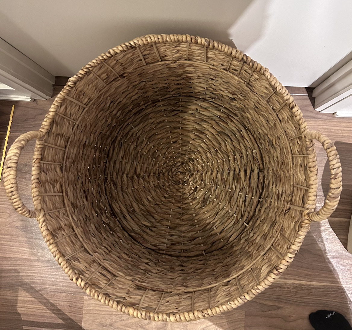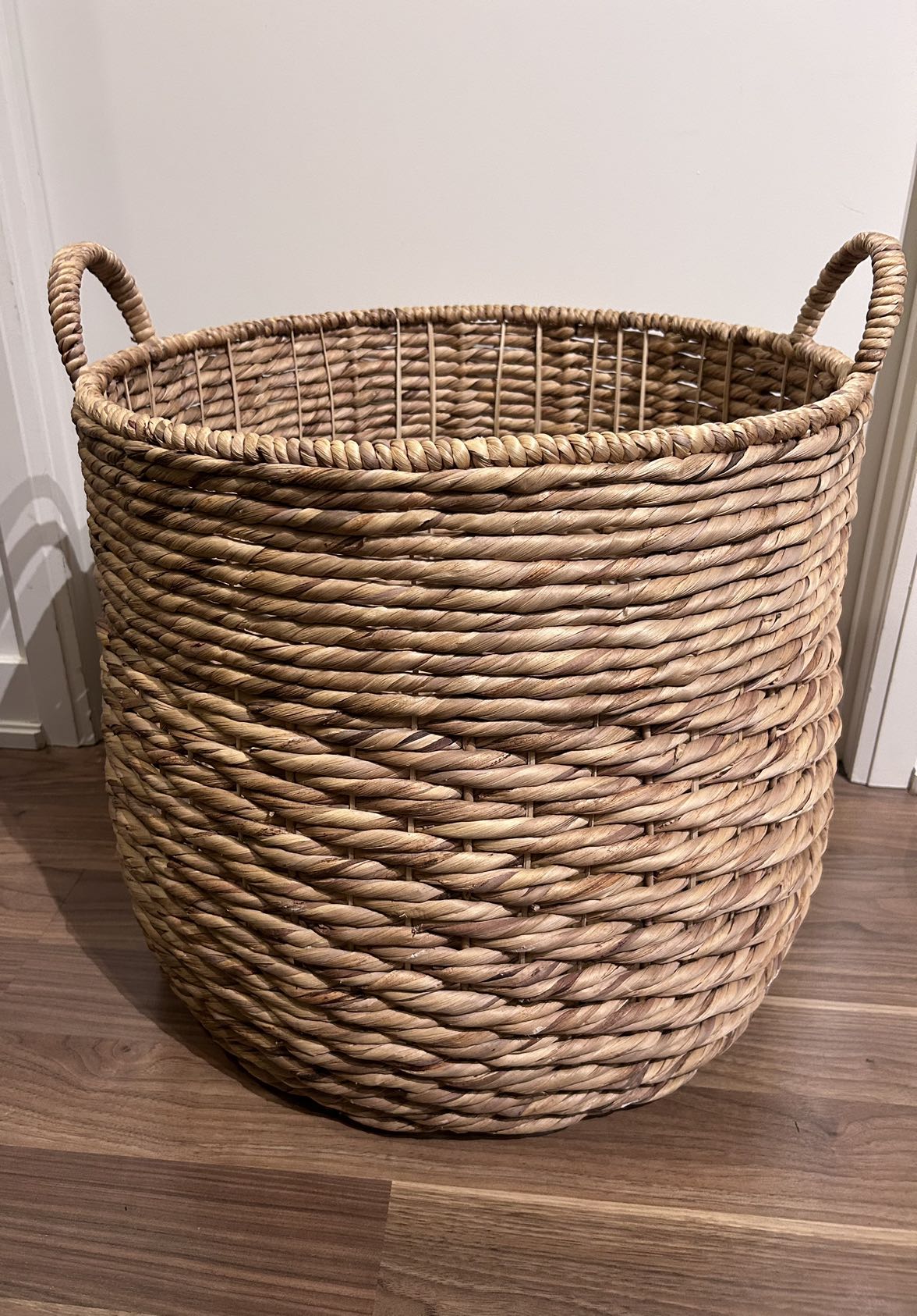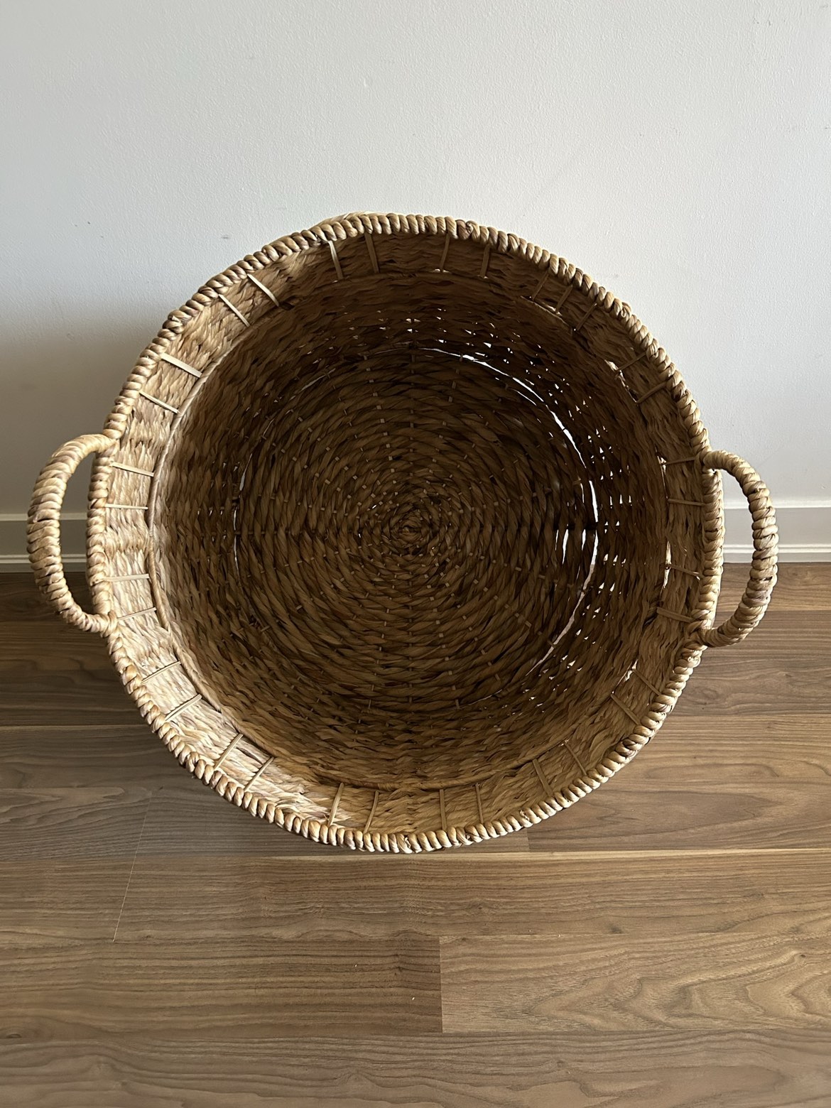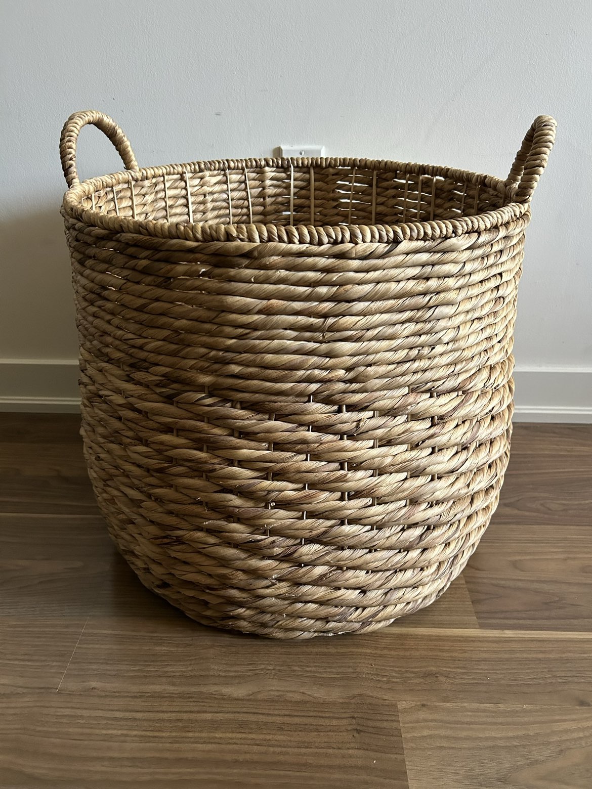 Impressive large wicker basket in excellent condition! 20 inches wide & 18 inches tall ๐งบ This can be used for so many things! Store your workout or yoga equipment in it, pillows and/or blankets. It can be a stylish laundry hamper or simply put it by your entrance and toss outdoors items in it. Whatever you need, this basket can provide!