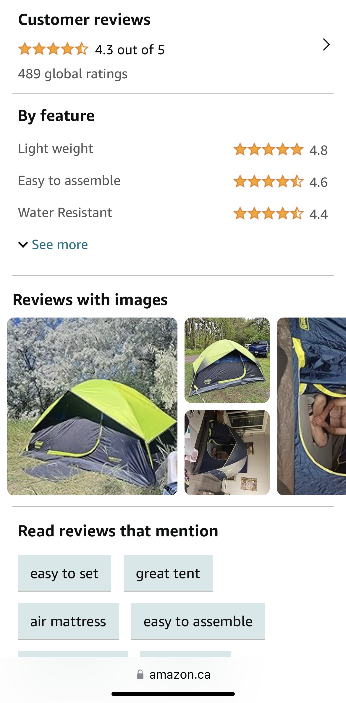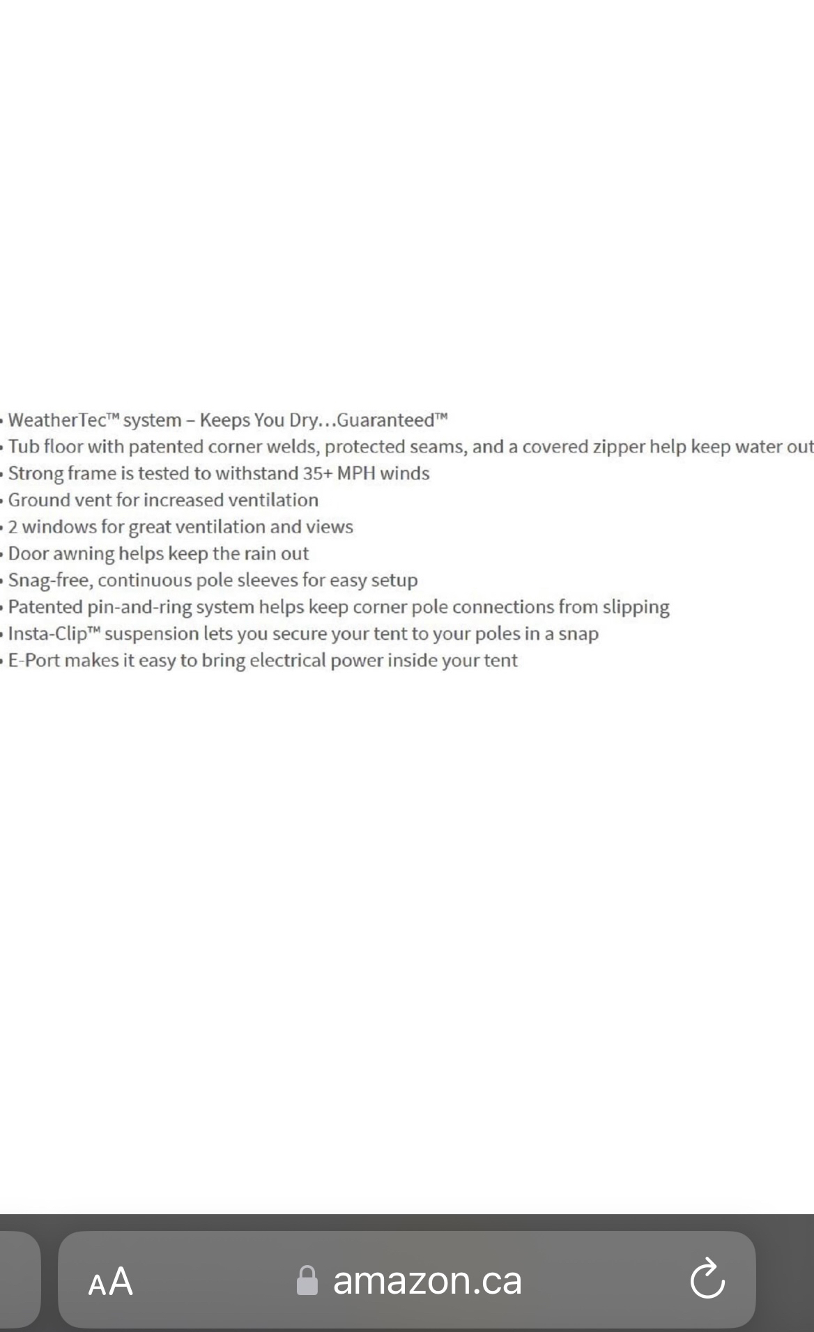 Used only once! Are you ready for the best camping experience. ๐๐๏ธ๐ฒ โข Size: 7โx7โx 52". Sleeps 3, fits 1 queen size airbed โข Weathertec system โ patented welded floors and inverted seams help keep water out โข 2 windows for great ventilation and views โข E-Port makes it easy to bring electrical power inside your tent โข Storage pockets to keep your gear organized https://www.amazon.ca/The-Coleman-Company-2000026057-6-Person/dp/B018E8DLP0/ref=asc_df_B017NGQN04/?tag=googlemobshop-20&linkCode=df0&hvadid=292987880877&hvpos=&hvnetw=g&hvrand=8180679024576809762&hvpone=&hvptwo=&hvqmt=&hvdev=m&hvdvcmdl=&hvlocint=&hvlocphy=9000945&hvtargid=pla-435802774205&psc=1&th=1 See less