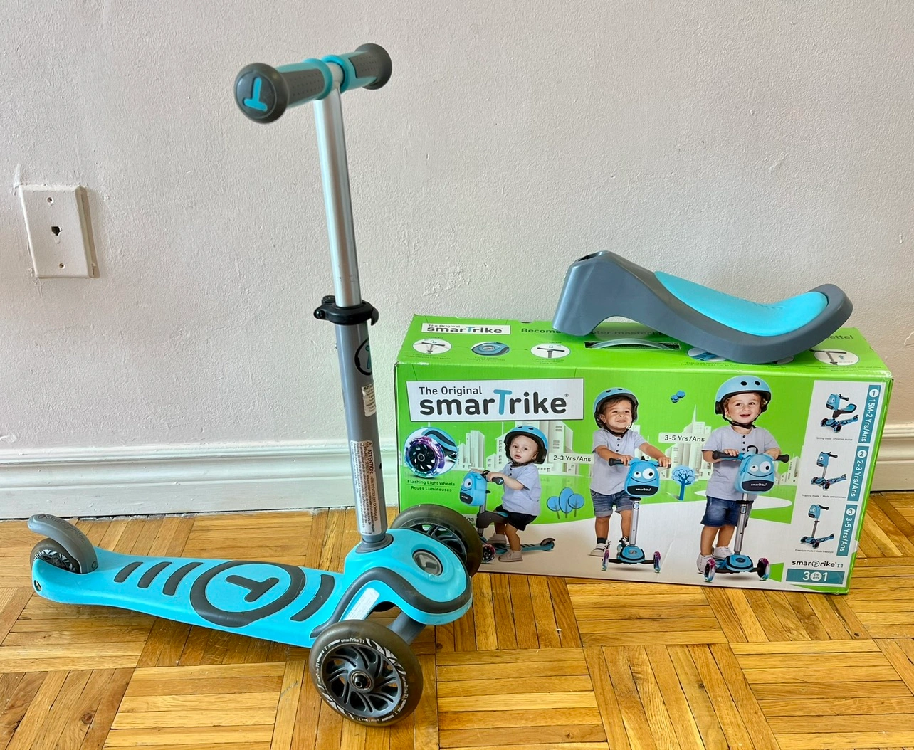 SmarTrike T1 3-Stage Scooter Blue is a good condition. As you can see in the photo there are small scratches on the front, otherwise good. Here you could some links for this scooter: https://www.amazon.ca/smarTrike-Toddler-Scooter-Girls-Years/dp/B0BH41H4FQ https://www.walmart.ca/en/ip/smartrike-t1-3-stage-scooter-blue-15-months/6000201392340 Pick up from Mississauga, intersection between Bloor Street and Tomken Road