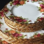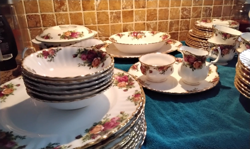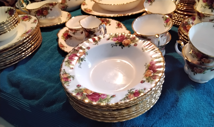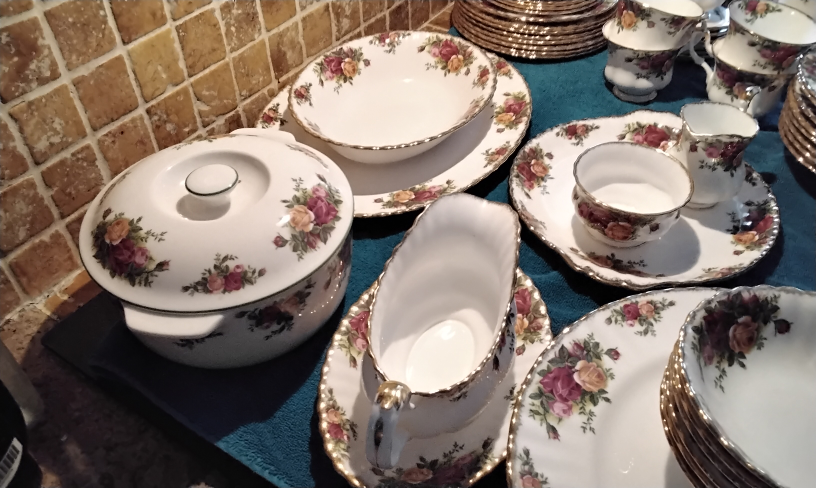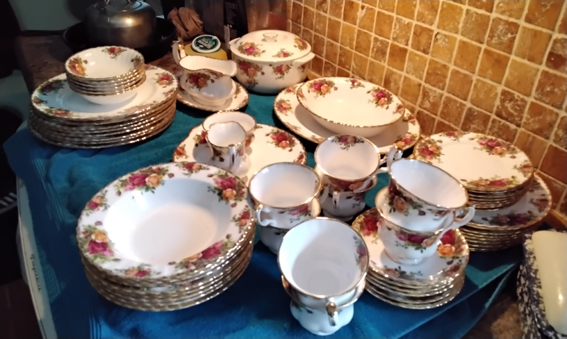 Royal Albert Bone China "Old Country Roses " Set for 8 x 7 Plus Service Pieces Asking $990.00 now Reduced and Firm $688.80 All sramped Made in England and in Excellent Like New Condition 63 Pieces Included are: 8 x Dinner Plates 8 x Salad Plates 8 x Bread and Butter Plates 8 x Tea Cups 8 x Tea Saucers 6 x Fruit Nappies -ONLY 6! 8 x Rimmed Soup Bowls 1 x Creamer 1 x Sugar Dish 1 x Gravy Boat 1 x Underdish for Gravy Boat 1 x 2 Handled Cake Plate 1 x Meat Platter 1 x Oval Veggie Dish 1 x Covered Baking Dish. Please Pickup Clarkson Area Mississauga or I can Deliver Free. Accepting Cash or Etransfer Only Please Willing to Ship at Buyers Expense Please TAKE time to view my other Ads for more Collectibles and China Sets