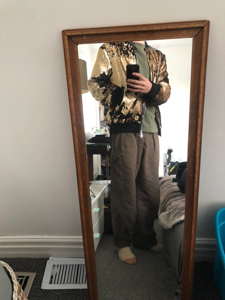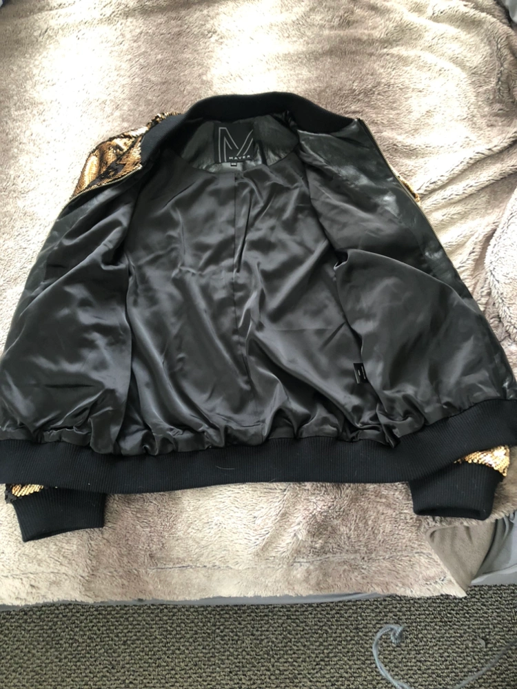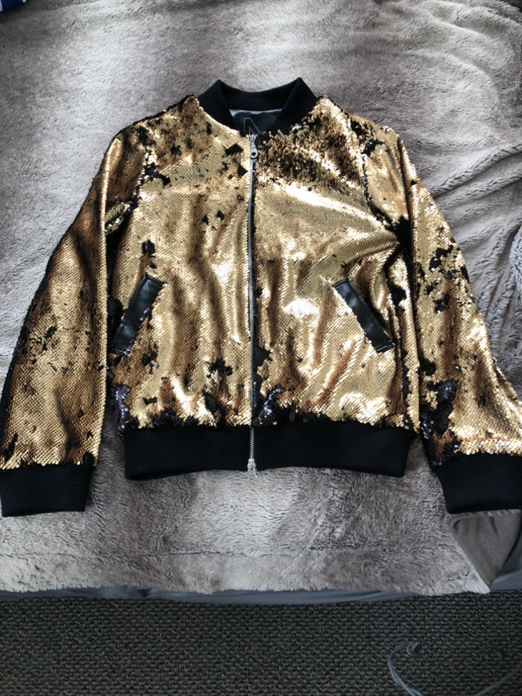 Fun disco jacket with gold sequins and faux leather detailing. It’s in really good shape, basically brand new. It’s also pretty thick so actually functions well as a jacket to keep warm.