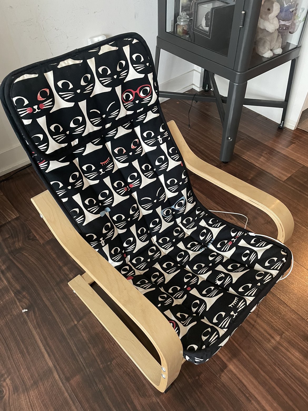 Small chair for kids with cat printed and black in colour . Giving away because I no more need this. Pickup only. First come to be served first.