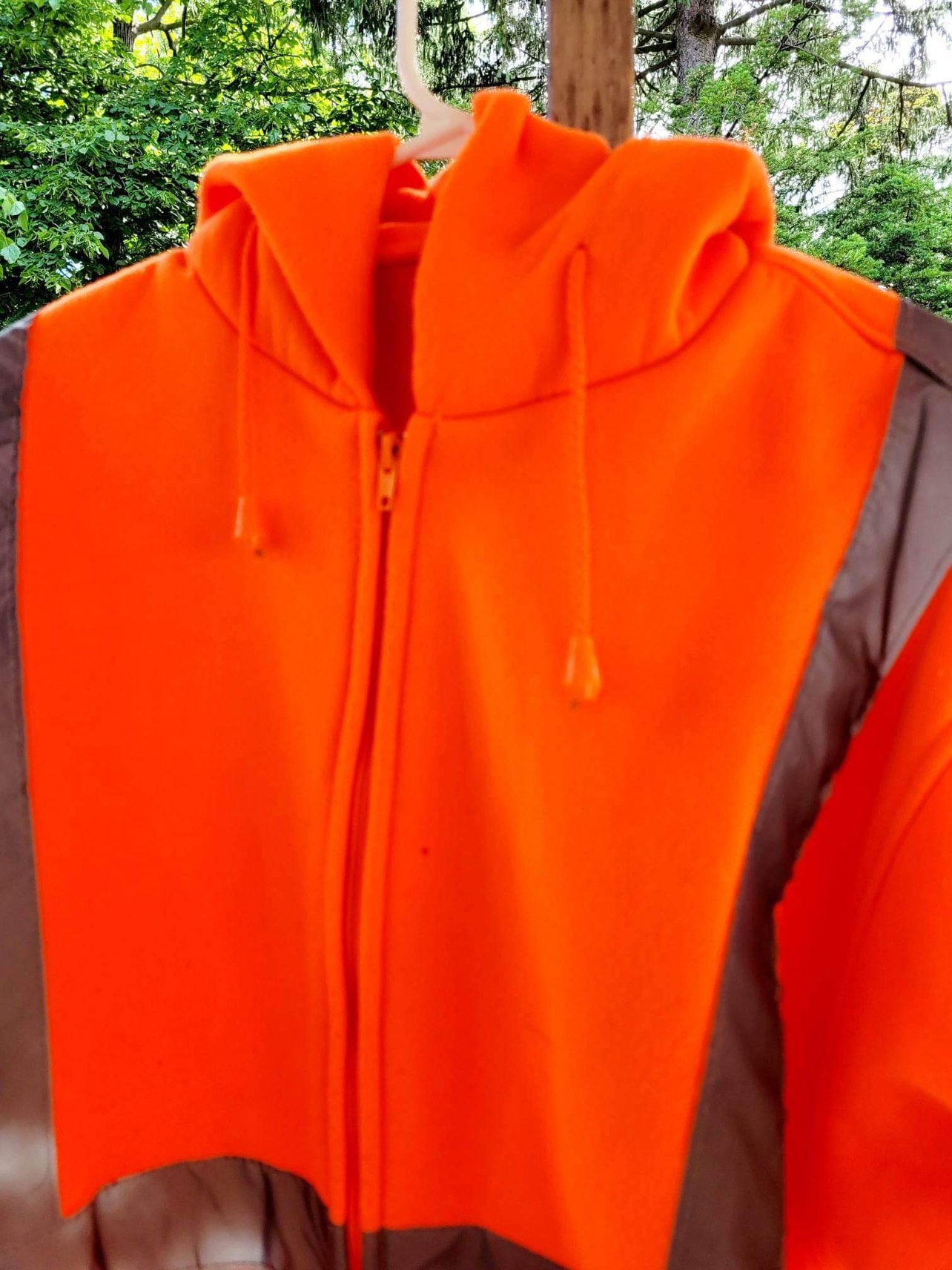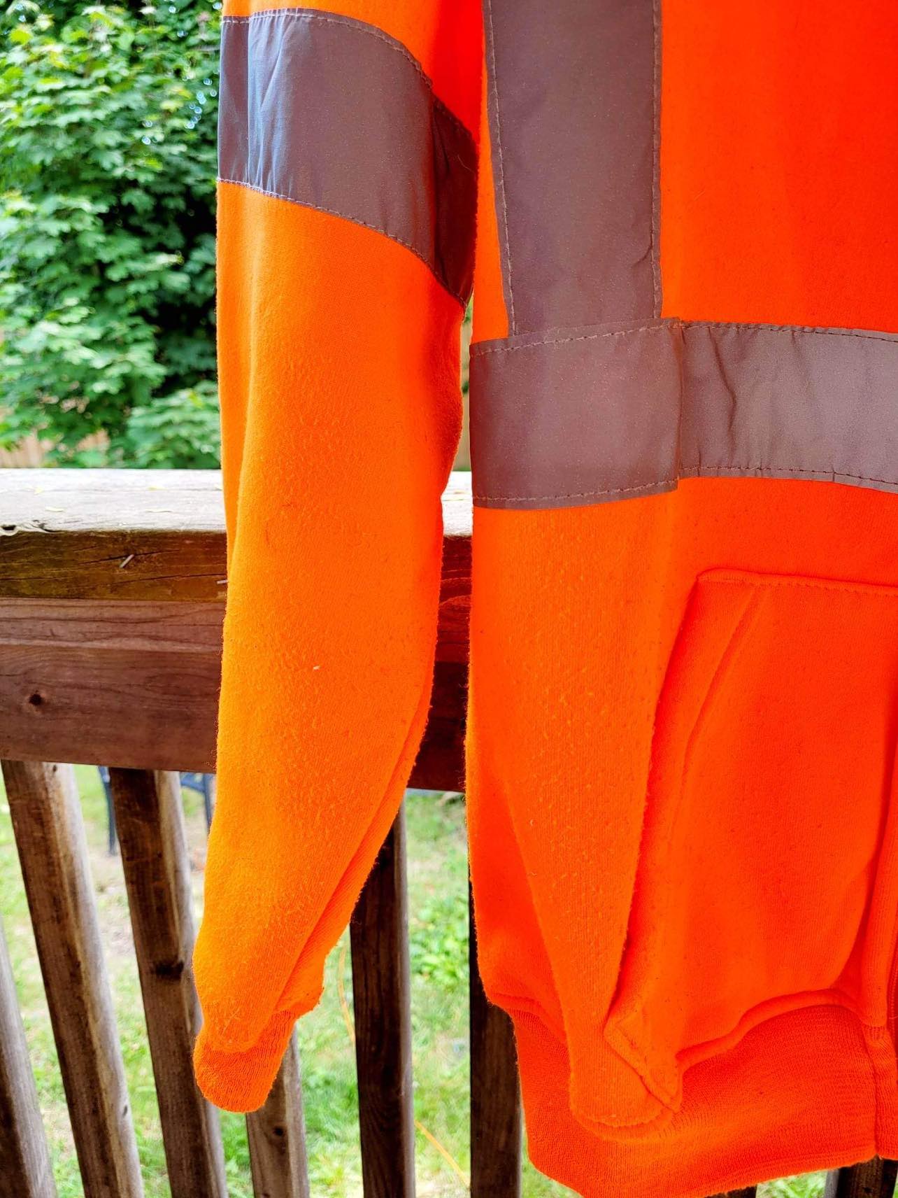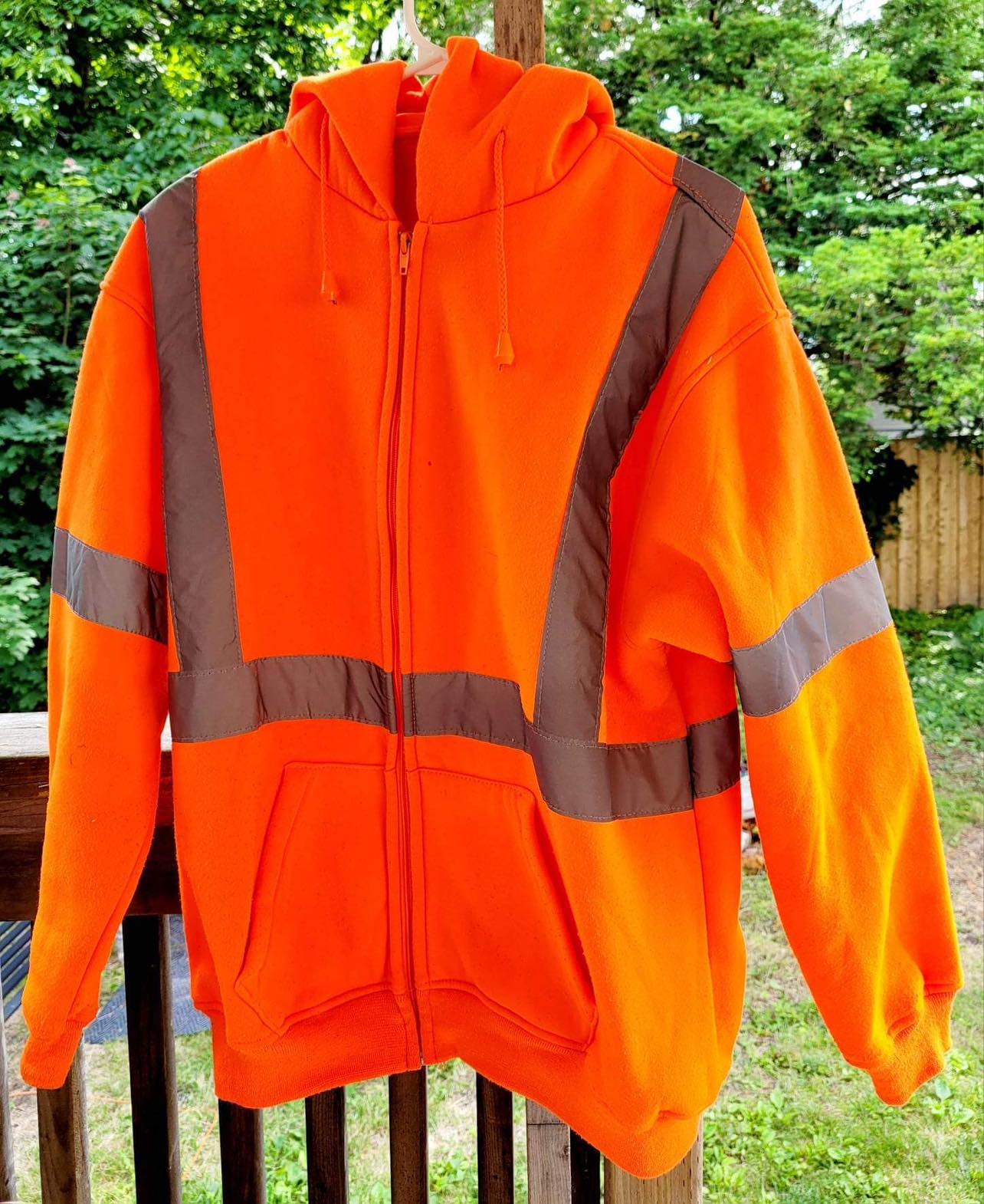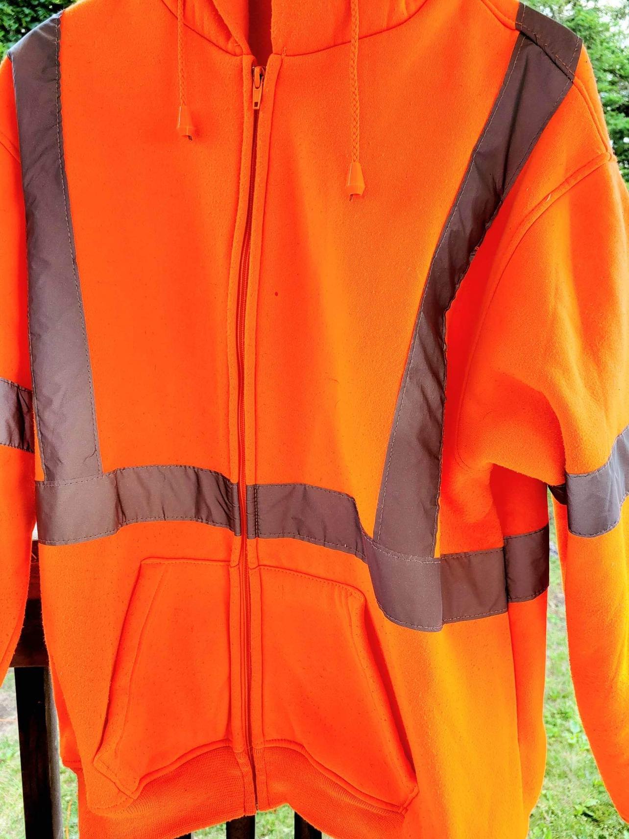 Safety vest, with zipper & drawstring hoodie, 2 pockets in front. Reflective Marking(X) on back of Vest. Used for a few months of work, have non-use for it any more. Porch Pick Up.